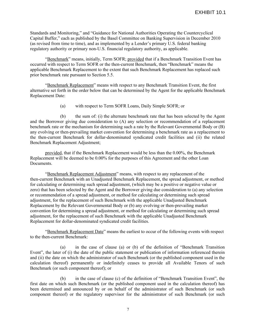 Standards and Monitoring,” and “Guidance for National Authorities Operating the Countercyclical Capital Buffer,” each as published by the Basel Committee on Banking Supervision in December 2010 (as revised from time to time), and as implemented by a Lender’s primary U.S. federal banking regulatory authority or primary non-U.S. financial regulatory authority, as applicable. “Benchmark” means, initially, Term SOFR; provided that if a Benchmark Transition Event has occurred with respect to Term SOFR or the then-current Benchmark, then “Benchmark” means the applicable Benchmark Replacement to the extent that such Benchmark Replacement has replaced such prior benchmark rate pursuant to Section 5.5. “Benchmark Replacement” means with respect to any Benchmark Transition Event, the first alternative set forth in the order below that can be determined by the Agent for the applicable Benchmark Replacement Date: (a) with respect to Term SOFR Loans, Daily Simple SOFR; or (b) the sum of: (i) the alternate benchmark rate that has been selected by the Agent and the Borrower giving due consideration to (A) any selection or recommendation of a replacement benchmark rate or the mechanism for determining such a rate by the Relevant Governmental Body or (B) any evolving or then-prevailing market convention for determining a benchmark rate as a replacement to the then-current Benchmark for dollar-denominated syndicated credit facilities and (ii) the related Benchmark Replacement Adjustment; provided, that if the Benchmark Replacement would be less than the 0.00%, the Benchmark Replacement will be deemed to be 0.00% for the purposes of this Agreement and the other Loan Documents. “Benchmark Replacement Adjustment” means, with respect to any replacement of the then-current Benchmark with an Unadjusted Benchmark Replacement, the spread adjustment, or method for calculating or determining such spread adjustment, (which may be a positive or negative value or zero) that has been selected by the Agent and the Borrower giving due consideration to (a) any selection or recommendation of a spread adjustment, or method for calculating or determining such spread adjustment, for the replacement of such Benchmark with the applicable Unadjusted Benchmark Replacement by the Relevant Governmental Body or (b) any evolving or then-prevailing market convention for determining a spread adjustment, or method for calculating or determining such spread adjustment, for the replacement of such Benchmark with the applicable Unadjusted Benchmark Replacement for dollar-denominated syndicated credit facilities. “Benchmark Replacement Date” means the earliest to occur of the following events with respect to the then-current Benchmark: (a) in the case of clause (a) or (b) of the definition of “Benchmark Transition Event”, the later of (i) the date of the public statement or publication of information referenced therein and (ii) the date on which the administrator of such Benchmark (or the published component used in the calculation thereof) permanently or indefinitely ceases to provide all Available Tenors of such Benchmark (or such component thereof); or (b) in the case of clause (c) of the definition of “Benchmark Transition Event”, the first date on which such Benchmark (or the published component used in the calculation thereof) has been determined and announced by or on behalf of the administrator of such Benchmark (or such component thereof) or the regulatory supervisor for the administrator of such Benchmark (or such 7 EXHIBIT 10.1