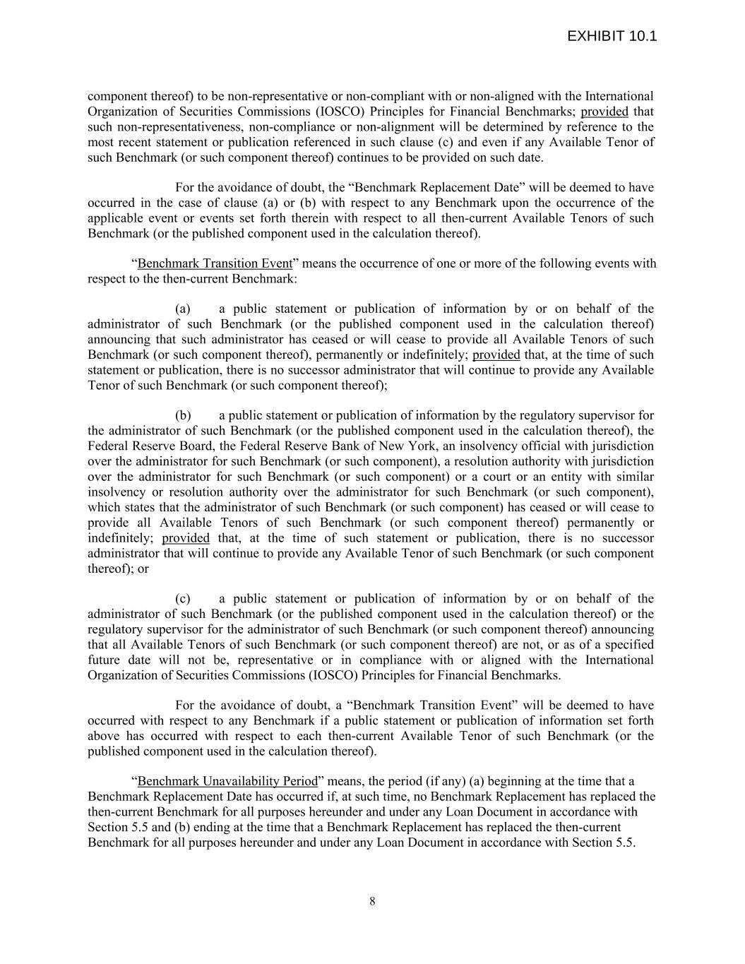 component thereof) to be non-representative or non-compliant with or non-aligned with the International Organization of Securities Commissions (IOSCO) Principles for Financial Benchmarks; provided that such non-representativeness, non-compliance or non-alignment will be determined by reference to the most recent statement or publication referenced in such clause (c) and even if any Available Tenor of such Benchmark (or such component thereof) continues to be provided on such date. For the avoidance of doubt, the “Benchmark Replacement Date” will be deemed to have occurred in the case of clause (a) or (b) with respect to any Benchmark upon the occurrence of the applicable event or events set forth therein with respect to all then-current Available Tenors of such Benchmark (or the published component used in the calculation thereof). “Benchmark Transition Event” means the occurrence of one or more of the following events with respect to the then-current Benchmark: (a) a public statement or publication of information by or on behalf of the administrator of such Benchmark (or the published component used in the calculation thereof) announcing that such administrator has ceased or will cease to provide all Available Tenors of such Benchmark (or such component thereof), permanently or indefinitely; provided that, at the time of such statement or publication, there is no successor administrator that will continue to provide any Available Tenor of such Benchmark (or such component thereof); (b) a public statement or publication of information by the regulatory supervisor for the administrator of such Benchmark (or the published component used in the calculation thereof), the Federal Reserve Board, the Federal Reserve Bank of New York, an insolvency official with jurisdiction over the administrator for such Benchmark (or such component), a resolution authority with jurisdiction over the administrator for such Benchmark (or such component) or a court or an entity with similar insolvency or resolution authority over the administrator for such Benchmark (or such component), which states that the administrator of such Benchmark (or such component) has ceased or will cease to provide all Available Tenors of such Benchmark (or such component thereof) permanently or indefinitely; provided that, at the time of such statement or publication, there is no successor administrator that will continue to provide any Available Tenor of such Benchmark (or such component thereof); or (c) a public statement or publication of information by or on behalf of the administrator of such Benchmark (or the published component used in the calculation thereof) or the regulatory supervisor for the administrator of such Benchmark (or such component thereof) announcing that all Available Tenors of such Benchmark (or such component thereof) are not, or as of a specified future date will not be, representative or in compliance with or aligned with the International Organization of Securities Commissions (IOSCO) Principles for Financial Benchmarks. For the avoidance of doubt, a “Benchmark Transition Event” will be deemed to have occurred with respect to any Benchmark if a public statement or publication of information set forth above has occurred with respect to each then-current Available Tenor of such Benchmark (or the published component used in the calculation thereof). “Benchmark Unavailability Period” means, the period (if any) (a) beginning at the time that a Benchmark Replacement Date has occurred if, at such time, no Benchmark Replacement has replaced the then-current Benchmark for all purposes hereunder and under any Loan Document in accordance with Section 5.5 and (b) ending at the time that a Benchmark Replacement has replaced the then-current Benchmark for all purposes hereunder and under any Loan Document in accordance with Section 5.5. 8 EXHIBIT 10.1