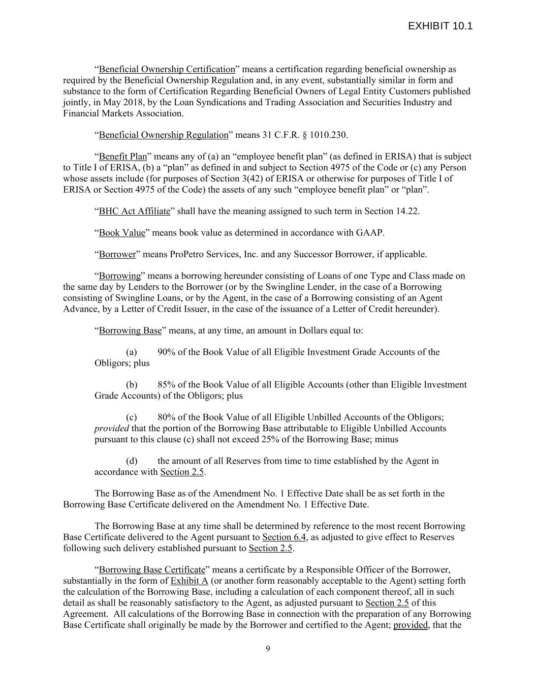 “Beneficial Ownership Certification” means a certification regarding beneficial ownership as required by the Beneficial Ownership Regulation and, in any event, substantially similar in form and substance to the form of Certification Regarding Beneficial Owners of Legal Entity Customers published jointly, in May 2018, by the Loan Syndications and Trading Association and Securities Industry and Financial Markets Association. “Beneficial Ownership Regulation” means 31 C.F.R. § 1010.230. “Benefit Plan” means any of (a) an “employee benefit plan” (as defined in ERISA) that is subject to Title I of ERISA, (b) a “plan” as defined in and subject to Section 4975 of the Code or (c) any Person whose assets include (for purposes of Section 3(42) of ERISA or otherwise for purposes of Title I of ERISA or Section 4975 of the Code) the assets of any such “employee benefit plan” or “plan”. “BHC Act Affiliate” shall have the meaning assigned to such term in Section 14.22. “Book Value” means book value as determined in accordance with GAAP. “Borrower” means ProPetro Services, Inc. and any Successor Borrower, if applicable. “Borrowing” means a borrowing hereunder consisting of Loans of one Type and Class made on the same day by Lenders to the Borrower (or by the Swingline Lender, in the case of a Borrowing consisting of Swingline Loans, or by the Agent, in the case of a Borrowing consisting of an Agent Advance, by a Letter of Credit Issuer, in the case of the issuance of a Letter of Credit hereunder). “Borrowing Base” means, at any time, an amount in Dollars equal to: (a) 90% of the Book Value of all Eligible Investment Grade Accounts of the Obligors; plus (b) 85% of the Book Value of all Eligible Accounts (other than Eligible Investment Grade Accounts) of the Obligors; plus (c) 80% of the Book Value of all Eligible Unbilled Accounts of the Obligors; provided that the portion of the Borrowing Base attributable to Eligible Unbilled Accounts pursuant to this clause (c) shall not exceed 25% of the Borrowing Base; minus (d) the amount of all Reserves from time to time established by the Agent in accordance with Section 2.5. The Borrowing Base as of the Amendment No. 1 Effective Date shall be as set forth in the Borrowing Base Certificate delivered on the Amendment No. 1 Effective Date. The Borrowing Base at any time shall be determined by reference to the most recent Borrowing Base Certificate delivered to the Agent pursuant to Section 6.4, as adjusted to give effect to Reserves following such delivery established pursuant to Section 2.5. “Borrowing Base Certificate” means a certificate by a Responsible Officer of the Borrower, substantially in the form of Exhibit A (or another form reasonably acceptable to the Agent) setting forth the calculation of the Borrowing Base, including a calculation of each component thereof, all in such detail as shall be reasonably satisfactory to the Agent, as adjusted pursuant to Section 2.5 of this Agreement. All calculations of the Borrowing Base in connection with the preparation of any Borrowing Base Certificate shall originally be made by the Borrower and certified to the Agent; provided, that the 9 EXHIBIT 10.1