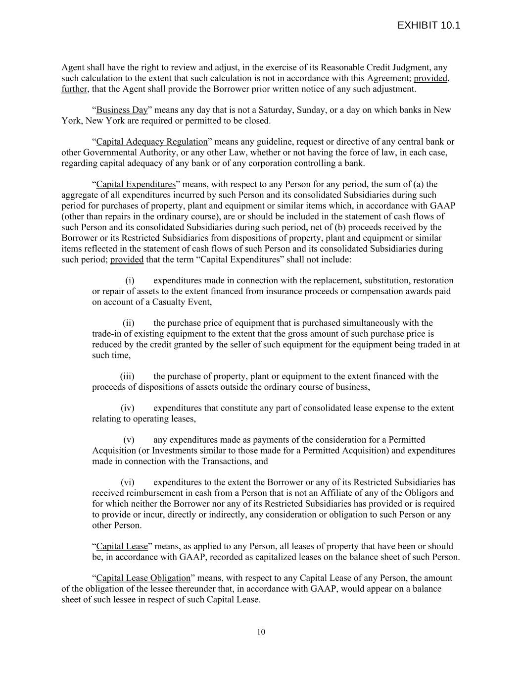 Agent shall have the right to review and adjust, in the exercise of its Reasonable Credit Judgment, any such calculation to the extent that such calculation is not in accordance with this Agreement; provided, further, that the Agent shall provide the Borrower prior written notice of any such adjustment. “Business Day” means any day that is not a Saturday, Sunday, or a day on which banks in New York, New York are required or permitted to be closed. “Capital Adequacy Regulation” means any guideline, request or directive of any central bank or other Governmental Authority, or any other Law, whether or not having the force of law, in each case, regarding capital adequacy of any bank or of any corporation controlling a bank. “Capital Expenditures” means, with respect to any Person for any period, the sum of (a) the aggregate of all expenditures incurred by such Person and its consolidated Subsidiaries during such period for purchases of property, plant and equipment or similar items which, in accordance with GAAP (other than repairs in the ordinary course), are or should be included in the statement of cash flows of such Person and its consolidated Subsidiaries during such period, net of (b) proceeds received by the Borrower or its Restricted Subsidiaries from dispositions of property, plant and equipment or similar items reflected in the statement of cash flows of such Person and its consolidated Subsidiaries during such period; provided that the term “Capital Expenditures” shall not include: (i) expenditures made in connection with the replacement, substitution, restoration or repair of assets to the extent financed from insurance proceeds or compensation awards paid on account of a Casualty Event, (ii) the purchase price of equipment that is purchased simultaneously with the trade-in of existing equipment to the extent that the gross amount of such purchase price is reduced by the credit granted by the seller of such equipment for the equipment being traded in at such time, (iii) the purchase of property, plant or equipment to the extent financed with the proceeds of dispositions of assets outside the ordinary course of business, (iv) expenditures that constitute any part of consolidated lease expense to the extent relating to operating leases, (v) any expenditures made as payments of the consideration for a Permitted Acquisition (or Investments similar to those made for a Permitted Acquisition) and expenditures made in connection with the Transactions, and (vi) expenditures to the extent the Borrower or any of its Restricted Subsidiaries has received reimbursement in cash from a Person that is not an Affiliate of any of the Obligors and for which neither the Borrower nor any of its Restricted Subsidiaries has provided or is required to provide or incur, directly or indirectly, any consideration or obligation to such Person or any other Person. “Capital Lease” means, as applied to any Person, all leases of property that have been or should be, in accordance with GAAP, recorded as capitalized leases on the balance sheet of such Person. “Capital Lease Obligation” means, with respect to any Capital Lease of any Person, the amount of the obligation of the lessee thereunder that, in accordance with GAAP, would appear on a balance sheet of such lessee in respect of such Capital Lease. 10 EXHIBIT 10.1