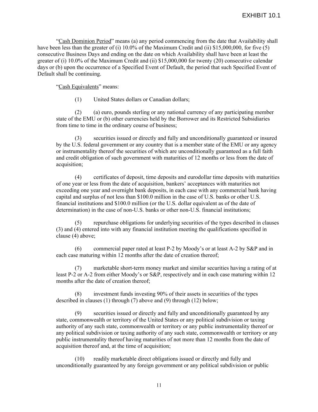 “Cash Dominion Period” means (a) any period commencing from the date that Availability shall have been less than the greater of (i) 10.0% of the Maximum Credit and (ii) $15,000,000, for five (5) consecutive Business Days and ending on the date on which Availability shall have been at least the greater of (i) 10.0% of the Maximum Credit and (ii) $15,000,000 for twenty (20) consecutive calendar days or (b) upon the occurrence of a Specified Event of Default, the period that such Specified Event of Default shall be continuing. “Cash Equivalents” means: (1) United States dollars or Canadian dollars; (2) (a) euro, pounds sterling or any national currency of any participating member state of the EMU or (b) other currencies held by the Borrower and its Restricted Subsidiaries from time to time in the ordinary course of business; (3) securities issued or directly and fully and unconditionally guaranteed or insured by the U.S. federal government or any country that is a member state of the EMU or any agency or instrumentality thereof the securities of which are unconditionally guaranteed as a full faith and credit obligation of such government with maturities of 12 months or less from the date of acquisition; (4) certificates of deposit, time deposits and eurodollar time deposits with maturities of one year or less from the date of acquisition, bankers’ acceptances with maturities not exceeding one year and overnight bank deposits, in each case with any commercial bank having capital and surplus of not less than $100.0 million in the case of U.S. banks or other U.S. financial institutions and $100.0 million (or the U.S. dollar equivalent as of the date of determination) in the case of non-U.S. banks or other non-U.S. financial institutions; (5) repurchase obligations for underlying securities of the types described in clauses (3) and (4) entered into with any financial institution meeting the qualifications specified in clause (4) above; (6) commercial paper rated at least P-2 by Moody’s or at least A-2 by S&P and in each case maturing within 12 months after the date of creation thereof; (7) marketable short-term money market and similar securities having a rating of at least P-2 or A-2 from either Moody’s or S&P, respectively and in each case maturing within 12 months after the date of creation thereof; (8) investment funds investing 90% of their assets in securities of the types described in clauses (1) through (7) above and (9) through (12) below; (9) securities issued or directly and fully and unconditionally guaranteed by any state, commonwealth or territory of the United States or any political subdivision or taxing authority of any such state, commonwealth or territory or any public instrumentality thereof or any political subdivision or taxing authority of any such state, commonwealth or territory or any public instrumentality thereof having maturities of not more than 12 months from the date of acquisition thereof and, at the time of acquisition; (10) readily marketable direct obligations issued or directly and fully and unconditionally guaranteed by any foreign government or any political subdivision or public 11 EXHIBIT 10.1