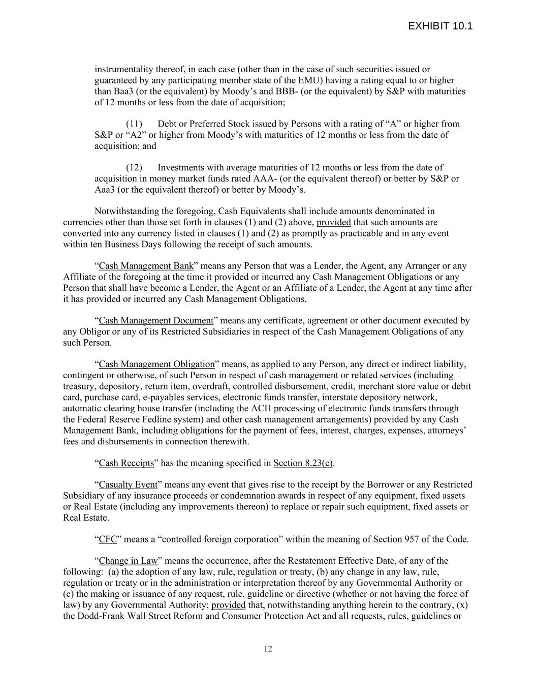 instrumentality thereof, in each case (other than in the case of such securities issued or guaranteed by any participating member state of the EMU) having a rating equal to or higher than Baa3 (or the equivalent) by Moody’s and BBB- (or the equivalent) by S&P with maturities of 12 months or less from the date of acquisition; (11) Debt or Preferred Stock issued by Persons with a rating of “A” or higher from S&P or “A2” or higher from Moody’s with maturities of 12 months or less from the date of acquisition; and (12) Investments with average maturities of 12 months or less from the date of acquisition in money market funds rated AAA- (or the equivalent thereof) or better by S&P or Aaa3 (or the equivalent thereof) or better by Moody’s. Notwithstanding the foregoing, Cash Equivalents shall include amounts denominated in currencies other than those set forth in clauses (1) and (2) above, provided that such amounts are converted into any currency listed in clauses (1) and (2) as promptly as practicable and in any event within ten Business Days following the receipt of such amounts. “Cash Management Bank” means any Person that was a Lender, the Agent, any Arranger or any Affiliate of the foregoing at the time it provided or incurred any Cash Management Obligations or any Person that shall have become a Lender, the Agent or an Affiliate of a Lender, the Agent at any time after it has provided or incurred any Cash Management Obligations. “Cash Management Document” means any certificate, agreement or other document executed by any Obligor or any of its Restricted Subsidiaries in respect of the Cash Management Obligations of any such Person. “Cash Management Obligation” means, as applied to any Person, any direct or indirect liability, contingent or otherwise, of such Person in respect of cash management or related services (including treasury, depository, return item, overdraft, controlled disbursement, credit, merchant store value or debit card, purchase card, e-payables services, electronic funds transfer, interstate depository network, automatic clearing house transfer (including the ACH processing of electronic funds transfers through the Federal Reserve Fedline system) and other cash management arrangements) provided by any Cash Management Bank, including obligations for the payment of fees, interest, charges, expenses, attorneys’ fees and disbursements in connection therewith. “Cash Receipts” has the meaning specified in Section 8.23(c). “Casualty Event” means any event that gives rise to the receipt by the Borrower or any Restricted Subsidiary of any insurance proceeds or condemnation awards in respect of any equipment, fixed assets or Real Estate (including any improvements thereon) to replace or repair such equipment, fixed assets or Real Estate. “CFC” means a “controlled foreign corporation” within the meaning of Section 957 of the Code. “Change in Law” means the occurrence, after the Restatement Effective Date, of any of the following: (a) the adoption of any law, rule, regulation or treaty, (b) any change in any law, rule, regulation or treaty or in the administration or interpretation thereof by any Governmental Authority or (c) the making or issuance of any request, rule, guideline or directive (whether or not having the force of law) by any Governmental Authority; provided that, notwithstanding anything herein to the contrary, (x) the Dodd-Frank Wall Street Reform and Consumer Protection Act and all requests, rules, guidelines or 12 EXHIBIT 10.1