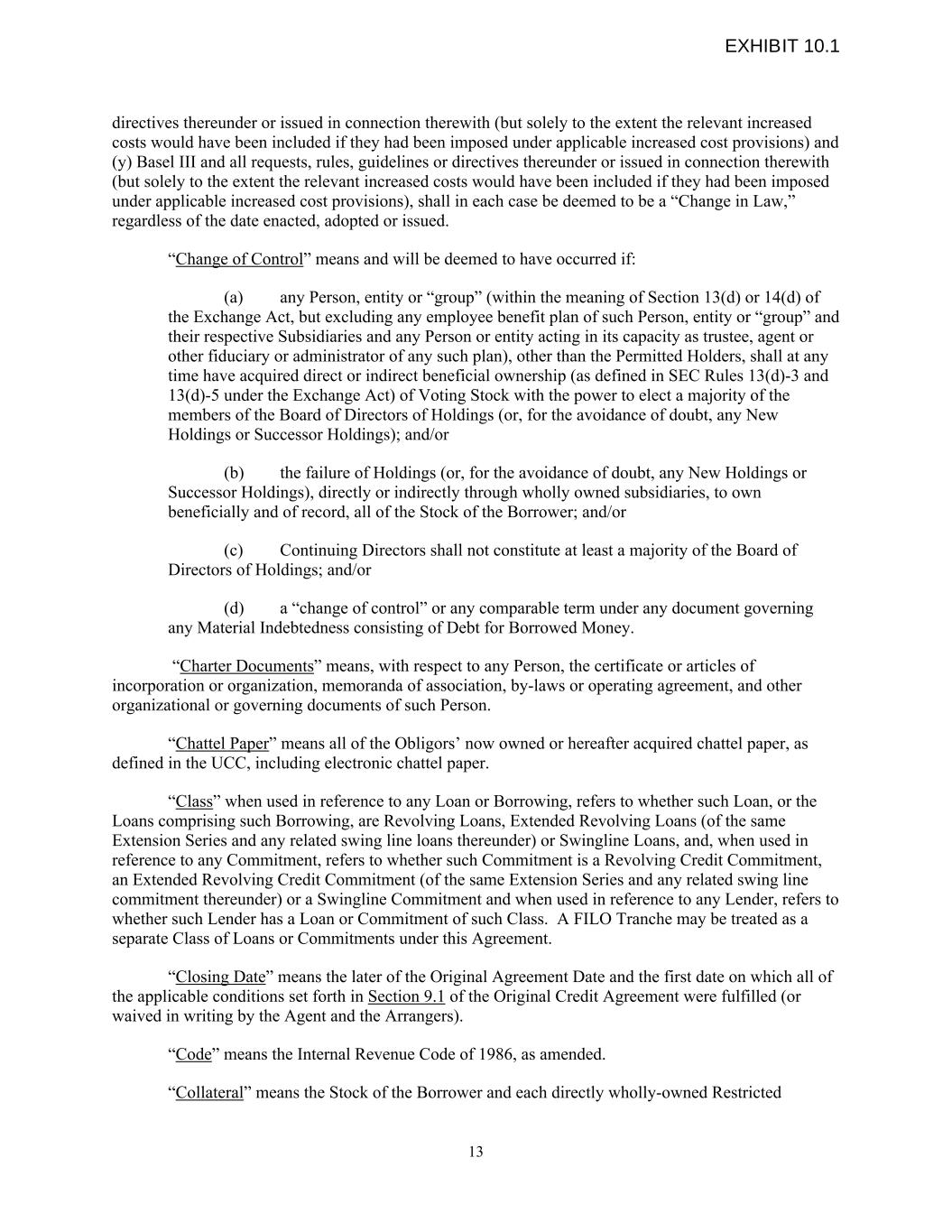 directives thereunder or issued in connection therewith (but solely to the extent the relevant increased costs would have been included if they had been imposed under applicable increased cost provisions) and (y) Basel III and all requests, rules, guidelines or directives thereunder or issued in connection therewith (but solely to the extent the relevant increased costs would have been included if they had been imposed under applicable increased cost provisions), shall in each case be deemed to be a “Change in Law,” regardless of the date enacted, adopted or issued. “Change of Control” means and will be deemed to have occurred if: (a) any Person, entity or “group” (within the meaning of Section 13(d) or 14(d) of the Exchange Act, but excluding any employee benefit plan of such Person, entity or “group” and their respective Subsidiaries and any Person or entity acting in its capacity as trustee, agent or other fiduciary or administrator of any such plan), other than the Permitted Holders, shall at any time have acquired direct or indirect beneficial ownership (as defined in SEC Rules 13(d)-3 and 13(d)-5 under the Exchange Act) of Voting Stock with the power to elect a majority of the members of the Board of Directors of Holdings (or, for the avoidance of doubt, any New Holdings or Successor Holdings); and/or (b) the failure of Holdings (or, for the avoidance of doubt, any New Holdings or Successor Holdings), directly or indirectly through wholly owned subsidiaries, to own beneficially and of record, all of the Stock of the Borrower; and/or (c) Continuing Directors shall not constitute at least a majority of the Board of Directors of Holdings; and/or (d) a “change of control” or any comparable term under any document governing any Material Indebtedness consisting of Debt for Borrowed Money. “Charter Documents” means, with respect to any Person, the certificate or articles of incorporation or organization, memoranda of association, by-laws or operating agreement, and other organizational or governing documents of such Person. “Chattel Paper” means all of the Obligors’ now owned or hereafter acquired chattel paper, as defined in the UCC, including electronic chattel paper. “Class” when used in reference to any Loan or Borrowing, refers to whether such Loan, or the Loans comprising such Borrowing, are Revolving Loans, Extended Revolving Loans (of the same Extension Series and any related swing line loans thereunder) or Swingline Loans, and, when used in reference to any Commitment, refers to whether such Commitment is a Revolving Credit Commitment, an Extended Revolving Credit Commitment (of the same Extension Series and any related swing line commitment thereunder) or a Swingline Commitment and when used in reference to any Lender, refers to whether such Lender has a Loan or Commitment of such Class. A FILO Tranche may be treated as a separate Class of Loans or Commitments under this Agreement. “Closing Date” means the later of the Original Agreement Date and the first date on which all of the applicable conditions set forth in Section 9.1 of the Original Credit Agreement were fulfilled (or waived in writing by the Agent and the Arrangers). “Code” means the Internal Revenue Code of 1986, as amended. “Collateral” means the Stock of the Borrower and each directly wholly-owned Restricted 13 EXHIBIT 10.1