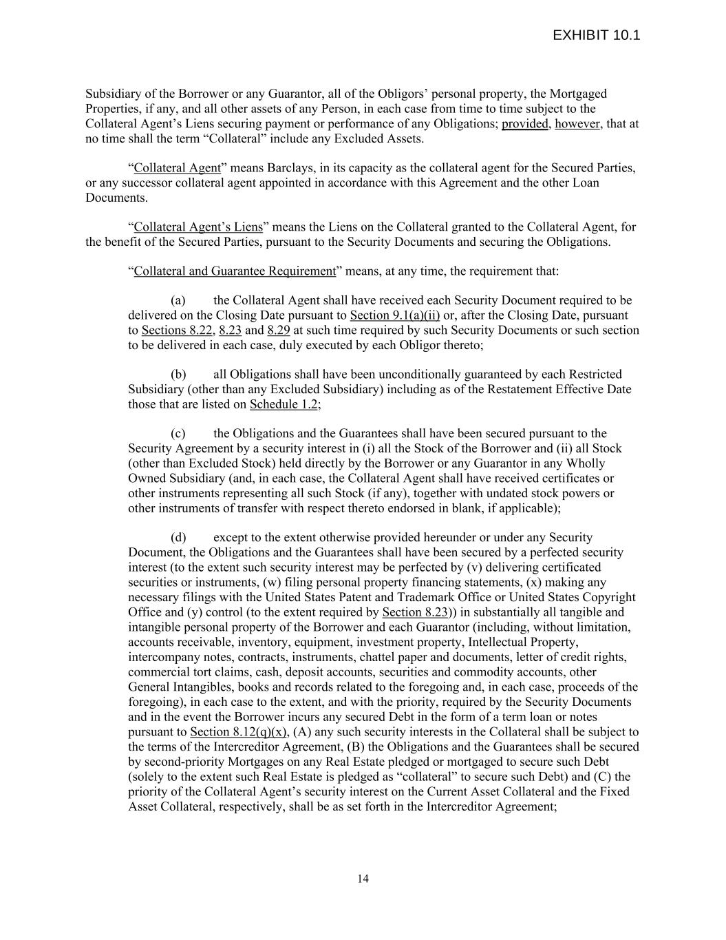 Subsidiary of the Borrower or any Guarantor, all of the Obligors’ personal property, the Mortgaged Properties, if any, and all other assets of any Person, in each case from time to time subject to the Collateral Agent’s Liens securing payment or performance of any Obligations; provided, however, that at no time shall the term “Collateral” include any Excluded Assets. “Collateral Agent” means Barclays, in its capacity as the collateral agent for the Secured Parties, or any successor collateral agent appointed in accordance with this Agreement and the other Loan Documents. “Collateral Agent’s Liens” means the Liens on the Collateral granted to the Collateral Agent, for the benefit of the Secured Parties, pursuant to the Security Documents and securing the Obligations. “Collateral and Guarantee Requirement” means, at any time, the requirement that: (a) the Collateral Agent shall have received each Security Document required to be delivered on the Closing Date pursuant to Section 9.1(a)(ii) or, after the Closing Date, pursuant to Sections 8.22, 8.23 and 8.29 at such time required by such Security Documents or such section to be delivered in each case, duly executed by each Obligor thereto; (b) all Obligations shall have been unconditionally guaranteed by each Restricted Subsidiary (other than any Excluded Subsidiary) including as of the Restatement Effective Date those that are listed on Schedule 1.2; (c) the Obligations and the Guarantees shall have been secured pursuant to the Security Agreement by a security interest in (i) all the Stock of the Borrower and (ii) all Stock (other than Excluded Stock) held directly by the Borrower or any Guarantor in any Wholly Owned Subsidiary (and, in each case, the Collateral Agent shall have received certificates or other instruments representing all such Stock (if any), together with undated stock powers or other instruments of transfer with respect thereto endorsed in blank, if applicable); (d) except to the extent otherwise provided hereunder or under any Security Document, the Obligations and the Guarantees shall have been secured by a perfected security interest (to the extent such security interest may be perfected by (v) delivering certificated securities or instruments, (w) filing personal property financing statements, (x) making any necessary filings with the United States Patent and Trademark Office or United States Copyright Office and (y) control (to the extent required by Section 8.23)) in substantially all tangible and intangible personal property of the Borrower and each Guarantor (including, without limitation, accounts receivable, inventory, equipment, investment property, Intellectual Property, intercompany notes, contracts, instruments, chattel paper and documents, letter of credit rights, commercial tort claims, cash, deposit accounts, securities and commodity accounts, other General Intangibles, books and records related to the foregoing and, in each case, proceeds of the foregoing), in each case to the extent, and with the priority, required by the Security Documents and in the event the Borrower incurs any secured Debt in the form of a term loan or notes pursuant to Section 8.12(q)(x), (A) any such security interests in the Collateral shall be subject to the terms of the Intercreditor Agreement, (B) the Obligations and the Guarantees shall be secured by second-priority Mortgages on any Real Estate pledged or mortgaged to secure such Debt (solely to the extent such Real Estate is pledged as “collateral” to secure such Debt) and (C) the priority of the Collateral Agent’s security interest on the Current Asset Collateral and the Fixed Asset Collateral, respectively, shall be as set forth in the Intercreditor Agreement; 14 EXHIBIT 10.1