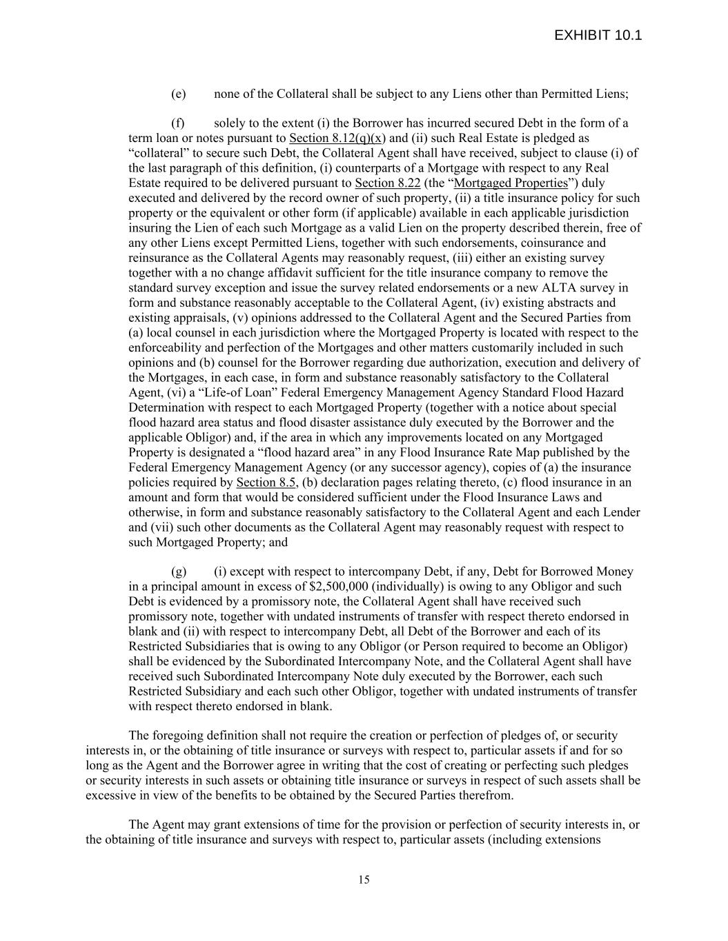 (e) none of the Collateral shall be subject to any Liens other than Permitted Liens; (f) solely to the extent (i) the Borrower has incurred secured Debt in the form of a term loan or notes pursuant to Section 8.12(q)(x) and (ii) such Real Estate is pledged as “collateral” to secure such Debt, the Collateral Agent shall have received, subject to clause (i) of the last paragraph of this definition, (i) counterparts of a Mortgage with respect to any Real Estate required to be delivered pursuant to Section 8.22 (the “Mortgaged Properties”) duly executed and delivered by the record owner of such property, (ii) a title insurance policy for such property or the equivalent or other form (if applicable) available in each applicable jurisdiction insuring the Lien of each such Mortgage as a valid Lien on the property described therein, free of any other Liens except Permitted Liens, together with such endorsements, coinsurance and reinsurance as the Collateral Agents may reasonably request, (iii) either an existing survey together with a no change affidavit sufficient for the title insurance company to remove the standard survey exception and issue the survey related endorsements or a new ALTA survey in form and substance reasonably acceptable to the Collateral Agent, (iv) existing abstracts and existing appraisals, (v) opinions addressed to the Collateral Agent and the Secured Parties from (a) local counsel in each jurisdiction where the Mortgaged Property is located with respect to the enforceability and perfection of the Mortgages and other matters customarily included in such opinions and (b) counsel for the Borrower regarding due authorization, execution and delivery of the Mortgages, in each case, in form and substance reasonably satisfactory to the Collateral Agent, (vi) a “Life-of Loan” Federal Emergency Management Agency Standard Flood Hazard Determination with respect to each Mortgaged Property (together with a notice about special flood hazard area status and flood disaster assistance duly executed by the Borrower and the applicable Obligor) and, if the area in which any improvements located on any Mortgaged Property is designated a “flood hazard area” in any Flood Insurance Rate Map published by the Federal Emergency Management Agency (or any successor agency), copies of (a) the insurance policies required by Section 8.5, (b) declaration pages relating thereto, (c) flood insurance in an amount and form that would be considered sufficient under the Flood Insurance Laws and otherwise, in form and substance reasonably satisfactory to the Collateral Agent and each Lender and (vii) such other documents as the Collateral Agent may reasonably request with respect to such Mortgaged Property; and (g) (i) except with respect to intercompany Debt, if any, Debt for Borrowed Money in a principal amount in excess of $2,500,000 (individually) is owing to any Obligor and such Debt is evidenced by a promissory note, the Collateral Agent shall have received such promissory note, together with undated instruments of transfer with respect thereto endorsed in blank and (ii) with respect to intercompany Debt, all Debt of the Borrower and each of its Restricted Subsidiaries that is owing to any Obligor (or Person required to become an Obligor) shall be evidenced by the Subordinated Intercompany Note, and the Collateral Agent shall have received such Subordinated Intercompany Note duly executed by the Borrower, each such Restricted Subsidiary and each such other Obligor, together with undated instruments of transfer with respect thereto endorsed in blank. The foregoing definition shall not require the creation or perfection of pledges of, or security interests in, or the obtaining of title insurance or surveys with respect to, particular assets if and for so long as the Agent and the Borrower agree in writing that the cost of creating or perfecting such pledges or security interests in such assets or obtaining title insurance or surveys in respect of such assets shall be excessive in view of the benefits to be obtained by the Secured Parties therefrom. The Agent may grant extensions of time for the provision or perfection of security interests in, or the obtaining of title insurance and surveys with respect to, particular assets (including extensions 15 EXHIBIT 10.1