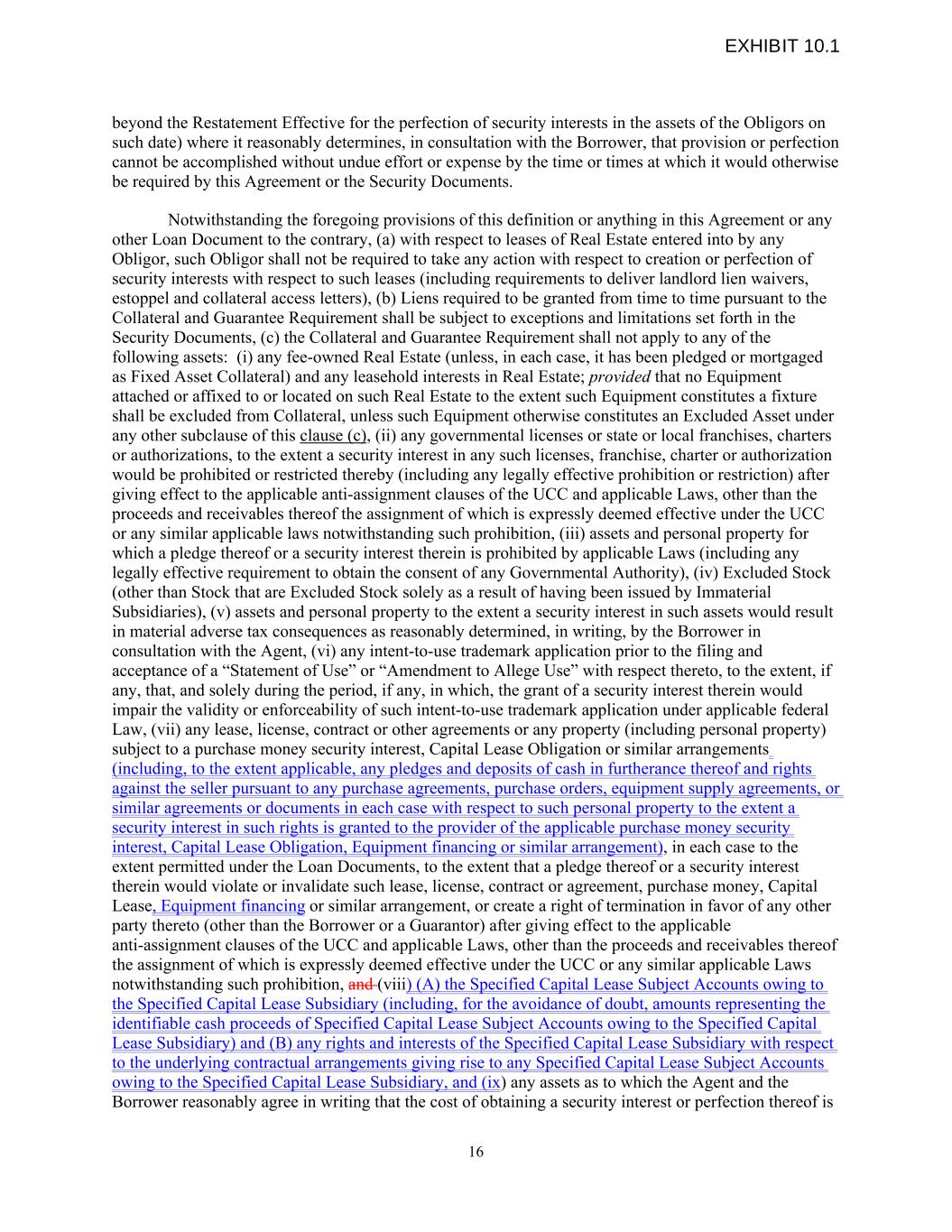 beyond the Restatement Effective for the perfection of security interests in the assets of the Obligors on such date) where it reasonably determines, in consultation with the Borrower, that provision or perfection cannot be accomplished without undue effort or expense by the time or times at which it would otherwise be required by this Agreement or the Security Documents. Notwithstanding the foregoing provisions of this definition or anything in this Agreement or any other Loan Document to the contrary, (a) with respect to leases of Real Estate entered into by any Obligor, such Obligor shall not be required to take any action with respect to creation or perfection of security interests with respect to such leases (including requirements to deliver landlord lien waivers, estoppel and collateral access letters), (b) Liens required to be granted from time to time pursuant to the Collateral and Guarantee Requirement shall be subject to exceptions and limitations set forth in the Security Documents, (c) the Collateral and Guarantee Requirement shall not apply to any of the following assets: (i) any fee-owned Real Estate (unless, in each case, it has been pledged or mortgaged as Fixed Asset Collateral) and any leasehold interests in Real Estate; provided that no Equipment attached or affixed to or located on such Real Estate to the extent such Equipment constitutes a fixture shall be excluded from Collateral, unless such Equipment otherwise constitutes an Excluded Asset under any other subclause of this clause (c), (ii) any governmental licenses or state or local franchises, charters or authorizations, to the extent a security interest in any such licenses, franchise, charter or authorization would be prohibited or restricted thereby (including any legally effective prohibition or restriction) after giving effect to the applicable anti-assignment clauses of the UCC and applicable Laws, other than the proceeds and receivables thereof the assignment of which is expressly deemed effective under the UCC or any similar applicable laws notwithstanding such prohibition, (iii) assets and personal property for which a pledge thereof or a security interest therein is prohibited by applicable Laws (including any legally effective requirement to obtain the consent of any Governmental Authority), (iv) Excluded Stock (other than Stock that are Excluded Stock solely as a result of having been issued by Immaterial Subsidiaries), (v) assets and personal property to the extent a security interest in such assets would result in material adverse tax consequences as reasonably determined, in writing, by the Borrower in consultation with the Agent, (vi) any intent-to-use trademark application prior to the filing and acceptance of a “Statement of Use” or “Amendment to Allege Use” with respect thereto, to the extent, if any, that, and solely during the period, if any, in which, the grant of a security interest therein would impair the validity or enforceability of such intent-to-use trademark application under applicable federal Law, (vii) any lease, license, contract or other agreements or any property (including personal property) subject to a purchase money security interest, Capital Lease Obligation or similar arrangements (including, to the extent applicable, any pledges and deposits of cash in furtherance thereof and rights against the seller pursuant to any purchase agreements, purchase orders, equipment supply agreements, or similar agreements or documents in each case with respect to such personal property to the extent a security interest in such rights is granted to the provider of the applicable purchase money security interest, Capital Lease Obligation, Equipment financing or similar arrangement), in each case to the extent permitted under the Loan Documents, to the extent that a pledge thereof or a security interest therein would violate or invalidate such lease, license, contract or agreement, purchase money, Capital Lease, Equipment financing or similar arrangement, or create a right of termination in favor of any other party thereto (other than the Borrower or a Guarantor) after giving effect to the applicable anti-assignment clauses of the UCC and applicable Laws, other than the proceeds and receivables thereof the assignment of which is expressly deemed effective under the UCC or any similar applicable Laws notwithstanding such prohibition, and (viii) (A) the Specified Capital Lease Subject Accounts owing to the Specified Capital Lease Subsidiary (including, for the avoidance of doubt, amounts representing the identifiable cash proceeds of Specified Capital Lease Subject Accounts owing to the Specified Capital Lease Subsidiary) and (B) any rights and interests of the Specified Capital Lease Subsidiary with respect to the underlying contractual arrangements giving rise to any Specified Capital Lease Subject Accounts owing to the Specified Capital Lease Subsidiary, and (ix) any assets as to which the Agent and the Borrower reasonably agree in writing that the cost of obtaining a security interest or perfection thereof is 16 EXHIBIT 10.1
