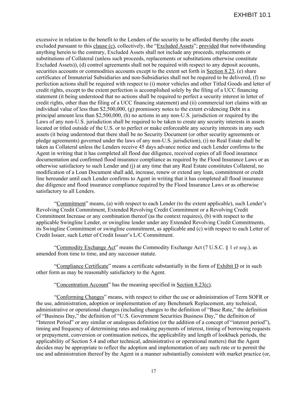 excessive in relation to the benefit to the Lenders of the security to be afforded thereby (the assets excluded pursuant to this clause (c), collectively, the “Excluded Assets”; provided that notwithstanding anything herein to the contrary, Excluded Assets shall not include any proceeds, replacements or substitutions of Collateral (unless such proceeds, replacements or substitutions otherwise constitute Excluded Assets)), (d) control agreements shall not be required with respect to any deposit accounts, securities accounts or commodities accounts except to the extent set forth in Section 8.23, (e) share certificates of Immaterial Subsidiaries and non-Subsidiaries shall not be required to be delivered, (f) no perfection actions shall be required with respect to (i) motor vehicles and other Titled Goods and letter of credit rights, except to the extent perfection is accomplished solely by the filing of a UCC financing statement (it being understood that no actions shall be required to perfect a security interest in letter of credit rights, other than the filing of a UCC financing statement) and (ii) commercial tort claims with an individual value of less than $2,500,000, (g) promissory notes to the extent evidencing Debt in a principal amount less than $2,500,000, (h) no actions in any non-U.S. jurisdiction or required by the Laws of any non-U.S. jurisdiction shall be required to be taken to create any security interests in assets located or titled outside of the U.S. or to perfect or make enforceable any security interests in any such assets (it being understood that there shall be no Security Document (or other security agreements or pledge agreements) governed under the laws of any non-U.S. jurisdiction), (i) no Real Estate shall be taken as Collateral unless the Lenders receive 45 days advance notice and each Lender confirms to the Agent in writing that it has completed all flood due diligence, received copies of all flood insurance documentation and confirmed flood insurance compliance as required by the Flood Insurance Laws or as otherwise satisfactory to such Lender and (j) at any time that any Real Estate constitutes Collateral, no modification of a Loan Document shall add, increase, renew or extend any loan, commitment or credit line hereunder until each Lender confirms to Agent in writing that it has completed all flood insurance due diligence and flood insurance compliance required by the Flood Insurance Laws or as otherwise satisfactory to all Lenders. “Commitment” means, (a) with respect to each Lender (to the extent applicable), such Lender’s Revolving Credit Commitment, Extended Revolving Credit Commitment or a Revolving Credit Commitment Increase or any combination thereof (as the context requires), (b) with respect to the applicable Swingline Lender, or swingline lender under any Extended Revolving Credit Commitments, its Swingline Commitment or swingline commitment, as applicable and (c) with respect to each Letter of Credit Issuer, such Letter of Credit Issuer’s L/C Commitment. “Commodity Exchange Act” means the Commodity Exchange Act (7 U.S.C. § 1 et seq.), as amended from time to time, and any successor statute. “Compliance Certificate” means a certificate substantially in the form of Exhibit D or in such other form as may be reasonably satisfactory to the Agent. “Concentration Account” has the meaning specified in Section 8.23(c). “Conforming Changes” means, with respect to either the use or administration of Term SOFR or the use, administration, adoption or implementation of any Benchmark Replacement, any technical, administrative or operational changes (including changes to the definition of “Base Rate,” the definition of “Business Day,” the definition of “U.S. Government Securities Business Day,” the definition of “Interest Period” or any similar or analogous definition (or the addition of a concept of “interest period”), timing and frequency of determining rates and making payments of interest, timing of borrowing requests or prepayment, conversion or continuation notices, the applicability and length of lookback periods, the applicability of Section 5.4 and other technical, administrative or operational matters) that the Agent decides may be appropriate to reflect the adoption and implementation of any such rate or to permit the use and administration thereof by the Agent in a manner substantially consistent with market practice (or, 17 EXHIBIT 10.1