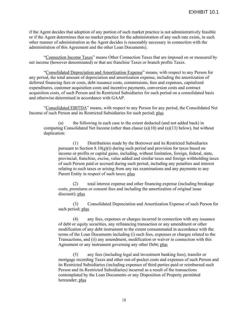 if the Agent decides that adoption of any portion of such market practice is not administratively feasible or if the Agent determines that no market practice for the administration of any such rate exists, in such other manner of administration as the Agent decides is reasonably necessary in connection with the administration of this Agreement and the other Loan Documents). “Connection Income Taxes” means Other Connection Taxes that are imposed on or measured by net income (however denominated) or that are franchise Taxes or branch profits Taxes. “Consolidated Depreciation and Amortization Expense” means, with respect to any Person for any period, the total amount of depreciation and amortization expense, including the amortization of deferred financing fees or costs, debt issuance costs, commissions, fees and expenses, capitalized expenditures, customer acquisition costs and incentive payments, conversion costs and contract acquisition costs, of such Person and its Restricted Subsidiaries for such period on a consolidated basis and otherwise determined in accordance with GAAP. “Consolidated EBITDA” means, with respect to any Person for any period, the Consolidated Net Income of such Person and its Restricted Subsidiaries for such period; plus (a) the following in each case to the extent deducted (and not added back) in computing Consolidated Net Income (other than clause (a)(10) and (a)(13) below), but without duplication: (1) Distributions made by the Borrower and its Restricted Subsidiaries pursuant to Section 8.10(g)(i) during such period and provision for taxes based on income or profits or capital gains, including, without limitation, foreign, federal, state, provincial, franchise, excise, value added and similar taxes and foreign withholding taxes of such Person paid or accrued during such period, including any penalties and interest relating to such taxes or arising from any tax examinations and any payments to any Parent Entity in respect of such taxes; plus (2) total interest expense and other financing expense (including breakage costs, premiums or consent fees and including the amortization of original issue discount); plus (3) Consolidated Depreciation and Amortization Expense of such Person for such period; plus (4) any fees, expenses or charges incurred in connection with any issuance of debt or equity securities, any refinancing transaction or any amendment or other modification of any debt instrument to the extent consummated in accordance with the terms of the Loan Documents including (i) such fees, expenses or charges related to the Transactions, and (ii) any amendment, modification or waiver in connection with this Agreement or any instrument governing any other Debt; plus (5) any fees (including legal and investment banking fees), transfer or mortgage recording Taxes and other out-of-pocket costs and expenses of such Person and its Restricted Subsidiaries (including expenses of third parties paid or reimbursed such Person and its Restricted Subsidiaries) incurred as a result of the transactions contemplated by the Loan Documents or any Disposition of Property permitted hereunder; plus 18 EXHIBIT 10.1