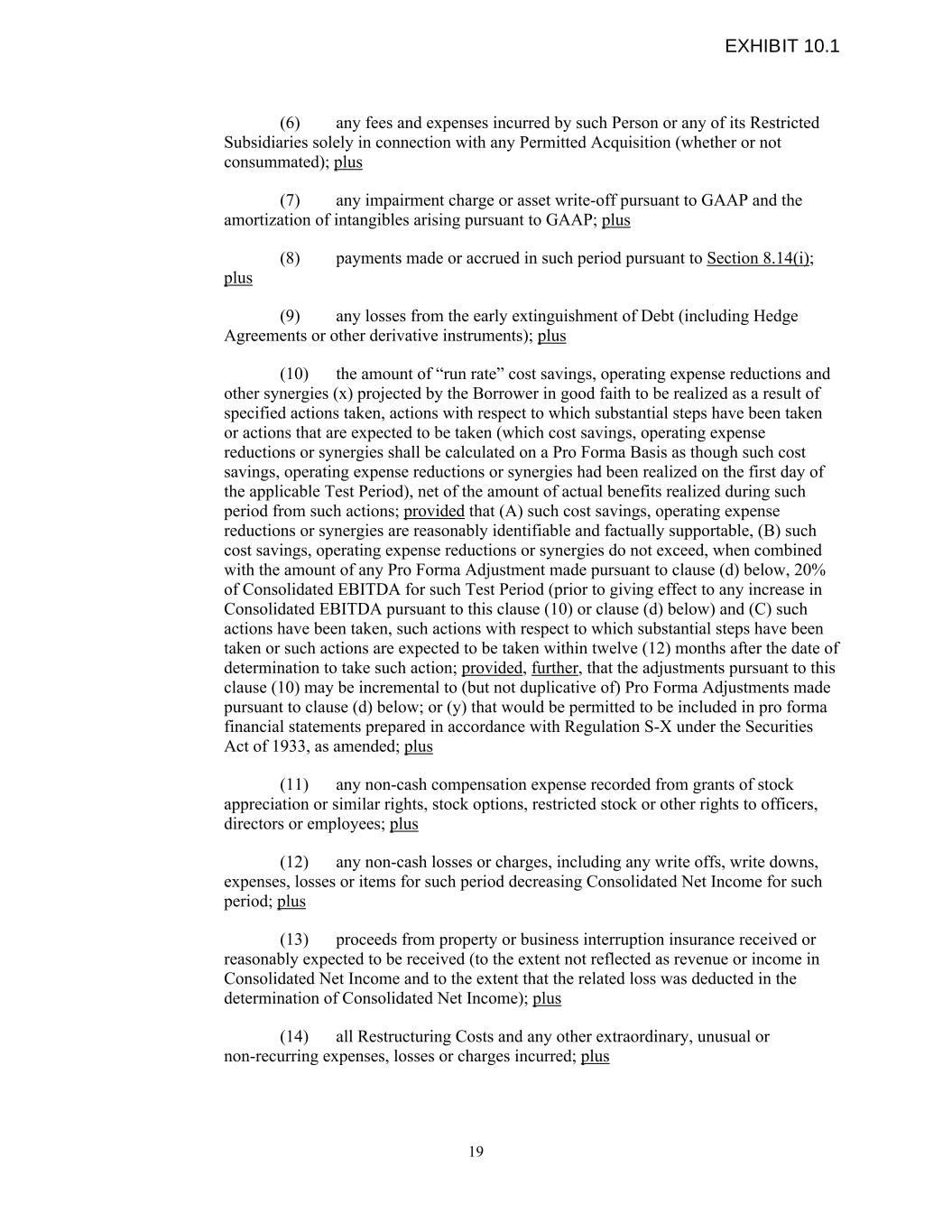 (6) any fees and expenses incurred by such Person or any of its Restricted Subsidiaries solely in connection with any Permitted Acquisition (whether or not consummated); plus (7) any impairment charge or asset write-off pursuant to GAAP and the amortization of intangibles arising pursuant to GAAP; plus (8) payments made or accrued in such period pursuant to Section 8.14(i); plus (9) any losses from the early extinguishment of Debt (including Hedge Agreements or other derivative instruments); plus (10) the amount of “run rate” cost savings, operating expense reductions and other synergies (x) projected by the Borrower in good faith to be realized as a result of specified actions taken, actions with respect to which substantial steps have been taken or actions that are expected to be taken (which cost savings, operating expense reductions or synergies shall be calculated on a Pro Forma Basis as though such cost savings, operating expense reductions or synergies had been realized on the first day of the applicable Test Period), net of the amount of actual benefits realized during such period from such actions; provided that (A) such cost savings, operating expense reductions or synergies are reasonably identifiable and factually supportable, (B) such cost savings, operating expense reductions or synergies do not exceed, when combined with the amount of any Pro Forma Adjustment made pursuant to clause (d) below, 20% of Consolidated EBITDA for such Test Period (prior to giving effect to any increase in Consolidated EBITDA pursuant to this clause (10) or clause (d) below) and (C) such actions have been taken, such actions with respect to which substantial steps have been taken or such actions are expected to be taken within twelve (12) months after the date of determination to take such action; provided, further, that the adjustments pursuant to this clause (10) may be incremental to (but not duplicative of) Pro Forma Adjustments made pursuant to clause (d) below; or (y) that would be permitted to be included in pro forma financial statements prepared in accordance with Regulation S-X under the Securities Act of 1933, as amended; plus (11) any non-cash compensation expense recorded from grants of stock appreciation or similar rights, stock options, restricted stock or other rights to officers, directors or employees; plus (12) any non-cash losses or charges, including any write offs, write downs, expenses, losses or items for such period decreasing Consolidated Net Income for such period; plus (13) proceeds from property or business interruption insurance received or reasonably expected to be received (to the extent not reflected as revenue or income in Consolidated Net Income and to the extent that the related loss was deducted in the determination of Consolidated Net Income); plus (14) all Restructuring Costs and any other extraordinary, unusual or non-recurring expenses, losses or charges incurred; plus 19 EXHIBIT 10.1