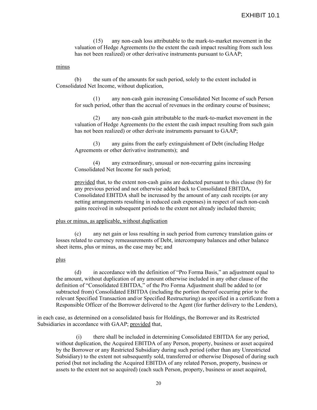 (15) any non-cash loss attributable to the mark-to-market movement in the valuation of Hedge Agreements (to the extent the cash impact resulting from such loss has not been realized) or other derivative instruments pursuant to GAAP; minus (b) the sum of the amounts for such period, solely to the extent included in Consolidated Net Income, without duplication, (1) any non-cash gain increasing Consolidated Net Income of such Person for such period, other than the accrual of revenues in the ordinary course of business; (2) any non-cash gain attributable to the mark-to-market movement in the valuation of Hedge Agreements (to the extent the cash impact resulting from such gain has not been realized) or other derivate instruments pursuant to GAAP; (3) any gains from the early extinguishment of Debt (including Hedge Agreements or other derivative instruments); and (4) any extraordinary, unusual or non-recurring gains increasing Consolidated Net Income for such period; provided that, to the extent non-cash gains are deducted pursuant to this clause (b) for any previous period and not otherwise added back to Consolidated EBITDA, Consolidated EBITDA shall be increased by the amount of any cash receipts (or any netting arrangements resulting in reduced cash expenses) in respect of such non-cash gains received in subsequent periods to the extent not already included therein; plus or minus, as applicable, without duplication (c) any net gain or loss resulting in such period from currency translation gains or losses related to currency remeasurements of Debt, intercompany balances and other balance sheet items, plus or minus, as the case may be; and plus (d) in accordance with the definition of “Pro Forma Basis,” an adjustment equal to the amount, without duplication of any amount otherwise included in any other clause of the definition of “Consolidated EBITDA,” of the Pro Forma Adjustment shall be added to (or subtracted from) Consolidated EBITDA (including the portion thereof occurring prior to the relevant Specified Transaction and/or Specified Restructuring) as specified in a certificate from a Responsible Officer of the Borrower delivered to the Agent (for further delivery to the Lenders), in each case, as determined on a consolidated basis for Holdings, the Borrower and its Restricted Subsidiaries in accordance with GAAP; provided that, (i) there shall be included in determining Consolidated EBITDA for any period, without duplication, the Acquired EBITDA of any Person, property, business or asset acquired by the Borrower or any Restricted Subsidiary during such period (other than any Unrestricted Subsidiary) to the extent not subsequently sold, transferred or otherwise Disposed of during such period (but not including the Acquired EBITDA of any related Person, property, business or assets to the extent not so acquired) (each such Person, property, business or asset acquired, 20 EXHIBIT 10.1