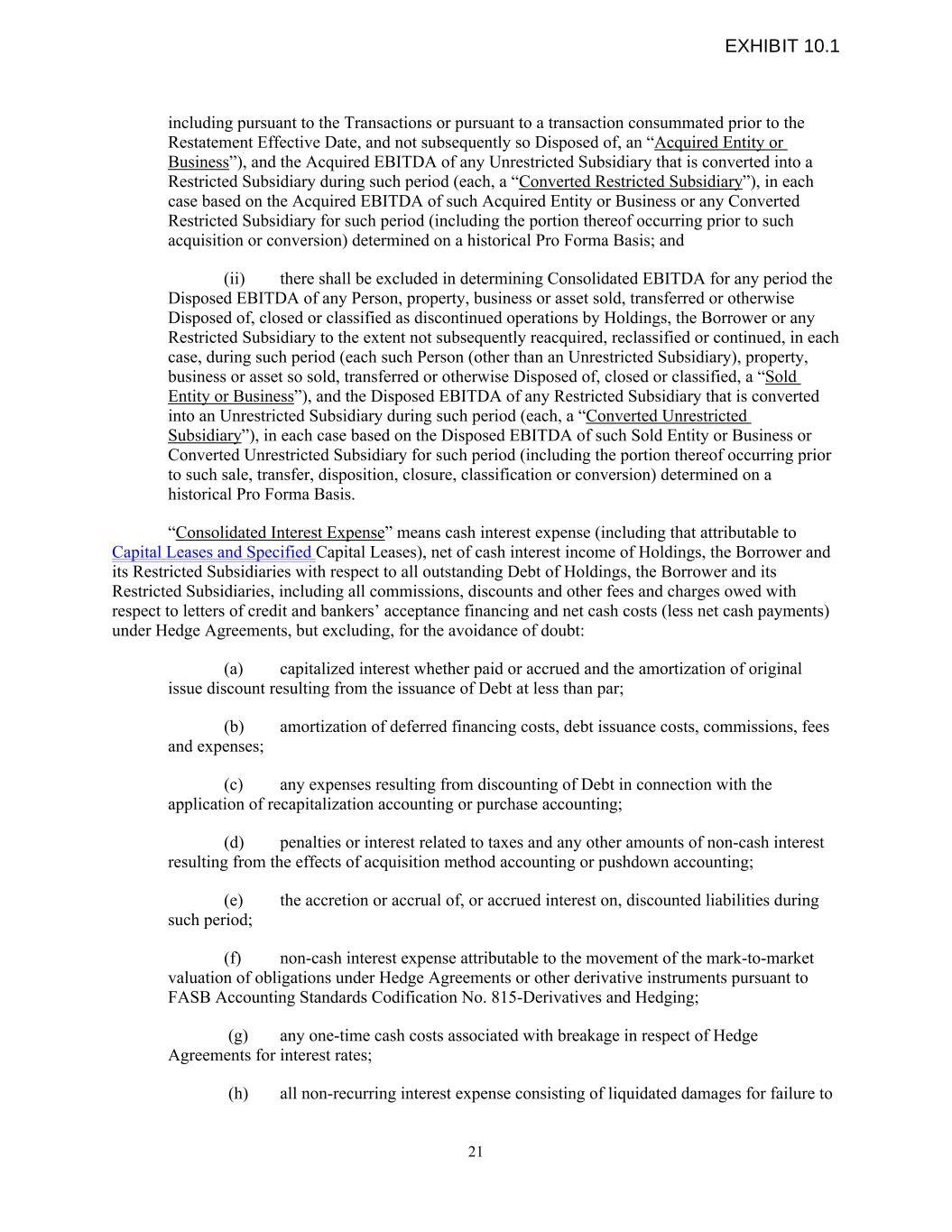 including pursuant to the Transactions or pursuant to a transaction consummated prior to the Restatement Effective Date, and not subsequently so Disposed of, an “Acquired Entity or Business”), and the Acquired EBITDA of any Unrestricted Subsidiary that is converted into a Restricted Subsidiary during such period (each, a “Converted Restricted Subsidiary”), in each case based on the Acquired EBITDA of such Acquired Entity or Business or any Converted Restricted Subsidiary for such period (including the portion thereof occurring prior to such acquisition or conversion) determined on a historical Pro Forma Basis; and (ii) there shall be excluded in determining Consolidated EBITDA for any period the Disposed EBITDA of any Person, property, business or asset sold, transferred or otherwise Disposed of, closed or classified as discontinued operations by Holdings, the Borrower or any Restricted Subsidiary to the extent not subsequently reacquired, reclassified or continued, in each case, during such period (each such Person (other than an Unrestricted Subsidiary), property, business or asset so sold, transferred or otherwise Disposed of, closed or classified, a “Sold Entity or Business”), and the Disposed EBITDA of any Restricted Subsidiary that is converted into an Unrestricted Subsidiary during such period (each, a “Converted Unrestricted Subsidiary”), in each case based on the Disposed EBITDA of such Sold Entity or Business or Converted Unrestricted Subsidiary for such period (including the portion thereof occurring prior to such sale, transfer, disposition, closure, classification or conversion) determined on a historical Pro Forma Basis. “Consolidated Interest Expense” means cash interest expense (including that attributable to Capital Leases and Specified Capital Leases), net of cash interest income of Holdings, the Borrower and its Restricted Subsidiaries with respect to all outstanding Debt of Holdings, the Borrower and its Restricted Subsidiaries, including all commissions, discounts and other fees and charges owed with respect to letters of credit and bankers’ acceptance financing and net cash costs (less net cash payments) under Hedge Agreements, but excluding, for the avoidance of doubt: (a) capitalized interest whether paid or accrued and the amortization of original issue discount resulting from the issuance of Debt at less than par; (b) amortization of deferred financing costs, debt issuance costs, commissions, fees and expenses; (c) any expenses resulting from discounting of Debt in connection with the application of recapitalization accounting or purchase accounting; (d) penalties or interest related to taxes and any other amounts of non-cash interest resulting from the effects of acquisition method accounting or pushdown accounting; (e) the accretion or accrual of, or accrued interest on, discounted liabilities during such period; (f) non-cash interest expense attributable to the movement of the mark-to-market valuation of obligations under Hedge Agreements or other derivative instruments pursuant to FASB Accounting Standards Codification No. 815-Derivatives and Hedging; (g) any one-time cash costs associated with breakage in respect of Hedge Agreements for interest rates; (h) all non-recurring interest expense consisting of liquidated damages for failure to 21 EXHIBIT 10.1