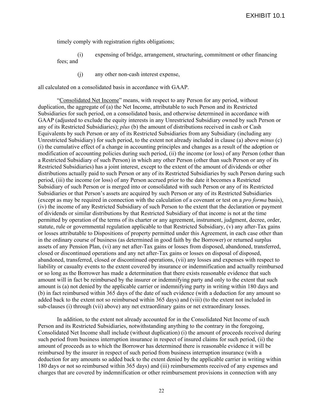 timely comply with registration rights obligations; (i) expensing of bridge, arrangement, structuring, commitment or other financing fees; and (j) any other non-cash interest expense, all calculated on a consolidated basis in accordance with GAAP. “Consolidated Net Income” means, with respect to any Person for any period, without duplication, the aggregate of (a) the Net Income, attributable to such Person and its Restricted Subsidiaries for such period, on a consolidated basis, and otherwise determined in accordance with GAAP (adjusted to exclude the equity interests in any Unrestricted Subsidiary owned by such Person or any of its Restricted Subsidiaries); plus (b) the amount of distributions received in cash or Cash Equivalents by such Person or any of its Restricted Subsidiaries from any Subsidiary (including any Unrestricted Subsidiary) for such period, to the extent not already included in clause (a) above minus (c) (i) the cumulative effect of a change in accounting principles and changes as a result of the adoption or modification of accounting policies during such period, (ii) the income (or loss) of any Person (other than a Restricted Subsidiary of such Person) in which any other Person (other than such Person or any of its Restricted Subsidiaries) has a joint interest, except to the extent of the amount of dividends or other distributions actually paid to such Person or any of its Restricted Subsidiaries by such Person during such period, (iii) the income (or loss) of any Person accrued prior to the date it becomes a Restricted Subsidiary of such Person or is merged into or consolidated with such Person or any of its Restricted Subsidiaries or that Person’s assets are acquired by such Person or any of its Restricted Subsidiaries (except as may be required in connection with the calculation of a covenant or test on a pro forma basis), (iv) the income of any Restricted Subsidiary of such Person to the extent that the declaration or payment of dividends or similar distributions by that Restricted Subsidiary of that income is not at the time permitted by operation of the terms of its charter or any agreement, instrument, judgment, decree, order, statute, rule or governmental regulation applicable to that Restricted Subsidiary, (v) any after-Tax gains or losses attributable to Dispositions of property permitted under this Agreement, in each case other than in the ordinary course of business (as determined in good faith by the Borrower) or returned surplus assets of any Pension Plan, (vi) any net after-Tax gains or losses from disposed, abandoned, transferred, closed or discontinued operations and any net after-Tax gains or losses on disposal of disposed, abandoned, transferred, closed or discontinued operations, (vii) any losses and expenses with respect to liability or casualty events to the extent covered by insurance or indemnification and actually reimbursed or so long as the Borrower has made a determination that there exists reasonable evidence that such amount will in fact be reimbursed by the insurer or indemnifying party and only to the extent that such amount is (a) not denied by the applicable carrier or indemnifying party in writing within 180 days and (b) in fact reimbursed within 365 days of the date of such evidence (with a deduction for any amount so added back to the extent not so reimbursed within 365 days) and (viii) (to the extent not included in sub-clauses (i) through (vii) above) any net extraordinary gains or net extraordinary losses. In addition, to the extent not already accounted for in the Consolidated Net Income of such Person and its Restricted Subsidiaries, notwithstanding anything to the contrary in the foregoing, Consolidated Net Income shall include (without duplication) (i) the amount of proceeds received during such period from business interruption insurance in respect of insured claims for such period, (ii) the amount of proceeds as to which the Borrower has determined there is reasonable evidence it will be reimbursed by the insurer in respect of such period from business interruption insurance (with a deduction for any amounts so added back to the extent denied by the applicable carrier in writing within 180 days or not so reimbursed within 365 days) and (iii) reimbursements received of any expenses and charges that are covered by indemnification or other reimbursement provisions in connection with any 22 EXHIBIT 10.1