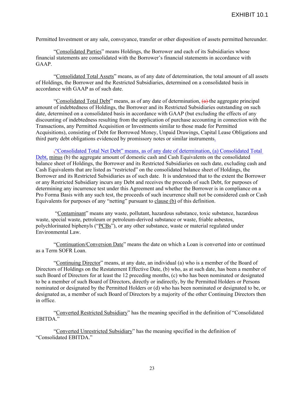 Permitted Investment or any sale, conveyance, transfer or other disposition of assets permitted hereunder. “Consolidated Parties” means Holdings, the Borrower and each of its Subsidiaries whose financial statements are consolidated with the Borrower’s financial statements in accordance with GAAP. “Consolidated Total Assets” means, as of any date of determination, the total amount of all assets of Holdings, the Borrower and the Restricted Subsidiaries, determined on a consolidated basis in accordance with GAAP as of such date. “Consolidated Total Debt” means, as of any date of determination, (a) the aggregate principal amount of indebtedness of Holdings, the Borrower and its Restricted Subsidiaries outstanding on such date, determined on a consolidated basis in accordance with GAAP (but excluding the effects of any discounting of indebtedness resulting from the application of purchase accounting in connection with the Transactions, any Permitted Acquisition or Investments similar to those made for Permitted Acquisitions), consisting of Debt for Borrowed Money, Unpaid Drawings, Capital Lease Obligations and third party debt obligations evidenced by promissory notes or similar instruments. ,“Consolidated Total Net Debt” means, as of any date of determination, (a) Consolidated Total Debt, minus (b) the aggregate amount of domestic cash and Cash Equivalents on the consolidated balance sheet of Holdings, the Borrower and its Restricted Subsidiaries on such date, excluding cash and Cash Equivalents that are listed as “restricted” on the consolidated balance sheet of Holdings, the Borrower and its Restricted Subsidiaries as of such date. It is understood that to the extent the Borrower or any Restricted Subsidiary incurs any Debt and receives the proceeds of such Debt, for purposes of determining any incurrence test under this Agreement and whether the Borrower is in compliance on a Pro Forma Basis with any such test, the proceeds of such incurrence shall not be considered cash or Cash Equivalents for purposes of any “netting” pursuant to clause (b) of this definition. “Contaminant” means any waste, pollutant, hazardous substance, toxic substance, hazardous waste, special waste, petroleum or petroleum-derived substance or waste, friable asbestos, polychlorinated biphenyls (“PCBs”), or any other substance, waste or material regulated under Environmental Law. “Continuation/Conversion Date” means the date on which a Loan is converted into or continued as a Term SOFR Loan. “Continuing Director” means, at any date, an individual (a) who is a member of the Board of Directors of Holdings on the Restatement Effective Date, (b) who, as at such date, has been a member of such Board of Directors for at least the 12 preceding months, (c) who has been nominated or designated to be a member of such Board of Directors, directly or indirectly, by the Permitted Holders or Persons nominated or designated by the Permitted Holders or (d) who has been nominated or designated to be, or designated as, a member of such Board of Directors by a majority of the other Continuing Directors then in office. “Converted Restricted Subsidiary” has the meaning specified in the definition of “Consolidated EBITDA.” “Converted Unrestricted Subsidiary” has the meaning specified in the definition of “Consolidated EBITDA.” 23 EXHIBIT 10.1