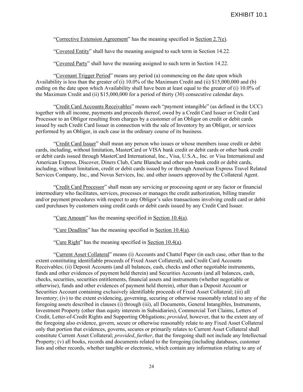 “Corrective Extension Agreement” has the meaning specified in Section 2.7(e). “Covered Entity” shall have the meaning assigned to such term in Section 14.22. “Covered Party” shall have the meaning assigned to such term in Section 14.22. “Covenant Trigger Period” means any period (a) commencing on the date upon which Availability is less than the greater of (i) 10.0% of the Maximum Credit and (ii) $15,000,000 and (b) ending on the date upon which Availability shall have been at least equal to the greater of (i) 10.0% of the Maximum Credit and (ii) $15,000,000 for a period of thirty (30) consecutive calendar days. “Credit Card Accounts Receivables” means each “payment intangible” (as defined in the UCC) together with all income, payments and proceeds thereof, owed by a Credit Card Issuer or Credit Card Processor to an Obligor resulting from charges by a customer of an Obligor on credit or debit cards issued by such Credit Card Issuer in connection with the sale of Inventory by an Obligor, or services performed by an Obligor, in each case in the ordinary course of its business. “Credit Card Issuer” shall mean any person who issues or whose members issue credit or debit cards, including, without limitation, MasterCard or VISA bank credit or debit cards or other bank credit or debit cards issued through MasterCard International, Inc., Visa, U.S.A., Inc. or Visa International and American Express, Discover, Diners Club, Carte Blanche and other non-bank credit or debit cards, including, without limitation, credit or debit cards issued by or through American Express Travel Related Services Company, Inc., and Novus Services, Inc. and other issuers approved by the Collateral Agent. “Credit Card Processor” shall mean any servicing or processing agent or any factor or financial intermediary who facilitates, services, processes or manages the credit authorization, billing transfer and/or payment procedures with respect to any Obligor’s sales transactions involving credit card or debit card purchases by customers using credit cards or debit cards issued by any Credit Card Issuer. “Cure Amount” has the meaning specified in Section 10.4(a). “Cure Deadline” has the meaning specified in Section 10.4(a). “Cure Right” has the meaning specified in Section 10.4(a). “Current Asset Collateral” means (i) Accounts and Chattel Paper (in each case, other than to the extent constituting identifiable proceeds of Fixed Asset Collateral), and Credit Card Accounts Receivables; (ii) Deposit Accounts (and all balances, cash, checks and other negotiable instruments, funds and other evidences of payment held therein) and Securities Accounts (and all balances, cash, checks, securities, securities entitlements, financial assets and instruments (whether negotiable or otherwise), funds and other evidences of payment held therein), other than a Deposit Account or Securities Account containing exclusively identifiable proceeds of Fixed Asset Collateral; (iii) all Inventory; (iv) to the extent evidencing, governing, securing or otherwise reasonably related to any of the foregoing assets described in clauses (i) through (iii), all Documents, General Intangibles, Instruments, Investment Property (other than equity interests in Subsidiaries), Commercial Tort Claims, Letters of Credit, Letter-of-Credit Rights and Supporting Obligations; provided, however, that to the extent any of the foregoing also evidence, govern, secure or otherwise reasonably relate to any Fixed Asset Collateral only that portion that evidences, governs, secures or primarily relates to Current Asset Collateral shall constitute Current Asset Collateral; provided, further, that the foregoing shall not include any Intellectual Property; (v) all books, records and documents related to the foregoing (including databases, customer lists and other records, whether tangible or electronic, which contain any information relating to any of 24 EXHIBIT 10.1
