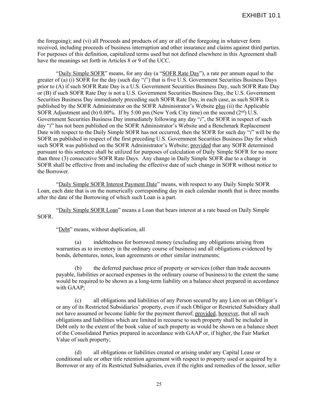 the foregoing); and (vi) all Proceeds and products of any or all of the foregoing in whatever form received, including proceeds of business interruption and other insurance and claims against third parties. For purposes of this definition, capitalized terms used but not defined elsewhere in this Agreement shall have the meanings set forth in Articles 8 or 9 of the UCC. “Daily Simple SOFR” means, for any day (a “SOFR Rate Day”), a rate per annum equal to the greater of (a) (i) SOFR for the day (such day “i”) that is five U.S. Government Securities Business Days prior to (A) if such SOFR Rate Day is a U.S. Government Securities Business Day, such SOFR Rate Day or (B) if such SOFR Rate Day is not a U.S. Government Securities Business Day, the U.S. Government Securities Business Day immediately preceding such SOFR Rate Day, in each case, as such SOFR is published by the SOFR Administrator on the SOFR Administrator’s Website plus (ii) the Applicable SOFR Adjustment and (b) 0.00%. If by 5:00 pm (New York City time) on the second (2nd) U.S. Government Securities Business Day immediately following any day “i”, the SOFR in respect of such day “i” has not been published on the SOFR Administrator’s Website and a Benchmark Replacement Date with respect to the Daily Simple SOFR has not occurred, then the SOFR for such day “i” will be the SOFR as published in respect of the first preceding U.S. Government Securities Business Day for which such SOFR was published on the SOFR Administrator’s Website; provided that any SOFR determined pursuant to this sentence shall be utilized for purposes of calculation of Daily Simple SOFR for no more than three (3) consecutive SOFR Rate Days. Any change in Daily Simple SOFR due to a change in SOFR shall be effective from and including the effective date of such change in SOFR without notice to the Borrower. “Daily Simple SOFR Interest Payment Date” means, with respect to any Daily Simple SOFR Loan, each date that is on the numerically corresponding day in each calendar month that is three months after the date of the Borrowing of which such Loan is a part. “Daily Simple SOFR Loan” means a Loan that bears interest at a rate based on Daily Simple SOFR. “Debt” means, without duplication, all (a) indebtedness for borrowed money (excluding any obligations arising from warranties as to inventory in the ordinary course of business) and all obligations evidenced by bonds, debentures, notes, loan agreements or other similar instruments; (b) the deferred purchase price of property or services (other than trade accounts payable, liabilities or accrued expenses in the ordinary course of business) to the extent the same would be required to be shown as a long-term liability on a balance sheet prepared in accordance with GAAP; (c) all obligations and liabilities of any Person secured by any Lien on an Obligor’s or any of its Restricted Subsidiaries’ property, even if such Obligor or Restricted Subsidiary shall not have assumed or become liable for the payment thereof; provided, however, that all such obligations and liabilities which are limited in recourse to such property shall be included in Debt only to the extent of the book value of such property as would be shown on a balance sheet of the Consolidated Parties prepared in accordance with GAAP or, if higher, the Fair Market Value of such property; (d) all obligations or liabilities created or arising under any Capital Lease or conditional sale or other title retention agreement with respect to property used or acquired by a Borrower or any of its Restricted Subsidiaries, even if the rights and remedies of the lessor, seller 25 EXHIBIT 10.1