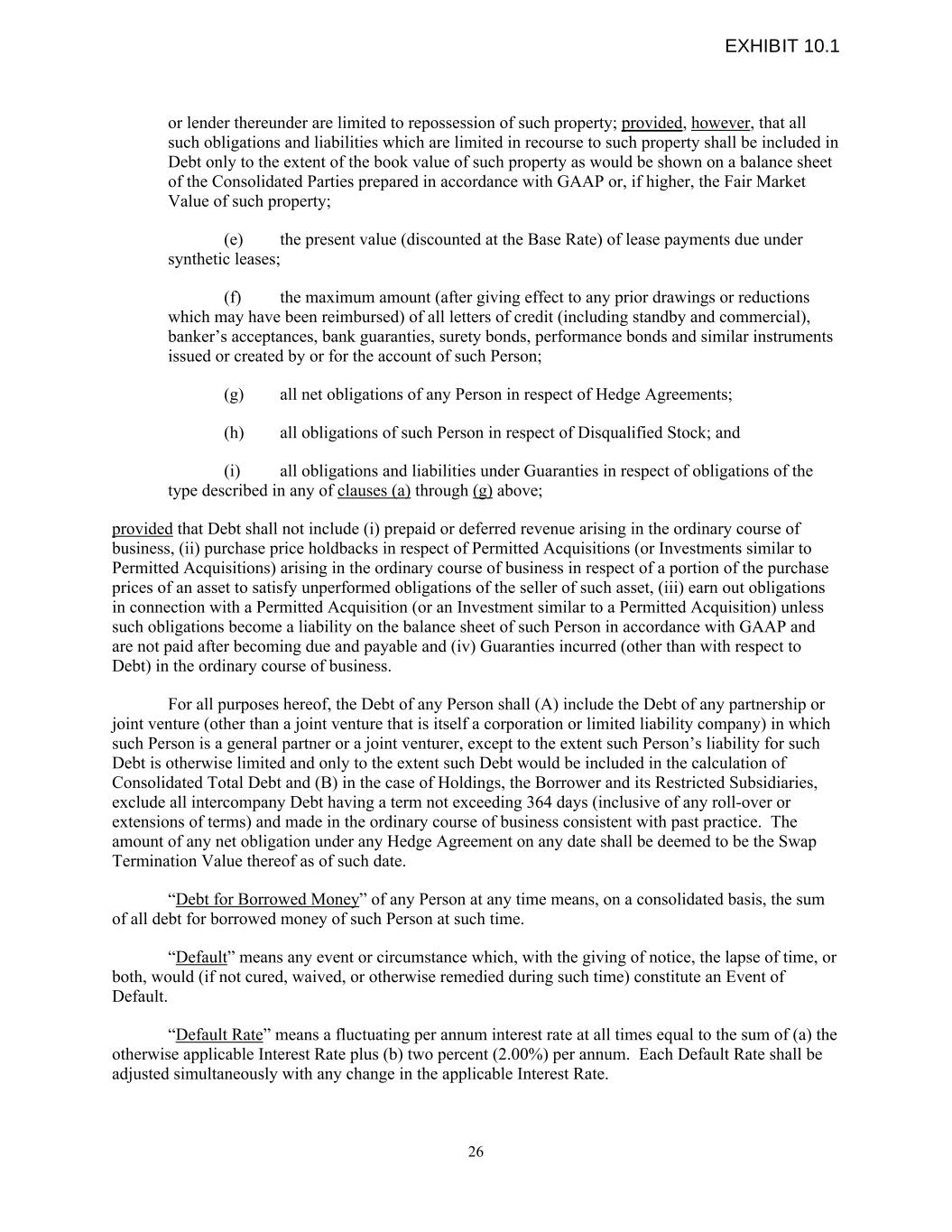 or lender thereunder are limited to repossession of such property; provided, however, that all such obligations and liabilities which are limited in recourse to such property shall be included in Debt only to the extent of the book value of such property as would be shown on a balance sheet of the Consolidated Parties prepared in accordance with GAAP or, if higher, the Fair Market Value of such property; (e) the present value (discounted at the Base Rate) of lease payments due under synthetic leases; (f) the maximum amount (after giving effect to any prior drawings or reductions which may have been reimbursed) of all letters of credit (including standby and commercial), banker’s acceptances, bank guaranties, surety bonds, performance bonds and similar instruments issued or created by or for the account of such Person; (g) all net obligations of any Person in respect of Hedge Agreements; (h) all obligations of such Person in respect of Disqualified Stock; and (i) all obligations and liabilities under Guaranties in respect of obligations of the type described in any of clauses (a) through (g) above; provided that Debt shall not include (i) prepaid or deferred revenue arising in the ordinary course of business, (ii) purchase price holdbacks in respect of Permitted Acquisitions (or Investments similar to Permitted Acquisitions) arising in the ordinary course of business in respect of a portion of the purchase prices of an asset to satisfy unperformed obligations of the seller of such asset, (iii) earn out obligations in connection with a Permitted Acquisition (or an Investment similar to a Permitted Acquisition) unless such obligations become a liability on the balance sheet of such Person in accordance with GAAP and are not paid after becoming due and payable and (iv) Guaranties incurred (other than with respect to Debt) in the ordinary course of business. For all purposes hereof, the Debt of any Person shall (A) include the Debt of any partnership or joint venture (other than a joint venture that is itself a corporation or limited liability company) in which such Person is a general partner or a joint venturer, except to the extent such Person’s liability for such Debt is otherwise limited and only to the extent such Debt would be included in the calculation of Consolidated Total Debt and (B) in the case of Holdings, the Borrower and its Restricted Subsidiaries, exclude all intercompany Debt having a term not exceeding 364 days (inclusive of any roll-over or extensions of terms) and made in the ordinary course of business consistent with past practice. The amount of any net obligation under any Hedge Agreement on any date shall be deemed to be the Swap Termination Value thereof as of such date. “Debt for Borrowed Money” of any Person at any time means, on a consolidated basis, the sum of all debt for borrowed money of such Person at such time. “Default” means any event or circumstance which, with the giving of notice, the lapse of time, or both, would (if not cured, waived, or otherwise remedied during such time) constitute an Event of Default. “Default Rate” means a fluctuating per annum interest rate at all times equal to the sum of (a) the otherwise applicable Interest Rate plus (b) two percent (2.00%) per annum. Each Default Rate shall be adjusted simultaneously with any change in the applicable Interest Rate. 26 EXHIBIT 10.1
