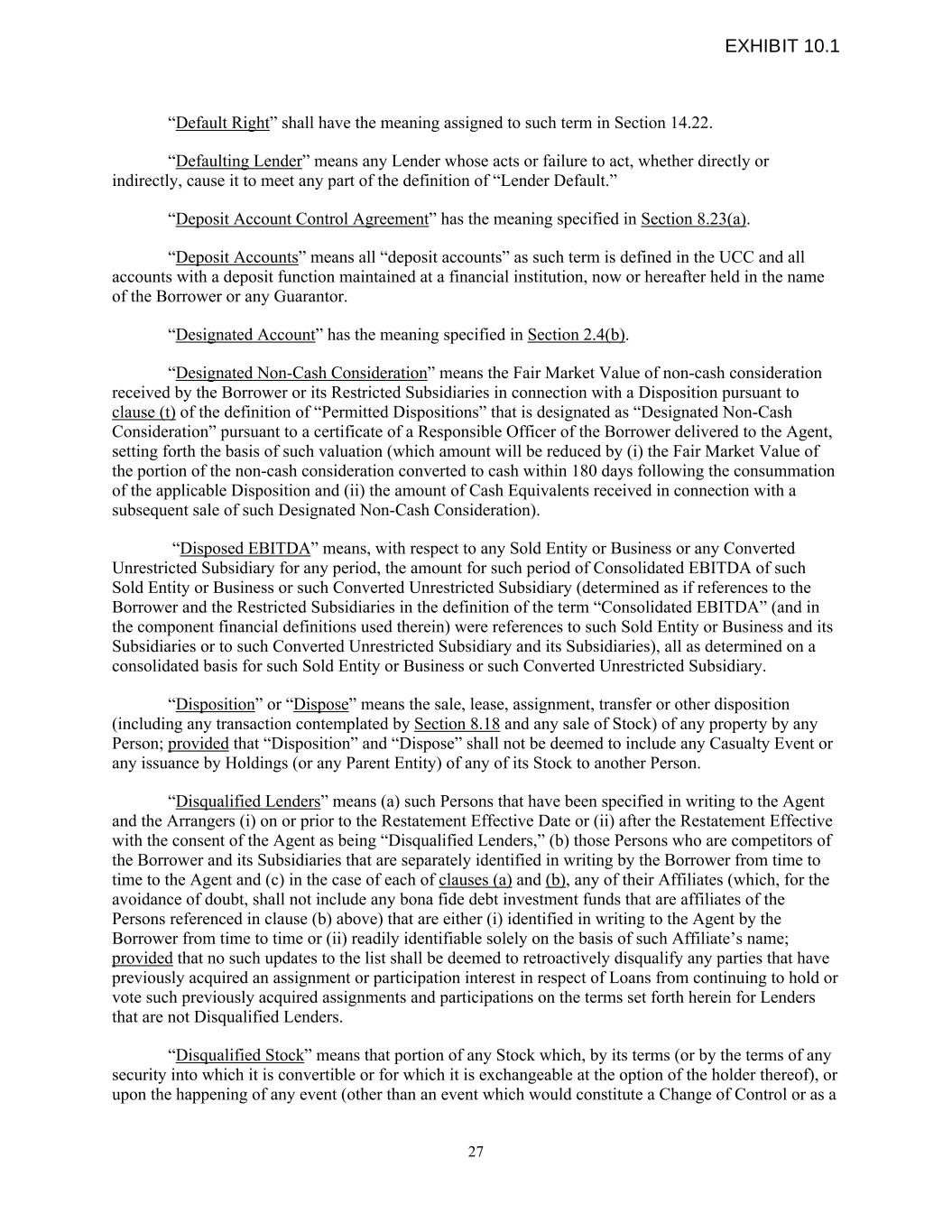 “Default Right” shall have the meaning assigned to such term in Section 14.22. “Defaulting Lender” means any Lender whose acts or failure to act, whether directly or indirectly, cause it to meet any part of the definition of “Lender Default.” “Deposit Account Control Agreement” has the meaning specified in Section 8.23(a). “Deposit Accounts” means all “deposit accounts” as such term is defined in the UCC and all accounts with a deposit function maintained at a financial institution, now or hereafter held in the name of the Borrower or any Guarantor. “Designated Account” has the meaning specified in Section 2.4(b). “Designated Non-Cash Consideration” means the Fair Market Value of non-cash consideration received by the Borrower or its Restricted Subsidiaries in connection with a Disposition pursuant to clause (t) of the definition of “Permitted Dispositions” that is designated as “Designated Non-Cash Consideration” pursuant to a certificate of a Responsible Officer of the Borrower delivered to the Agent, setting forth the basis of such valuation (which amount will be reduced by (i) the Fair Market Value of the portion of the non-cash consideration converted to cash within 180 days following the consummation of the applicable Disposition and (ii) the amount of Cash Equivalents received in connection with a subsequent sale of such Designated Non-Cash Consideration). “Disposed EBITDA” means, with respect to any Sold Entity or Business or any Converted Unrestricted Subsidiary for any period, the amount for such period of Consolidated EBITDA of such Sold Entity or Business or such Converted Unrestricted Subsidiary (determined as if references to the Borrower and the Restricted Subsidiaries in the definition of the term “Consolidated EBITDA” (and in the component financial definitions used therein) were references to such Sold Entity or Business and its Subsidiaries or to such Converted Unrestricted Subsidiary and its Subsidiaries), all as determined on a consolidated basis for such Sold Entity or Business or such Converted Unrestricted Subsidiary. “Disposition” or “Dispose” means the sale, lease, assignment, transfer or other disposition (including any transaction contemplated by Section 8.18 and any sale of Stock) of any property by any Person; provided that “Disposition” and “Dispose” shall not be deemed to include any Casualty Event or any issuance by Holdings (or any Parent Entity) of any of its Stock to another Person. “Disqualified Lenders” means (a) such Persons that have been specified in writing to the Agent and the Arrangers (i) on or prior to the Restatement Effective Date or (ii) after the Restatement Effective with the consent of the Agent as being “Disqualified Lenders,” (b) those Persons who are competitors of the Borrower and its Subsidiaries that are separately identified in writing by the Borrower from time to time to the Agent and (c) in the case of each of clauses (a) and (b), any of their Affiliates (which, for the avoidance of doubt, shall not include any bona fide debt investment funds that are affiliates of the Persons referenced in clause (b) above) that are either (i) identified in writing to the Agent by the Borrower from time to time or (ii) readily identifiable solely on the basis of such Affiliate’s name; provided that no such updates to the list shall be deemed to retroactively disqualify any parties that have previously acquired an assignment or participation interest in respect of Loans from continuing to hold or vote such previously acquired assignments and participations on the terms set forth herein for Lenders that are not Disqualified Lenders. “Disqualified Stock” means that portion of any Stock which, by its terms (or by the terms of any security into which it is convertible or for which it is exchangeable at the option of the holder thereof), or upon the happening of any event (other than an event which would constitute a Change of Control or as a 27 EXHIBIT 10.1