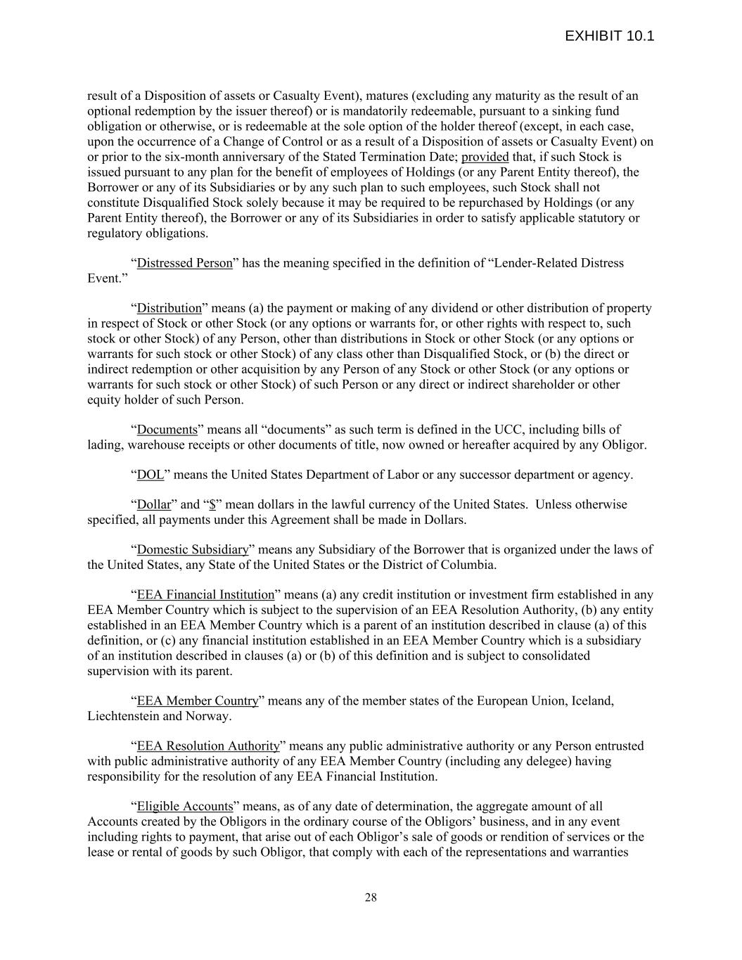 result of a Disposition of assets or Casualty Event), matures (excluding any maturity as the result of an optional redemption by the issuer thereof) or is mandatorily redeemable, pursuant to a sinking fund obligation or otherwise, or is redeemable at the sole option of the holder thereof (except, in each case, upon the occurrence of a Change of Control or as a result of a Disposition of assets or Casualty Event) on or prior to the six-month anniversary of the Stated Termination Date; provided that, if such Stock is issued pursuant to any plan for the benefit of employees of Holdings (or any Parent Entity thereof), the Borrower or any of its Subsidiaries or by any such plan to such employees, such Stock shall not constitute Disqualified Stock solely because it may be required to be repurchased by Holdings (or any Parent Entity thereof), the Borrower or any of its Subsidiaries in order to satisfy applicable statutory or regulatory obligations. “Distressed Person” has the meaning specified in the definition of “Lender-Related Distress Event.” “Distribution” means (a) the payment or making of any dividend or other distribution of property in respect of Stock or other Stock (or any options or warrants for, or other rights with respect to, such stock or other Stock) of any Person, other than distributions in Stock or other Stock (or any options or warrants for such stock or other Stock) of any class other than Disqualified Stock, or (b) the direct or indirect redemption or other acquisition by any Person of any Stock or other Stock (or any options or warrants for such stock or other Stock) of such Person or any direct or indirect shareholder or other equity holder of such Person. “Documents” means all “documents” as such term is defined in the UCC, including bills of lading, warehouse receipts or other documents of title, now owned or hereafter acquired by any Obligor. “DOL” means the United States Department of Labor or any successor department or agency. “Dollar” and “$” mean dollars in the lawful currency of the United States. Unless otherwise specified, all payments under this Agreement shall be made in Dollars. “Domestic Subsidiary” means any Subsidiary of the Borrower that is organized under the laws of the United States, any State of the United States or the District of Columbia. “EEA Financial Institution” means (a) any credit institution or investment firm established in any EEA Member Country which is subject to the supervision of an EEA Resolution Authority, (b) any entity established in an EEA Member Country which is a parent of an institution described in clause (a) of this definition, or (c) any financial institution established in an EEA Member Country which is a subsidiary of an institution described in clauses (a) or (b) of this definition and is subject to consolidated supervision with its parent. “EEA Member Country” means any of the member states of the European Union, Iceland, Liechtenstein and Norway. “EEA Resolution Authority” means any public administrative authority or any Person entrusted with public administrative authority of any EEA Member Country (including any delegee) having responsibility for the resolution of any EEA Financial Institution. “Eligible Accounts” means, as of any date of determination, the aggregate amount of all Accounts created by the Obligors in the ordinary course of the Obligors’ business, and in any event including rights to payment, that arise out of each Obligor’s sale of goods or rendition of services or the lease or rental of goods by such Obligor, that comply with each of the representations and warranties 28 EXHIBIT 10.1
