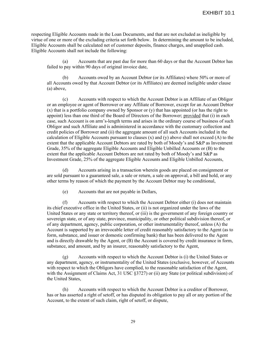 respecting Eligible Accounts made in the Loan Documents, and that are not excluded as ineligible by virtue of one or more of the excluding criteria set forth below. In determining the amount to be included, Eligible Accounts shall be calculated net of customer deposits, finance charges, and unapplied cash. Eligible Accounts shall not include the following: (a) Accounts that are past due for more than 60 days or that the Account Debtor has failed to pay within 90 days of original invoice date, (b) Accounts owed by an Account Debtor (or its Affiliates) where 50% or more of all Accounts owed by that Account Debtor (or its Affiliates) are deemed ineligible under clause (a) above, (c) Accounts with respect to which the Account Debtor is an Affiliate of an Obligor or an employee or agent of Borrower or any Affiliate of Borrower, except for an Account Debtor (x) that is a portfolio company owned by Sponsor or (y) that has appointed (or has the right to appoint) less than one third of the Board of Directors of the Borrower; provided that (i) in each case, such Account is on arm’s-length terms and arises in the ordinary course of business of such Obligor and such Affiliate and is administered in accordance with the customary collection and credit policies of Borrower and (ii) the aggregate amount of all such Accounts included in the calculation of Eligible Accounts pursuant to clauses (x) and (y) above shall not exceed (A) to the extent that the applicable Account Debtors are rated by both of Moody’s and S&P as Investment Grade, 35% of the aggregate Eligible Accounts and Eligible Unbilled Accounts or (B) to the extent that the applicable Account Debtors are not rated by both of Moody’s and S&P as Investment Grade, 25% of the aggregate Eligible Accounts and Eligible Unbilled Accounts, (d) Accounts arising in a transaction wherein goods are placed on consignment or are sold pursuant to a guaranteed sale, a sale or return, a sale on approval, a bill and hold, or any other terms by reason of which the payment by the Account Debtor may be conditional, (e) Accounts that are not payable in Dollars, (f) Accounts with respect to which the Account Debtor either (i) does not maintain its chief executive office in the United States, or (ii) is not organized under the laws of the United States or any state or territory thereof, or (iii) is the government of any foreign country or sovereign state, or of any state, province, municipality, or other political subdivision thereof, or of any department, agency, public corporation, or other instrumentality thereof, unless (A) the Account is supported by an irrevocable letter of credit reasonably satisfactory to the Agent (as to form, substance, and issuer or domestic confirming bank) that has been delivered to the Agent and is directly drawable by the Agent, or (B) the Account is covered by credit insurance in form, substance, and amount, and by an insurer, reasonably satisfactory to the Agent, (g) Accounts with respect to which the Account Debtor is (i) the United States or any department, agency, or instrumentality of the United States (exclusive, however, of Accounts with respect to which the Obligors have complied, to the reasonable satisfaction of the Agent, with the Assignment of Claims Act, 31 USC §3727) or (ii) any State (or political subdivision) of the United States, (h) Accounts with respect to which the Account Debtor is a creditor of Borrower, has or has asserted a right of setoff, or has disputed its obligation to pay all or any portion of the Account, to the extent of such claim, right of setoff, or dispute, 29 EXHIBIT 10.1