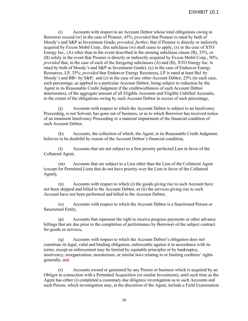 (i) Accounts with respect to an Account Debtor whose total obligations owing to Borrower exceed (w) in the case of Pioneer, 45%; provided that Pioneer is rated by both of Moody’s and S&P as Investment Grade; provided, further, that if Pioneer is directly or indirectly acquired by Exxon Mobil Corp., this subclause (w) shall cease to apply, (x) in the case of XTO Energy Inc., (A) other than in the event described in the ensuing subclause clause (B), 35%, or (B) solely in the event that Pioneer is directly or indirectly acquired by Exxon Mobil Corp., 50%; provided that, in the case of each of the foregoing subclauses (A) and (B), XTO Energy Inc. is rated by both of Moody’s and S&P as Investment Grade), (y) in the case of Endeavor Energy Resources, LP, 35%; provided that Endeavor Energy Resources, LP is rated at least Ba1 by Moody’s and BB+ by S&P; and (z) in the case of any other Account Debtor, 25% (in each case, such percentage, as applied to a particular Account Debtor, being subject to reduction by the Agent in its Reasonable Credit Judgment if the creditworthiness of such Account Debtor deteriorates), of the aggregate amount of all Eligible Accounts and Eligible Unbilled Accounts, to the extent of the obligations owing by such Account Debtor in excess of such percentage, (j) Accounts with respect to which the Account Debtor is subject to an Insolvency Proceeding, is not Solvent, has gone out of business, or as to which Borrower has received notice of an imminent Insolvency Proceeding or a material impairment of the financial condition of such Account Debtor, (k) Accounts, the collection of which, the Agent, in its Reasonable Credit Judgment, believes to be doubtful by reason of the Account Debtor’s financial condition, (l) Accounts that are not subject to a first priority perfected Lien in favor of the Collateral Agent, (m) Accounts that are subject to a Lien other than the Lien of the Collateral Agent (except for Permitted Liens that do not have priority over the Lien in favor of the Collateral Agent), (n) Accounts with respect to which (i) the goods giving rise to such Account have not been shipped and billed to the Account Debtor, or (ii) the services giving rise to such Account have not been performed and billed to the Account Debtor, (o) Accounts with respect to which the Account Debtor is a Sanctioned Person or Sanctioned Entity, (p) Accounts that represent the right to receive progress payments or other advance billings that are due prior to the completion of performance by Borrower of the subject contract for goods or services, (q) Accounts with respect to which the Account Debtor’s obligation does not constitute its legal, valid and binding obligation, enforceable against it in accordance with its terms, except as enforcement may be limited by equitable principles or by bankruptcy, insolvency, reorganization, moratorium, or similar laws relating to or limiting creditors’ rights generally, and (r) Accounts owned or generated by any Person or business which is acquired by an Obligor in connection with a Permitted Acquisition (or similar Investment), until such time as the Agent has either (i) completed a customary due diligence investigation as to such Accounts and such Person, which investigation may, at the discretion of the Agent, include a Field Examination 30 EXHIBIT 10.1