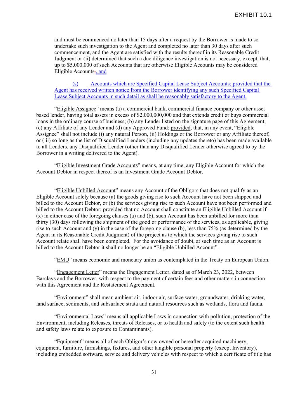 and must be commenced no later than 15 days after a request by the Borrower is made to so undertake such investigation to the Agent and completed no later than 30 days after such commencement, and the Agent are satisfied with the results thereof in its Reasonable Credit Judgment or (ii) determined that such a due diligence investigation is not necessary, except, that, up to $5,000,000 of such Accounts that are otherwise Eligible Accounts may be considered Eligible Accounts., and (s) Accounts which are Specified Capital Lease Subject Accounts; provided that the Agent has received written notice from the Borrower identifying any such Specified Capital Lease Subject Accounts in such detail as shall be reasonably satisfactory to the Agent. “Eligible Assignee” means (a) a commercial bank, commercial finance company or other asset based lender, having total assets in excess of $2,000,000,000 and that extends credit or buys commercial loans in the ordinary course of business; (b) any Lender listed on the signature page of this Agreement; (c) any Affiliate of any Lender and (d) any Approved Fund; provided, that, in any event, “Eligible Assignee” shall not include (i) any natural Person, (ii) Holdings or the Borrower or any Affiliate thereof, or (iii) so long as the list of Disqualified Lenders (including any updates thereto) has been made available to all Lenders, any Disqualified Lender (other than any Disqualified Lender otherwise agreed to by the Borrower in a writing delivered to the Agent). “Eligible Investment Grade Accounts” means, at any time, any Eligible Account for which the Account Debtor in respect thereof is an Investment Grade Account Debtor. “Eligible Unbilled Account” means any Account of the Obligors that does not qualify as an Eligible Account solely because (a) the goods giving rise to such Account have not been shipped and billed to the Account Debtor, or (b) the services giving rise to such Account have not been performed and billed to the Account Debtor; provided that no Account shall constitute an Eligible Unbilled Account if (x) in either case of the foregoing clauses (a) and (b), such Account has been unbilled for more than thirty (30) days following the shipment of the good or performance of the services, as applicable, giving rise to such Account and (y) in the case of the foregoing clause (b), less than 75% (as determined by the Agent in its Reasonable Credit Judgment) of the project as to which the services giving rise to such Account relate shall have been completed. For the avoidance of doubt, at such time as an Account is billed to the Account Debtor it shall no longer be an “Eligible Unbilled Account”. “EMU” means economic and monetary union as contemplated in the Treaty on European Union. “Engagement Letter” means the Engagement Letter, dated as of March 23, 2022, between Barclays and the Borrower, with respect to the payment of certain fees and other matters in connection with this Agreement and the Restatement Agreement. “Environment” shall mean ambient air, indoor air, surface water, groundwater, drinking water, land surface, sediments, and subsurface strata and natural resources such as wetlands, flora and fauna. “Environmental Laws” means all applicable Laws in connection with pollution, protection of the Environment, including Releases, threats of Releases, or to health and safety (to the extent such health and safety laws relate to exposure to Contaminants). “Equipment” means all of each Obligor’s now owned or hereafter acquired machinery, equipment, furniture, furnishings, fixtures, and other tangible personal property (except Inventory), including embedded software, service and delivery vehicles with respect to which a certificate of title has 31 EXHIBIT 10.1