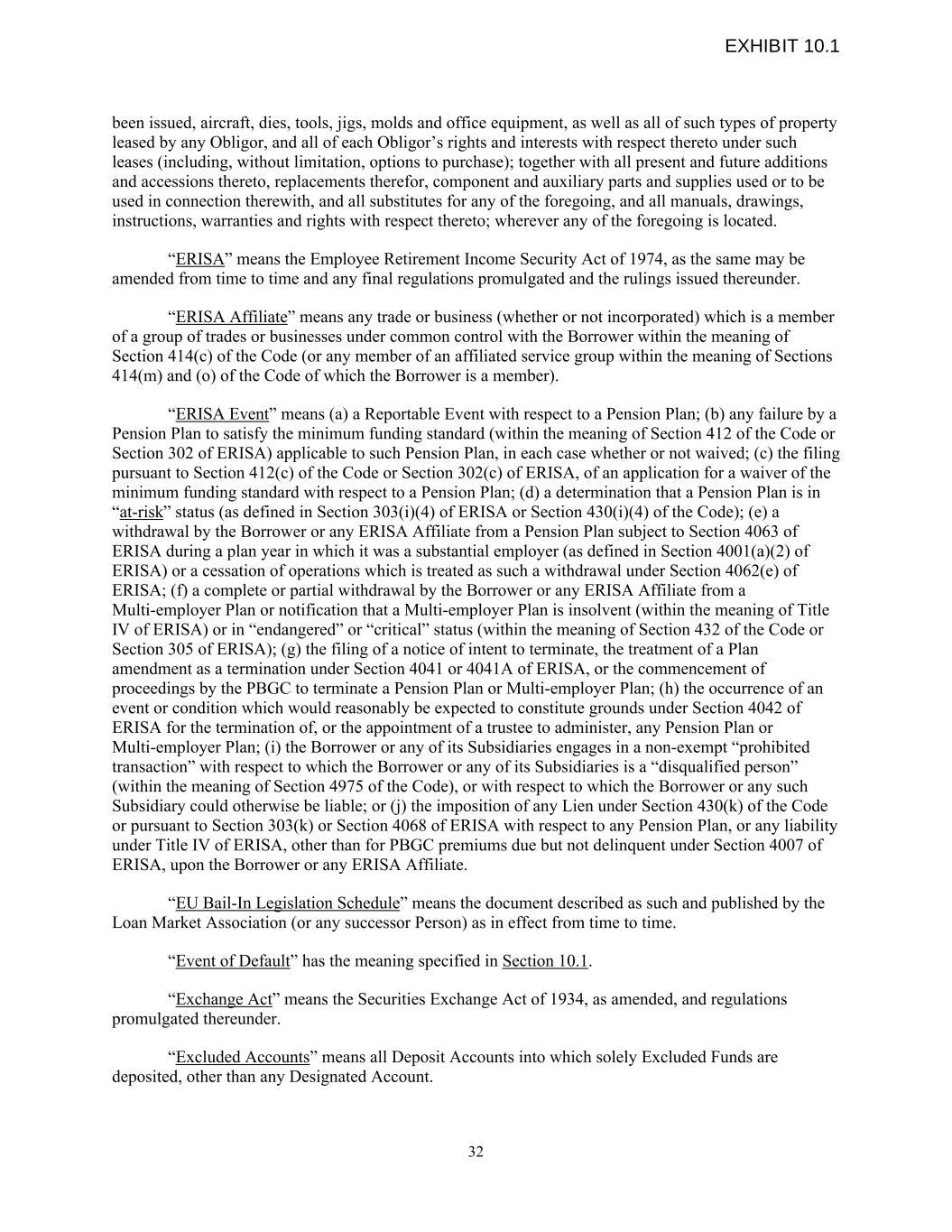 been issued, aircraft, dies, tools, jigs, molds and office equipment, as well as all of such types of property leased by any Obligor, and all of each Obligor’s rights and interests with respect thereto under such leases (including, without limitation, options to purchase); together with all present and future additions and accessions thereto, replacements therefor, component and auxiliary parts and supplies used or to be used in connection therewith, and all substitutes for any of the foregoing, and all manuals, drawings, instructions, warranties and rights with respect thereto; wherever any of the foregoing is located. “ERISA” means the Employee Retirement Income Security Act of 1974, as the same may be amended from time to time and any final regulations promulgated and the rulings issued thereunder. “ERISA Affiliate” means any trade or business (whether or not incorporated) which is a member of a group of trades or businesses under common control with the Borrower within the meaning of Section 414(c) of the Code (or any member of an affiliated service group within the meaning of Sections 414(m) and (o) of the Code of which the Borrower is a member). “ERISA Event” means (a) a Reportable Event with respect to a Pension Plan; (b) any failure by a Pension Plan to satisfy the minimum funding standard (within the meaning of Section 412 of the Code or Section 302 of ERISA) applicable to such Pension Plan, in each case whether or not waived; (c) the filing pursuant to Section 412(c) of the Code or Section 302(c) of ERISA, of an application for a waiver of the minimum funding standard with respect to a Pension Plan; (d) a determination that a Pension Plan is in “at-risk” status (as defined in Section 303(i)(4) of ERISA or Section 430(i)(4) of the Code); (e) a withdrawal by the Borrower or any ERISA Affiliate from a Pension Plan subject to Section 4063 of ERISA during a plan year in which it was a substantial employer (as defined in Section 4001(a)(2) of ERISA) or a cessation of operations which is treated as such a withdrawal under Section 4062(e) of ERISA; (f) a complete or partial withdrawal by the Borrower or any ERISA Affiliate from a Multi-employer Plan or notification that a Multi-employer Plan is insolvent (within the meaning of Title IV of ERISA) or in “endangered” or “critical” status (within the meaning of Section 432 of the Code or Section 305 of ERISA); (g) the filing of a notice of intent to terminate, the treatment of a Plan amendment as a termination under Section 4041 or 4041A of ERISA, or the commencement of proceedings by the PBGC to terminate a Pension Plan or Multi-employer Plan; (h) the occurrence of an event or condition which would reasonably be expected to constitute grounds under Section 4042 of ERISA for the termination of, or the appointment of a trustee to administer, any Pension Plan or Multi-employer Plan; (i) the Borrower or any of its Subsidiaries engages in a non-exempt “prohibited transaction” with respect to which the Borrower or any of its Subsidiaries is a “disqualified person” (within the meaning of Section 4975 of the Code), or with respect to which the Borrower or any such Subsidiary could otherwise be liable; or (j) the imposition of any Lien under Section 430(k) of the Code or pursuant to Section 303(k) or Section 4068 of ERISA with respect to any Pension Plan, or any liability under Title IV of ERISA, other than for PBGC premiums due but not delinquent under Section 4007 of ERISA, upon the Borrower or any ERISA Affiliate. “EU Bail-In Legislation Schedule” means the document described as such and published by the Loan Market Association (or any successor Person) as in effect from time to time. “Event of Default” has the meaning specified in Section 10.1. “Exchange Act” means the Securities Exchange Act of 1934, as amended, and regulations promulgated thereunder. “Excluded Accounts” means all Deposit Accounts into which solely Excluded Funds are deposited, other than any Designated Account. 32 EXHIBIT 10.1