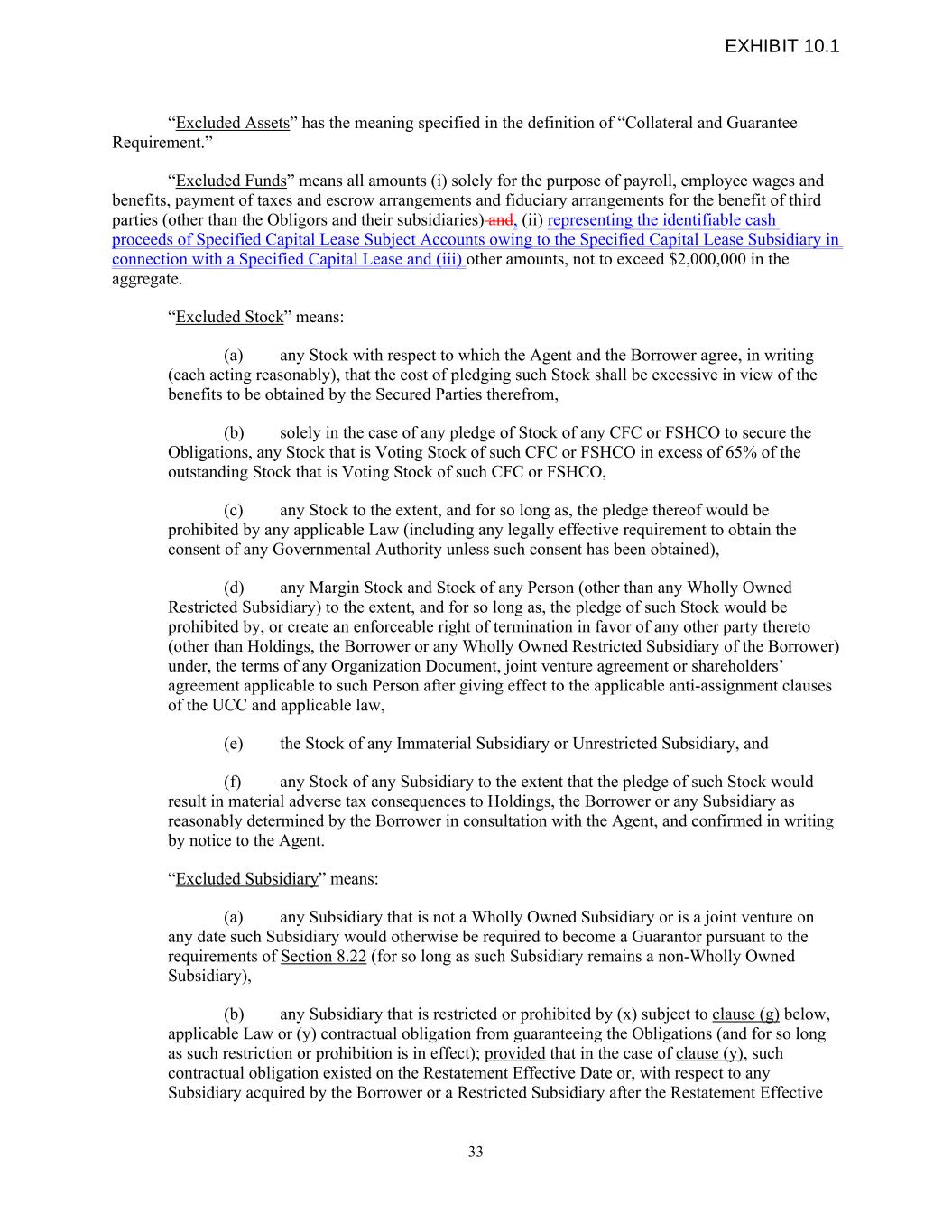 “Excluded Assets” has the meaning specified in the definition of “Collateral and Guarantee Requirement.” “Excluded Funds” means all amounts (i) solely for the purpose of payroll, employee wages and benefits, payment of taxes and escrow arrangements and fiduciary arrangements for the benefit of third parties (other than the Obligors and their subsidiaries) and, (ii) representing the identifiable cash proceeds of Specified Capital Lease Subject Accounts owing to the Specified Capital Lease Subsidiary in connection with a Specified Capital Lease and (iii) other amounts, not to exceed $2,000,000 in the aggregate. “Excluded Stock” means: (a) any Stock with respect to which the Agent and the Borrower agree, in writing (each acting reasonably), that the cost of pledging such Stock shall be excessive in view of the benefits to be obtained by the Secured Parties therefrom, (b) solely in the case of any pledge of Stock of any CFC or FSHCO to secure the Obligations, any Stock that is Voting Stock of such CFC or FSHCO in excess of 65% of the outstanding Stock that is Voting Stock of such CFC or FSHCO, (c) any Stock to the extent, and for so long as, the pledge thereof would be prohibited by any applicable Law (including any legally effective requirement to obtain the consent of any Governmental Authority unless such consent has been obtained), (d) any Margin Stock and Stock of any Person (other than any Wholly Owned Restricted Subsidiary) to the extent, and for so long as, the pledge of such Stock would be prohibited by, or create an enforceable right of termination in favor of any other party thereto (other than Holdings, the Borrower or any Wholly Owned Restricted Subsidiary of the Borrower) under, the terms of any Organization Document, joint venture agreement or shareholders’ agreement applicable to such Person after giving effect to the applicable anti-assignment clauses of the UCC and applicable law, (e) the Stock of any Immaterial Subsidiary or Unrestricted Subsidiary, and (f) any Stock of any Subsidiary to the extent that the pledge of such Stock would result in material adverse tax consequences to Holdings, the Borrower or any Subsidiary as reasonably determined by the Borrower in consultation with the Agent, and confirmed in writing by notice to the Agent. “Excluded Subsidiary” means: (a) any Subsidiary that is not a Wholly Owned Subsidiary or is a joint venture on any date such Subsidiary would otherwise be required to become a Guarantor pursuant to the requirements of Section 8.22 (for so long as such Subsidiary remains a non-Wholly Owned Subsidiary), (b) any Subsidiary that is restricted or prohibited by (x) subject to clause (g) below, applicable Law or (y) contractual obligation from guaranteeing the Obligations (and for so long as such restriction or prohibition is in effect); provided that in the case of clause (y), such contractual obligation existed on the Restatement Effective Date or, with respect to any Subsidiary acquired by the Borrower or a Restricted Subsidiary after the Restatement Effective 33 EXHIBIT 10.1