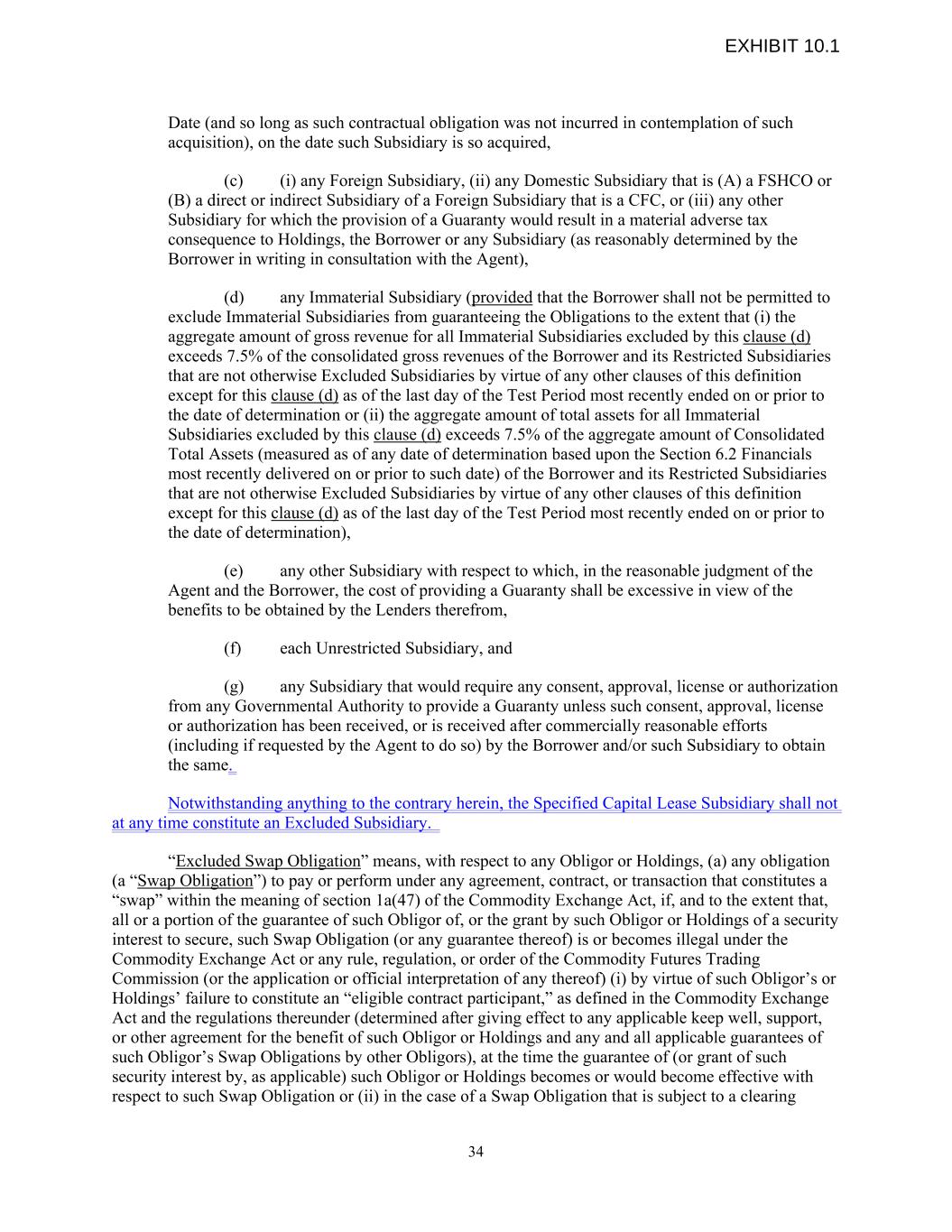 Date (and so long as such contractual obligation was not incurred in contemplation of such acquisition), on the date such Subsidiary is so acquired, (c) (i) any Foreign Subsidiary, (ii) any Domestic Subsidiary that is (A) a FSHCO or (B) a direct or indirect Subsidiary of a Foreign Subsidiary that is a CFC, or (iii) any other Subsidiary for which the provision of a Guaranty would result in a material adverse tax consequence to Holdings, the Borrower or any Subsidiary (as reasonably determined by the Borrower in writing in consultation with the Agent), (d) any Immaterial Subsidiary (provided that the Borrower shall not be permitted to exclude Immaterial Subsidiaries from guaranteeing the Obligations to the extent that (i) the aggregate amount of gross revenue for all Immaterial Subsidiaries excluded by this clause (d) exceeds 7.5% of the consolidated gross revenues of the Borrower and its Restricted Subsidiaries that are not otherwise Excluded Subsidiaries by virtue of any other clauses of this definition except for this clause (d) as of the last day of the Test Period most recently ended on or prior to the date of determination or (ii) the aggregate amount of total assets for all Immaterial Subsidiaries excluded by this clause (d) exceeds 7.5% of the aggregate amount of Consolidated Total Assets (measured as of any date of determination based upon the Section 6.2 Financials most recently delivered on or prior to such date) of the Borrower and its Restricted Subsidiaries that are not otherwise Excluded Subsidiaries by virtue of any other clauses of this definition except for this clause (d) as of the last day of the Test Period most recently ended on or prior to the date of determination), (e) any other Subsidiary with respect to which, in the reasonable judgment of the Agent and the Borrower, the cost of providing a Guaranty shall be excessive in view of the benefits to be obtained by the Lenders therefrom, (f) each Unrestricted Subsidiary, and (g) any Subsidiary that would require any consent, approval, license or authorization from any Governmental Authority to provide a Guaranty unless such consent, approval, license or authorization has been received, or is received after commercially reasonable efforts (including if requested by the Agent to do so) by the Borrower and/or such Subsidiary to obtain the same. Notwithstanding anything to the contrary herein, the Specified Capital Lease Subsidiary shall not at any time constitute an Excluded Subsidiary. “Excluded Swap Obligation” means, with respect to any Obligor or Holdings, (a) any obligation (a “Swap Obligation”) to pay or perform under any agreement, contract, or transaction that constitutes a “swap” within the meaning of section 1a(47) of the Commodity Exchange Act, if, and to the extent that, all or a portion of the guarantee of such Obligor of, or the grant by such Obligor or Holdings of a security interest to secure, such Swap Obligation (or any guarantee thereof) is or becomes illegal under the Commodity Exchange Act or any rule, regulation, or order of the Commodity Futures Trading Commission (or the application or official interpretation of any thereof) (i) by virtue of such Obligor’s or Holdings’ failure to constitute an “eligible contract participant,” as defined in the Commodity Exchange Act and the regulations thereunder (determined after giving effect to any applicable keep well, support, or other agreement for the benefit of such Obligor or Holdings and any and all applicable guarantees of such Obligor’s Swap Obligations by other Obligors), at the time the guarantee of (or grant of such security interest by, as applicable) such Obligor or Holdings becomes or would become effective with respect to such Swap Obligation or (ii) in the case of a Swap Obligation that is subject to a clearing 34 EXHIBIT 10.1