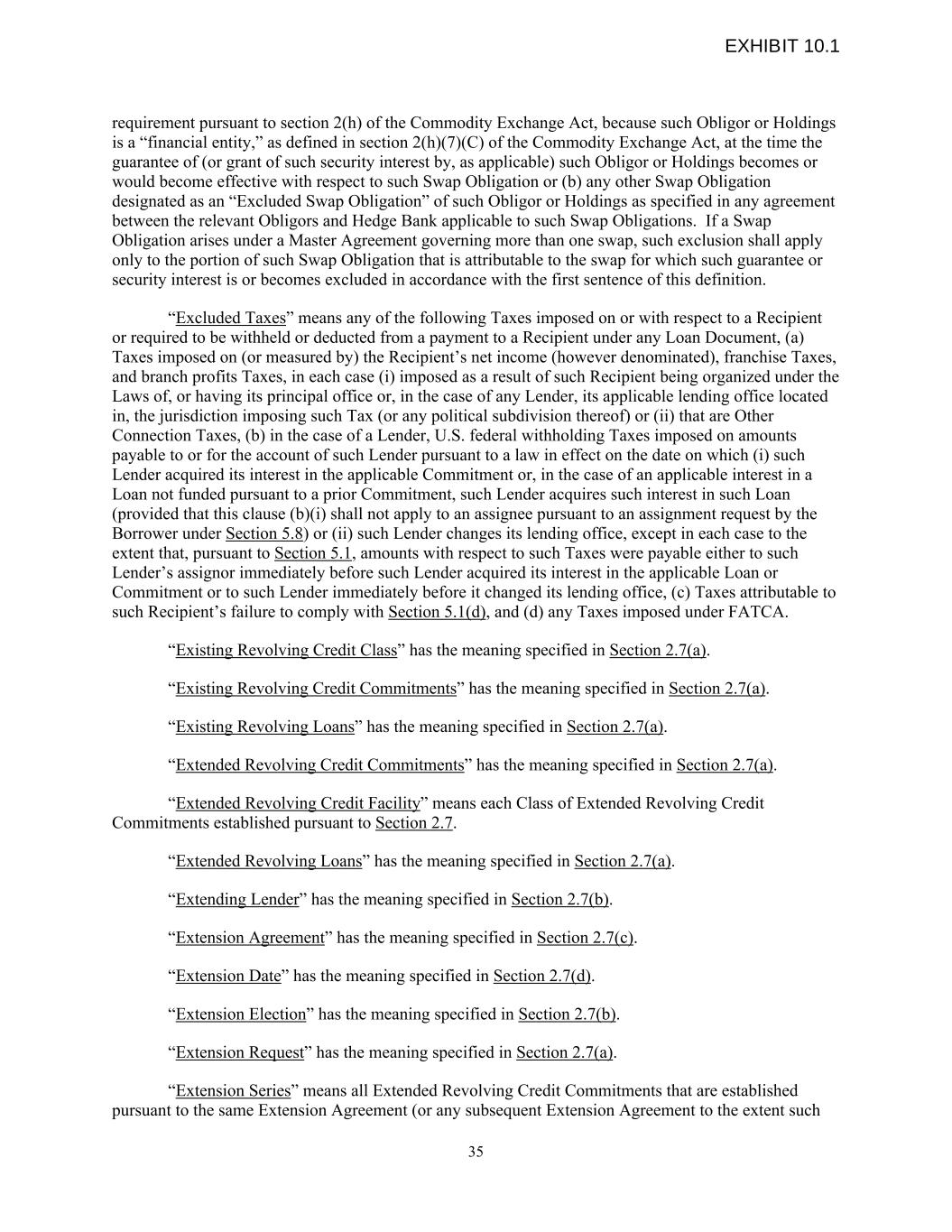 requirement pursuant to section 2(h) of the Commodity Exchange Act, because such Obligor or Holdings is a “financial entity,” as defined in section 2(h)(7)(C) of the Commodity Exchange Act, at the time the guarantee of (or grant of such security interest by, as applicable) such Obligor or Holdings becomes or would become effective with respect to such Swap Obligation or (b) any other Swap Obligation designated as an “Excluded Swap Obligation” of such Obligor or Holdings as specified in any agreement between the relevant Obligors and Hedge Bank applicable to such Swap Obligations. If a Swap Obligation arises under a Master Agreement governing more than one swap, such exclusion shall apply only to the portion of such Swap Obligation that is attributable to the swap for which such guarantee or security interest is or becomes excluded in accordance with the first sentence of this definition. “Excluded Taxes” means any of the following Taxes imposed on or with respect to a Recipient or required to be withheld or deducted from a payment to a Recipient under any Loan Document, (a) Taxes imposed on (or measured by) the Recipient’s net income (however denominated), franchise Taxes, and branch profits Taxes, in each case (i) imposed as a result of such Recipient being organized under the Laws of, or having its principal office or, in the case of any Lender, its applicable lending office located in, the jurisdiction imposing such Tax (or any political subdivision thereof) or (ii) that are Other Connection Taxes, (b) in the case of a Lender, U.S. federal withholding Taxes imposed on amounts payable to or for the account of such Lender pursuant to a law in effect on the date on which (i) such Lender acquired its interest in the applicable Commitment or, in the case of an applicable interest in a Loan not funded pursuant to a prior Commitment, such Lender acquires such interest in such Loan (provided that this clause (b)(i) shall not apply to an assignee pursuant to an assignment request by the Borrower under Section 5.8) or (ii) such Lender changes its lending office, except in each case to the extent that, pursuant to Section 5.1, amounts with respect to such Taxes were payable either to such Lender’s assignor immediately before such Lender acquired its interest in the applicable Loan or Commitment or to such Lender immediately before it changed its lending office, (c) Taxes attributable to such Recipient’s failure to comply with Section 5.1(d), and (d) any Taxes imposed under FATCA. “Existing Revolving Credit Class” has the meaning specified in Section 2.7(a). “Existing Revolving Credit Commitments” has the meaning specified in Section 2.7(a). “Existing Revolving Loans” has the meaning specified in Section 2.7(a). “Extended Revolving Credit Commitments” has the meaning specified in Section 2.7(a). “Extended Revolving Credit Facility” means each Class of Extended Revolving Credit Commitments established pursuant to Section 2.7. “Extended Revolving Loans” has the meaning specified in Section 2.7(a). “Extending Lender” has the meaning specified in Section 2.7(b). “Extension Agreement” has the meaning specified in Section 2.7(c). “Extension Date” has the meaning specified in Section 2.7(d). “Extension Election” has the meaning specified in Section 2.7(b). “Extension Request” has the meaning specified in Section 2.7(a). “Extension Series” means all Extended Revolving Credit Commitments that are established pursuant to the same Extension Agreement (or any subsequent Extension Agreement to the extent such 35 EXHIBIT 10.1