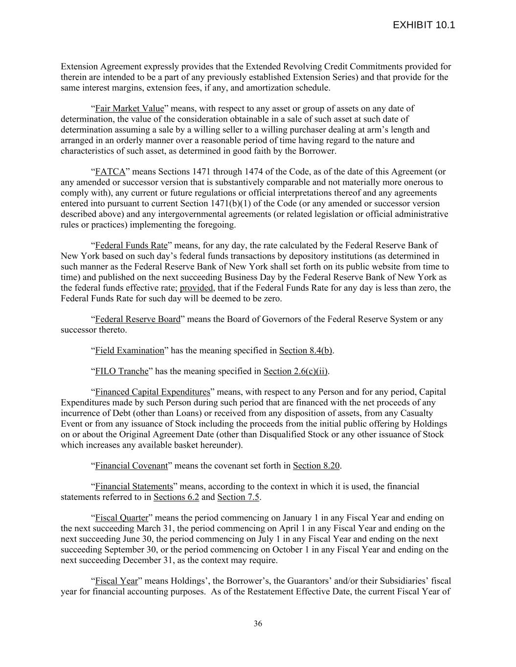 Extension Agreement expressly provides that the Extended Revolving Credit Commitments provided for therein are intended to be a part of any previously established Extension Series) and that provide for the same interest margins, extension fees, if any, and amortization schedule. “Fair Market Value” means, with respect to any asset or group of assets on any date of determination, the value of the consideration obtainable in a sale of such asset at such date of determination assuming a sale by a willing seller to a willing purchaser dealing at arm’s length and arranged in an orderly manner over a reasonable period of time having regard to the nature and characteristics of such asset, as determined in good faith by the Borrower. “FATCA” means Sections 1471 through 1474 of the Code, as of the date of this Agreement (or any amended or successor version that is substantively comparable and not materially more onerous to comply with), any current or future regulations or official interpretations thereof and any agreements entered into pursuant to current Section 1471(b)(1) of the Code (or any amended or successor version described above) and any intergovernmental agreements (or related legislation or official administrative rules or practices) implementing the foregoing. “Federal Funds Rate” means, for any day, the rate calculated by the Federal Reserve Bank of New York based on such day’s federal funds transactions by depository institutions (as determined in such manner as the Federal Reserve Bank of New York shall set forth on its public website from time to time) and published on the next succeeding Business Day by the Federal Reserve Bank of New York as the federal funds effective rate; provided, that if the Federal Funds Rate for any day is less than zero, the Federal Funds Rate for such day will be deemed to be zero. “Federal Reserve Board” means the Board of Governors of the Federal Reserve System or any successor thereto. “Field Examination” has the meaning specified in Section 8.4(b). “FILO Tranche” has the meaning specified in Section 2.6(c)(ii). “Financed Capital Expenditures” means, with respect to any Person and for any period, Capital Expenditures made by such Person during such period that are financed with the net proceeds of any incurrence of Debt (other than Loans) or received from any disposition of assets, from any Casualty Event or from any issuance of Stock including the proceeds from the initial public offering by Holdings on or about the Original Agreement Date (other than Disqualified Stock or any other issuance of Stock which increases any available basket hereunder). “Financial Covenant” means the covenant set forth in Section 8.20. “Financial Statements” means, according to the context in which it is used, the financial statements referred to in Sections 6.2 and Section 7.5. “Fiscal Quarter” means the period commencing on January 1 in any Fiscal Year and ending on the next succeeding March 31, the period commencing on April 1 in any Fiscal Year and ending on the next succeeding June 30, the period commencing on July 1 in any Fiscal Year and ending on the next succeeding September 30, or the period commencing on October 1 in any Fiscal Year and ending on the next succeeding December 31, as the context may require. “Fiscal Year” means Holdings’, the Borrower’s, the Guarantors’ and/or their Subsidiaries’ fiscal year for financial accounting purposes. As of the Restatement Effective Date, the current Fiscal Year of 36 EXHIBIT 10.1