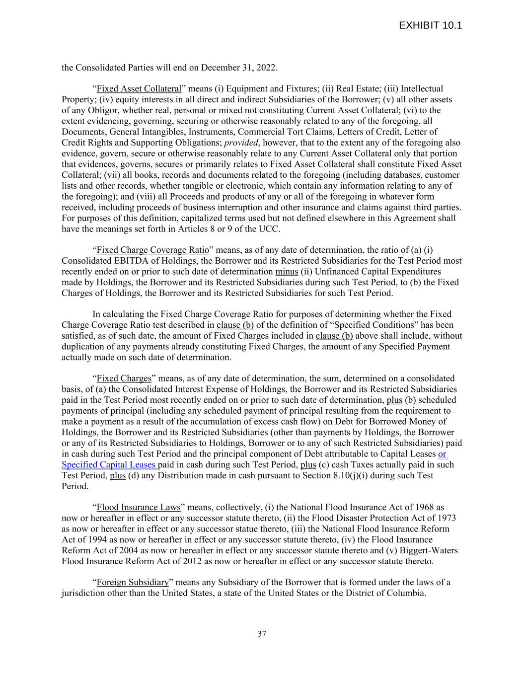 the Consolidated Parties will end on December 31, 2022. “Fixed Asset Collateral” means (i) Equipment and Fixtures; (ii) Real Estate; (iii) Intellectual Property; (iv) equity interests in all direct and indirect Subsidiaries of the Borrower; (v) all other assets of any Obligor, whether real, personal or mixed not constituting Current Asset Collateral; (vi) to the extent evidencing, governing, securing or otherwise reasonably related to any of the foregoing, all Documents, General Intangibles, Instruments, Commercial Tort Claims, Letters of Credit, Letter of Credit Rights and Supporting Obligations; provided, however, that to the extent any of the foregoing also evidence, govern, secure or otherwise reasonably relate to any Current Asset Collateral only that portion that evidences, governs, secures or primarily relates to Fixed Asset Collateral shall constitute Fixed Asset Collateral; (vii) all books, records and documents related to the foregoing (including databases, customer lists and other records, whether tangible or electronic, which contain any information relating to any of the foregoing); and (viii) all Proceeds and products of any or all of the foregoing in whatever form received, including proceeds of business interruption and other insurance and claims against third parties. For purposes of this definition, capitalized terms used but not defined elsewhere in this Agreement shall have the meanings set forth in Articles 8 or 9 of the UCC. “Fixed Charge Coverage Ratio” means, as of any date of determination, the ratio of (a) (i) Consolidated EBITDA of Holdings, the Borrower and its Restricted Subsidiaries for the Test Period most recently ended on or prior to such date of determination minus (ii) Unfinanced Capital Expenditures made by Holdings, the Borrower and its Restricted Subsidiaries during such Test Period, to (b) the Fixed Charges of Holdings, the Borrower and its Restricted Subsidiaries for such Test Period. In calculating the Fixed Charge Coverage Ratio for purposes of determining whether the Fixed Charge Coverage Ratio test described in clause (b) of the definition of “Specified Conditions” has been satisfied, as of such date, the amount of Fixed Charges included in clause (b) above shall include, without duplication of any payments already constituting Fixed Charges, the amount of any Specified Payment actually made on such date of determination. “Fixed Charges” means, as of any date of determination, the sum, determined on a consolidated basis, of (a) the Consolidated Interest Expense of Holdings, the Borrower and its Restricted Subsidiaries paid in the Test Period most recently ended on or prior to such date of determination, plus (b) scheduled payments of principal (including any scheduled payment of principal resulting from the requirement to make a payment as a result of the accumulation of excess cash flow) on Debt for Borrowed Money of Holdings, the Borrower and its Restricted Subsidiaries (other than payments by Holdings, the Borrower or any of its Restricted Subsidiaries to Holdings, Borrower or to any of such Restricted Subsidiaries) paid in cash during such Test Period and the principal component of Debt attributable to Capital Leases or Specified Capital Leases paid in cash during such Test Period, plus (c) cash Taxes actually paid in such Test Period, plus (d) any Distribution made in cash pursuant to Section 8.10(j)(i) during such Test Period. “Flood Insurance Laws” means, collectively, (i) the National Flood Insurance Act of 1968 as now or hereafter in effect or any successor statute thereto, (ii) the Flood Disaster Protection Act of 1973 as now or hereafter in effect or any successor statue thereto, (iii) the National Flood Insurance Reform Act of 1994 as now or hereafter in effect or any successor statute thereto, (iv) the Flood Insurance Reform Act of 2004 as now or hereafter in effect or any successor statute thereto and (v) Biggert-Waters Flood Insurance Reform Act of 2012 as now or hereafter in effect or any successor statute thereto. “Foreign Subsidiary” means any Subsidiary of the Borrower that is formed under the laws of a jurisdiction other than the United States, a state of the United States or the District of Columbia. 37 EXHIBIT 10.1