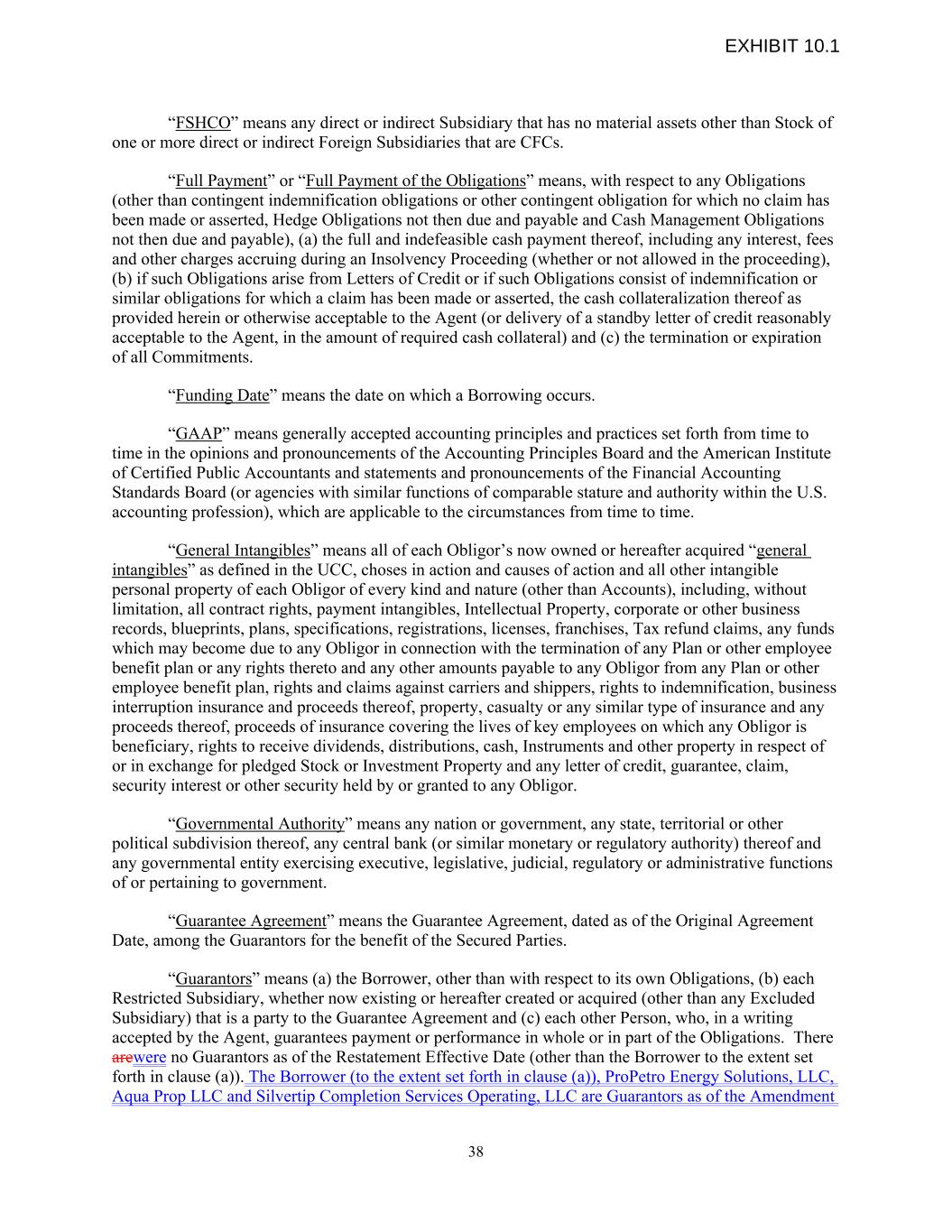 “FSHCO” means any direct or indirect Subsidiary that has no material assets other than Stock of one or more direct or indirect Foreign Subsidiaries that are CFCs. “Full Payment” or “Full Payment of the Obligations” means, with respect to any Obligations (other than contingent indemnification obligations or other contingent obligation for which no claim has been made or asserted, Hedge Obligations not then due and payable and Cash Management Obligations not then due and payable), (a) the full and indefeasible cash payment thereof, including any interest, fees and other charges accruing during an Insolvency Proceeding (whether or not allowed in the proceeding), (b) if such Obligations arise from Letters of Credit or if such Obligations consist of indemnification or similar obligations for which a claim has been made or asserted, the cash collateralization thereof as provided herein or otherwise acceptable to the Agent (or delivery of a standby letter of credit reasonably acceptable to the Agent, in the amount of required cash collateral) and (c) the termination or expiration of all Commitments. “Funding Date” means the date on which a Borrowing occurs. “GAAP” means generally accepted accounting principles and practices set forth from time to time in the opinions and pronouncements of the Accounting Principles Board and the American Institute of Certified Public Accountants and statements and pronouncements of the Financial Accounting Standards Board (or agencies with similar functions of comparable stature and authority within the U.S. accounting profession), which are applicable to the circumstances from time to time. “General Intangibles” means all of each Obligor’s now owned or hereafter acquired “general intangibles” as defined in the UCC, choses in action and causes of action and all other intangible personal property of each Obligor of every kind and nature (other than Accounts), including, without limitation, all contract rights, payment intangibles, Intellectual Property, corporate or other business records, blueprints, plans, specifications, registrations, licenses, franchises, Tax refund claims, any funds which may become due to any Obligor in connection with the termination of any Plan or other employee benefit plan or any rights thereto and any other amounts payable to any Obligor from any Plan or other employee benefit plan, rights and claims against carriers and shippers, rights to indemnification, business interruption insurance and proceeds thereof, property, casualty or any similar type of insurance and any proceeds thereof, proceeds of insurance covering the lives of key employees on which any Obligor is beneficiary, rights to receive dividends, distributions, cash, Instruments and other property in respect of or in exchange for pledged Stock or Investment Property and any letter of credit, guarantee, claim, security interest or other security held by or granted to any Obligor. “Governmental Authority” means any nation or government, any state, territorial or other political subdivision thereof, any central bank (or similar monetary or regulatory authority) thereof and any governmental entity exercising executive, legislative, judicial, regulatory or administrative functions of or pertaining to government. “Guarantee Agreement” means the Guarantee Agreement, dated as of the Original Agreement Date, among the Guarantors for the benefit of the Secured Parties. “Guarantors” means (a) the Borrower, other than with respect to its own Obligations, (b) each Restricted Subsidiary, whether now existing or hereafter created or acquired (other than any Excluded Subsidiary) that is a party to the Guarantee Agreement and (c) each other Person, who, in a writing accepted by the Agent, guarantees payment or performance in whole or in part of the Obligations. There arewere no Guarantors as of the Restatement Effective Date (other than the Borrower to the extent set forth in clause (a)). The Borrower (to the extent set forth in clause (a)), ProPetro Energy Solutions, LLC, Aqua Prop LLC and Silvertip Completion Services Operating, LLC are Guarantors as of the Amendment 38 EXHIBIT 10.1