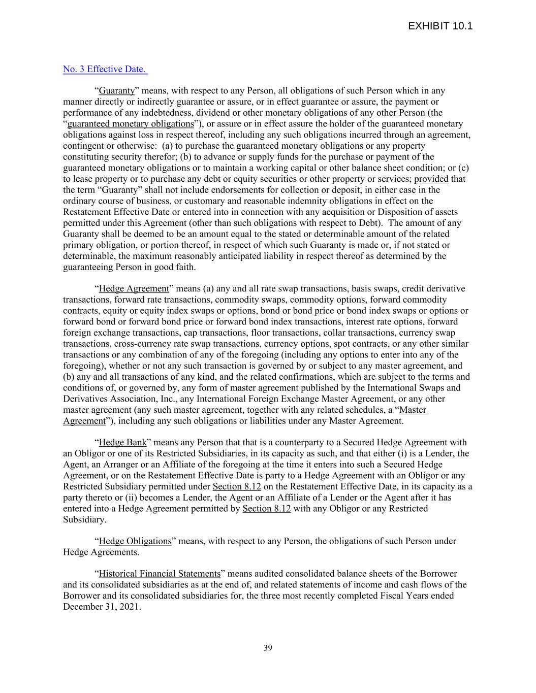 No. 3 Effective Date. “Guaranty” means, with respect to any Person, all obligations of such Person which in any manner directly or indirectly guarantee or assure, or in effect guarantee or assure, the payment or performance of any indebtedness, dividend or other monetary obligations of any other Person (the “guaranteed monetary obligations”), or assure or in effect assure the holder of the guaranteed monetary obligations against loss in respect thereof, including any such obligations incurred through an agreement, contingent or otherwise: (a) to purchase the guaranteed monetary obligations or any property constituting security therefor; (b) to advance or supply funds for the purchase or payment of the guaranteed monetary obligations or to maintain a working capital or other balance sheet condition; or (c) to lease property or to purchase any debt or equity securities or other property or services; provided that the term “Guaranty” shall not include endorsements for collection or deposit, in either case in the ordinary course of business, or customary and reasonable indemnity obligations in effect on the Restatement Effective Date or entered into in connection with any acquisition or Disposition of assets permitted under this Agreement (other than such obligations with respect to Debt). The amount of any Guaranty shall be deemed to be an amount equal to the stated or determinable amount of the related primary obligation, or portion thereof, in respect of which such Guaranty is made or, if not stated or determinable, the maximum reasonably anticipated liability in respect thereof as determined by the guaranteeing Person in good faith. “Hedge Agreement” means (a) any and all rate swap transactions, basis swaps, credit derivative transactions, forward rate transactions, commodity swaps, commodity options, forward commodity contracts, equity or equity index swaps or options, bond or bond price or bond index swaps or options or forward bond or forward bond price or forward bond index transactions, interest rate options, forward foreign exchange transactions, cap transactions, floor transactions, collar transactions, currency swap transactions, cross-currency rate swap transactions, currency options, spot contracts, or any other similar transactions or any combination of any of the foregoing (including any options to enter into any of the foregoing), whether or not any such transaction is governed by or subject to any master agreement, and (b) any and all transactions of any kind, and the related confirmations, which are subject to the terms and conditions of, or governed by, any form of master agreement published by the International Swaps and Derivatives Association, Inc., any International Foreign Exchange Master Agreement, or any other master agreement (any such master agreement, together with any related schedules, a “Master Agreement”), including any such obligations or liabilities under any Master Agreement. “Hedge Bank” means any Person that that is a counterparty to a Secured Hedge Agreement with an Obligor or one of its Restricted Subsidiaries, in its capacity as such, and that either (i) is a Lender, the Agent, an Arranger or an Affiliate of the foregoing at the time it enters into such a Secured Hedge Agreement, or on the Restatement Effective Date is party to a Hedge Agreement with an Obligor or any Restricted Subsidiary permitted under Section 8.12 on the Restatement Effective Date, in its capacity as a party thereto or (ii) becomes a Lender, the Agent or an Affiliate of a Lender or the Agent after it has entered into a Hedge Agreement permitted by Section 8.12 with any Obligor or any Restricted Subsidiary. “Hedge Obligations” means, with respect to any Person, the obligations of such Person under Hedge Agreements. “Historical Financial Statements” means audited consolidated balance sheets of the Borrower and its consolidated subsidiaries as at the end of, and related statements of income and cash flows of the Borrower and its consolidated subsidiaries for, the three most recently completed Fiscal Years ended December 31, 2021. 39 EXHIBIT 10.1