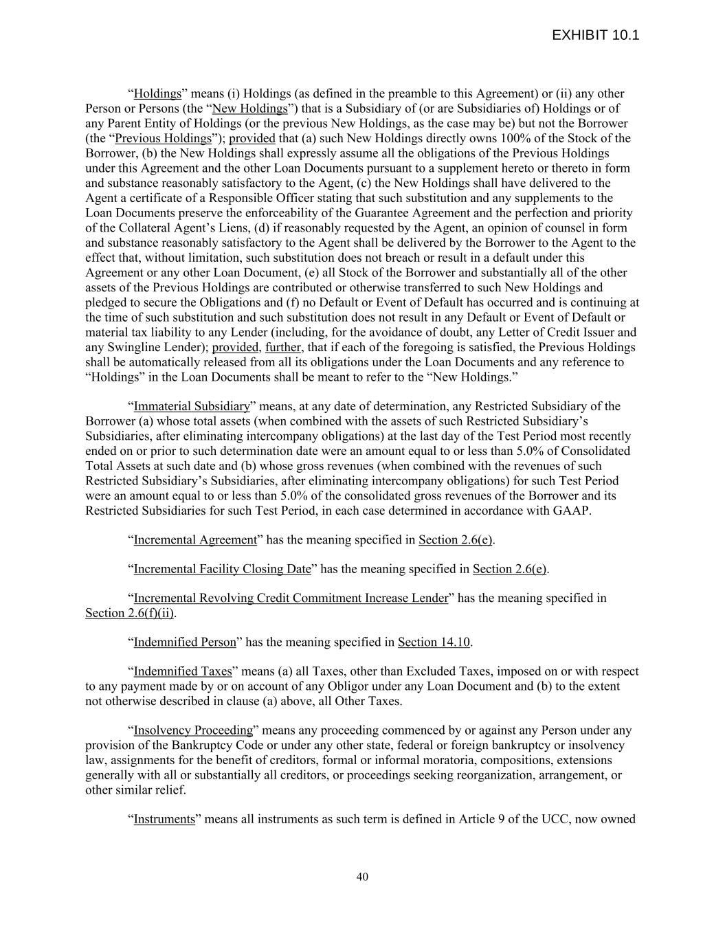 “Holdings” means (i) Holdings (as defined in the preamble to this Agreement) or (ii) any other Person or Persons (the “New Holdings”) that is a Subsidiary of (or are Subsidiaries of) Holdings or of any Parent Entity of Holdings (or the previous New Holdings, as the case may be) but not the Borrower (the “Previous Holdings”); provided that (a) such New Holdings directly owns 100% of the Stock of the Borrower, (b) the New Holdings shall expressly assume all the obligations of the Previous Holdings under this Agreement and the other Loan Documents pursuant to a supplement hereto or thereto in form and substance reasonably satisfactory to the Agent, (c) the New Holdings shall have delivered to the Agent a certificate of a Responsible Officer stating that such substitution and any supplements to the Loan Documents preserve the enforceability of the Guarantee Agreement and the perfection and priority of the Collateral Agent’s Liens, (d) if reasonably requested by the Agent, an opinion of counsel in form and substance reasonably satisfactory to the Agent shall be delivered by the Borrower to the Agent to the effect that, without limitation, such substitution does not breach or result in a default under this Agreement or any other Loan Document, (e) all Stock of the Borrower and substantially all of the other assets of the Previous Holdings are contributed or otherwise transferred to such New Holdings and pledged to secure the Obligations and (f) no Default or Event of Default has occurred and is continuing at the time of such substitution and such substitution does not result in any Default or Event of Default or material tax liability to any Lender (including, for the avoidance of doubt, any Letter of Credit Issuer and any Swingline Lender); provided, further, that if each of the foregoing is satisfied, the Previous Holdings shall be automatically released from all its obligations under the Loan Documents and any reference to “Holdings” in the Loan Documents shall be meant to refer to the “New Holdings.” “Immaterial Subsidiary” means, at any date of determination, any Restricted Subsidiary of the Borrower (a) whose total assets (when combined with the assets of such Restricted Subsidiary’s Subsidiaries, after eliminating intercompany obligations) at the last day of the Test Period most recently ended on or prior to such determination date were an amount equal to or less than 5.0% of Consolidated Total Assets at such date and (b) whose gross revenues (when combined with the revenues of such Restricted Subsidiary’s Subsidiaries, after eliminating intercompany obligations) for such Test Period were an amount equal to or less than 5.0% of the consolidated gross revenues of the Borrower and its Restricted Subsidiaries for such Test Period, in each case determined in accordance with GAAP. “Incremental Agreement” has the meaning specified in Section 2.6(e). “Incremental Facility Closing Date” has the meaning specified in Section 2.6(e). “Incremental Revolving Credit Commitment Increase Lender” has the meaning specified in Section 2.6(f)(ii). “Indemnified Person” has the meaning specified in Section 14.10. “Indemnified Taxes” means (a) all Taxes, other than Excluded Taxes, imposed on or with respect to any payment made by or on account of any Obligor under any Loan Document and (b) to the extent not otherwise described in clause (a) above, all Other Taxes. “Insolvency Proceeding” means any proceeding commenced by or against any Person under any provision of the Bankruptcy Code or under any other state, federal or foreign bankruptcy or insolvency law, assignments for the benefit of creditors, formal or informal moratoria, compositions, extensions generally with all or substantially all creditors, or proceedings seeking reorganization, arrangement, or other similar relief. “Instruments” means all instruments as such term is defined in Article 9 of the UCC, now owned 40 EXHIBIT 10.1