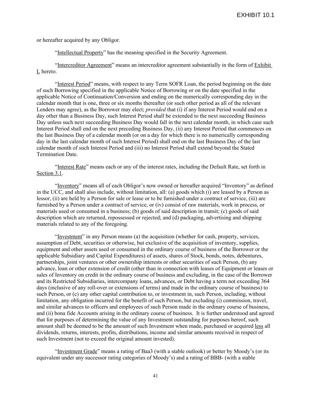 or hereafter acquired by any Obligor. “Intellectual Property” has the meaning specified in the Security Agreement. “Intercreditor Agreement” means an intercreditor agreement substantially in the form of Exhibit L hereto. “Interest Period” means, with respect to any Term SOFR Loan, the period beginning on the date of such Borrowing specified in the applicable Notice of Borrowing or on the date specified in the applicable Notice of Continuation/Conversion and ending on the numerically corresponding day in the calendar month that is one, three or six months thereafter (or such other period as all of the relevant Lenders may agree), as the Borrower may elect; provided that (i) if any Interest Period would end on a day other than a Business Day, such Interest Period shall be extended to the next succeeding Business Day unless such next succeeding Business Day would fall in the next calendar month, in which case such Interest Period shall end on the next preceding Business Day, (ii) any Interest Period that commences on the last Business Day of a calendar month (or on a day for which there is no numerically corresponding day in the last calendar month of such Interest Period) shall end on the last Business Day of the last calendar month of such Interest Period and (iii) no Interest Period shall extend beyond the Stated Termination Date. “Interest Rate” means each or any of the interest rates, including the Default Rate, set forth in Section 3.1. “Inventory” means all of each Obligor’s now owned or hereafter acquired “Inventory” as defined in the UCC, and shall also include, without limitation, all: (a) goods which (i) are leased by a Person as lessor, (ii) are held by a Person for sale or lease or to be furnished under a contract of service, (iii) are furnished by a Person under a contract of service, or (iv) consist of raw materials, work in process, or materials used or consumed in a business; (b) goods of said description in transit; (c) goods of said description which are returned, repossessed or rejected; and (d) packaging, advertising and shipping materials related to any of the foregoing. “Investment” in any Person means (a) the acquisition (whether for cash, property, services, assumption of Debt, securities or otherwise, but exclusive of the acquisition of inventory, supplies, equipment and other assets used or consumed in the ordinary course of business of the Borrower or the applicable Subsidiary and Capital Expenditures) of assets, shares of Stock, bonds, notes, debentures, partnerships, joint ventures or other ownership interests or other securities of such Person, (b) any advance, loan or other extension of credit (other than in connection with leases of Equipment or leases or sales of Inventory on credit in the ordinary course of business and excluding, in the case of the Borrower and its Restricted Subsidiaries, intercompany loans, advances, or Debt having a term not exceeding 364 days (inclusive of any roll-over or extensions of terms) and made in the ordinary course of business) to such Person, or (c) any other capital contribution to, or investment in, such Person, including, without limitation, any obligation incurred for the benefit of such Person, but excluding (i) commission, travel, and similar advances to officers and employees of such Person made in the ordinary course of business, and (ii) bona fide Accounts arising in the ordinary course of business. It is further understood and agreed that for purposes of determining the value of any Investment outstanding for purposes hereof, such amount shall be deemed to be the amount of such Investment when made, purchased or acquired less all dividends, returns, interests, profits, distributions, income and similar amounts received in respect of such Investment (not to exceed the original amount invested). “Investment Grade” means a rating of Baa3 (with a stable outlook) or better by Moody’s (or its equivalent under any successor rating categories of Moody’s) and a rating of BBB- (with a stable 41 EXHIBIT 10.1
