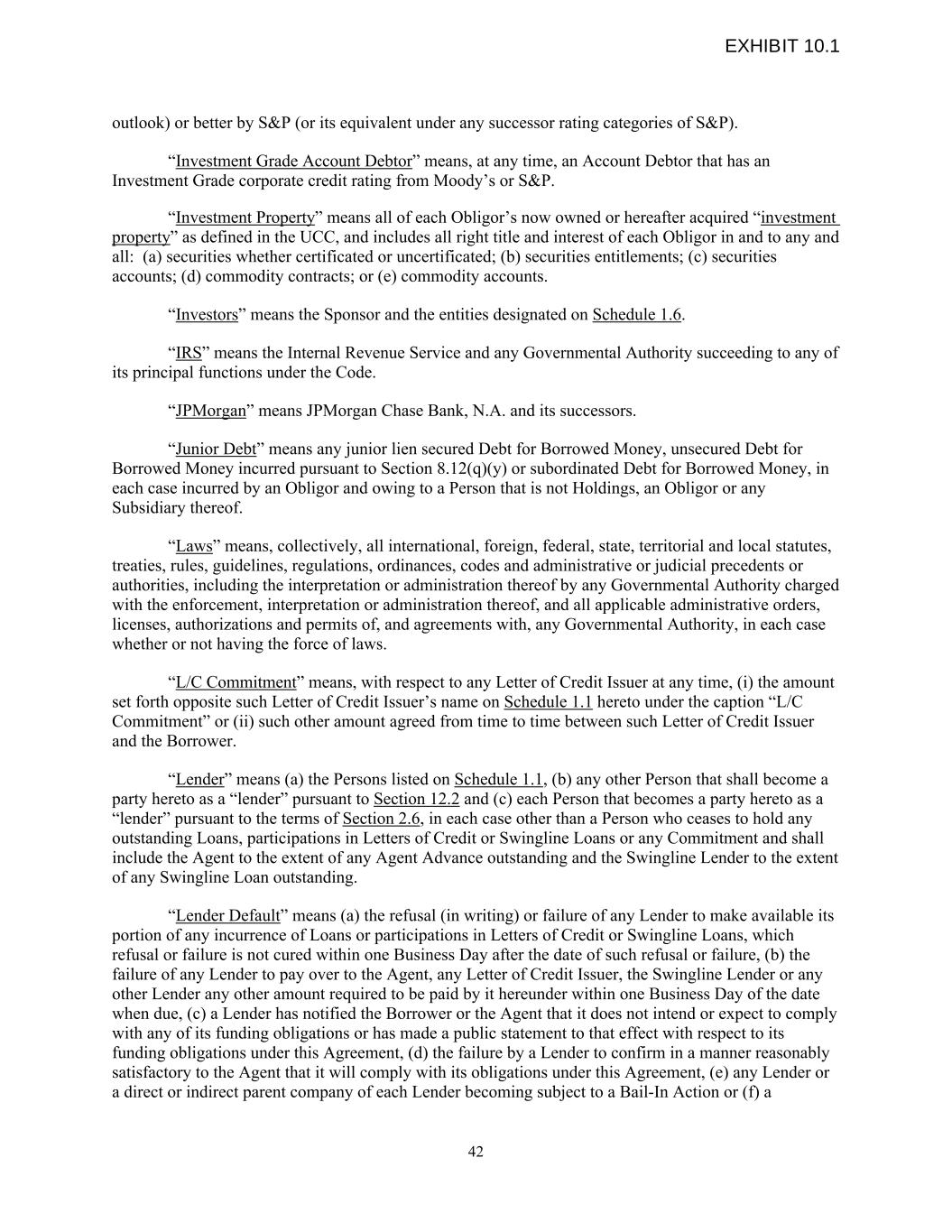 outlook) or better by S&P (or its equivalent under any successor rating categories of S&P). “Investment Grade Account Debtor” means, at any time, an Account Debtor that has an Investment Grade corporate credit rating from Moody’s or S&P. “Investment Property” means all of each Obligor’s now owned or hereafter acquired “investment property” as defined in the UCC, and includes all right title and interest of each Obligor in and to any and all: (a) securities whether certificated or uncertificated; (b) securities entitlements; (c) securities accounts; (d) commodity contracts; or (e) commodity accounts. “Investors” means the Sponsor and the entities designated on Schedule 1.6. “IRS” means the Internal Revenue Service and any Governmental Authority succeeding to any of its principal functions under the Code. “JPMorgan” means JPMorgan Chase Bank, N.A. and its successors. “Junior Debt” means any junior lien secured Debt for Borrowed Money, unsecured Debt for Borrowed Money incurred pursuant to Section 8.12(q)(y) or subordinated Debt for Borrowed Money, in each case incurred by an Obligor and owing to a Person that is not Holdings, an Obligor or any Subsidiary thereof. “Laws” means, collectively, all international, foreign, federal, state, territorial and local statutes, treaties, rules, guidelines, regulations, ordinances, codes and administrative or judicial precedents or authorities, including the interpretation or administration thereof by any Governmental Authority charged with the enforcement, interpretation or administration thereof, and all applicable administrative orders, licenses, authorizations and permits of, and agreements with, any Governmental Authority, in each case whether or not having the force of laws. “L/C Commitment” means, with respect to any Letter of Credit Issuer at any time, (i) the amount set forth opposite such Letter of Credit Issuer’s name on Schedule 1.1 hereto under the caption “L/C Commitment” or (ii) such other amount agreed from time to time between such Letter of Credit Issuer and the Borrower. “Lender” means (a) the Persons listed on Schedule 1.1, (b) any other Person that shall become a party hereto as a “lender” pursuant to Section 12.2 and (c) each Person that becomes a party hereto as a “lender” pursuant to the terms of Section 2.6, in each case other than a Person who ceases to hold any outstanding Loans, participations in Letters of Credit or Swingline Loans or any Commitment and shall include the Agent to the extent of any Agent Advance outstanding and the Swingline Lender to the extent of any Swingline Loan outstanding. “Lender Default” means (a) the refusal (in writing) or failure of any Lender to make available its portion of any incurrence of Loans or participations in Letters of Credit or Swingline Loans, which refusal or failure is not cured within one Business Day after the date of such refusal or failure, (b) the failure of any Lender to pay over to the Agent, any Letter of Credit Issuer, the Swingline Lender or any other Lender any other amount required to be paid by it hereunder within one Business Day of the date when due, (c) a Lender has notified the Borrower or the Agent that it does not intend or expect to comply with any of its funding obligations or has made a public statement to that effect with respect to its funding obligations under this Agreement, (d) the failure by a Lender to confirm in a manner reasonably satisfactory to the Agent that it will comply with its obligations under this Agreement, (e) any Lender or a direct or indirect parent company of each Lender becoming subject to a Bail-In Action or (f) a 42 EXHIBIT 10.1