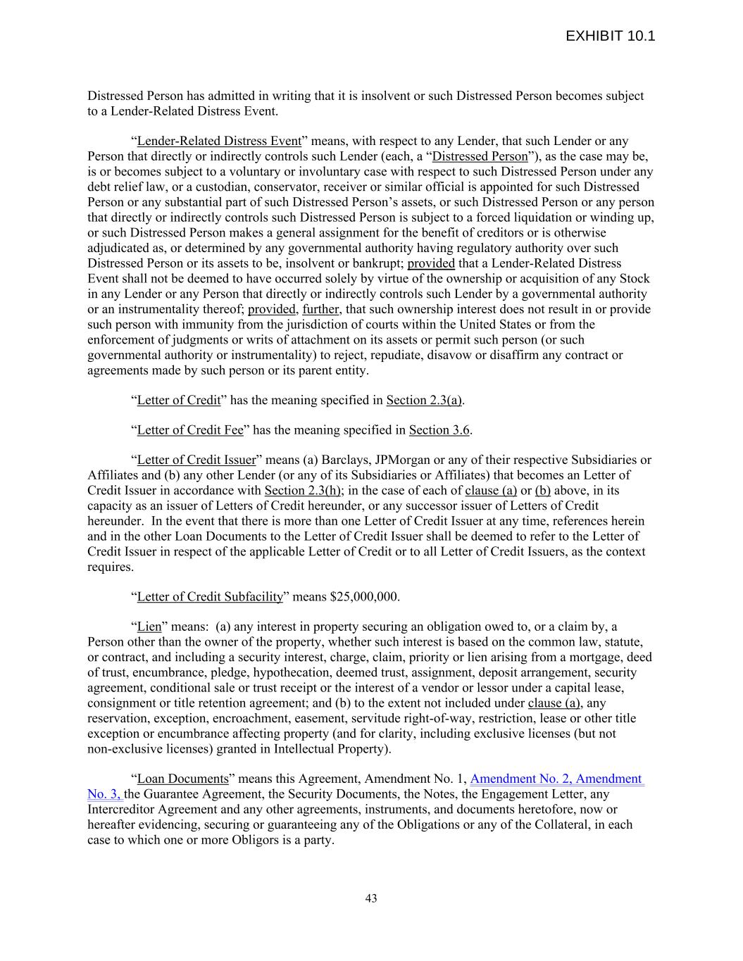 Distressed Person has admitted in writing that it is insolvent or such Distressed Person becomes subject to a Lender-Related Distress Event. “Lender-Related Distress Event” means, with respect to any Lender, that such Lender or any Person that directly or indirectly controls such Lender (each, a “Distressed Person”), as the case may be, is or becomes subject to a voluntary or involuntary case with respect to such Distressed Person under any debt relief law, or a custodian, conservator, receiver or similar official is appointed for such Distressed Person or any substantial part of such Distressed Person’s assets, or such Distressed Person or any person that directly or indirectly controls such Distressed Person is subject to a forced liquidation or winding up, or such Distressed Person makes a general assignment for the benefit of creditors or is otherwise adjudicated as, or determined by any governmental authority having regulatory authority over such Distressed Person or its assets to be, insolvent or bankrupt; provided that a Lender-Related Distress Event shall not be deemed to have occurred solely by virtue of the ownership or acquisition of any Stock in any Lender or any Person that directly or indirectly controls such Lender by a governmental authority or an instrumentality thereof; provided, further, that such ownership interest does not result in or provide such person with immunity from the jurisdiction of courts within the United States or from the enforcement of judgments or writs of attachment on its assets or permit such person (or such governmental authority or instrumentality) to reject, repudiate, disavow or disaffirm any contract or agreements made by such person or its parent entity. “Letter of Credit” has the meaning specified in Section 2.3(a). “Letter of Credit Fee” has the meaning specified in Section 3.6. “Letter of Credit Issuer” means (a) Barclays, JPMorgan or any of their respective Subsidiaries or Affiliates and (b) any other Lender (or any of its Subsidiaries or Affiliates) that becomes an Letter of Credit Issuer in accordance with Section 2.3(h); in the case of each of clause (a) or (b) above, in its capacity as an issuer of Letters of Credit hereunder, or any successor issuer of Letters of Credit hereunder. In the event that there is more than one Letter of Credit Issuer at any time, references herein and in the other Loan Documents to the Letter of Credit Issuer shall be deemed to refer to the Letter of Credit Issuer in respect of the applicable Letter of Credit or to all Letter of Credit Issuers, as the context requires. “Letter of Credit Subfacility” means $25,000,000. “Lien” means: (a) any interest in property securing an obligation owed to, or a claim by, a Person other than the owner of the property, whether such interest is based on the common law, statute, or contract, and including a security interest, charge, claim, priority or lien arising from a mortgage, deed of trust, encumbrance, pledge, hypothecation, deemed trust, assignment, deposit arrangement, security agreement, conditional sale or trust receipt or the interest of a vendor or lessor under a capital lease, consignment or title retention agreement; and (b) to the extent not included under clause (a), any reservation, exception, encroachment, easement, servitude right-of-way, restriction, lease or other title exception or encumbrance affecting property (and for clarity, including exclusive licenses (but not non-exclusive licenses) granted in Intellectual Property). “Loan Documents” means this Agreement, Amendment No. 1, Amendment No. 2, Amendment No. 3, the Guarantee Agreement, the Security Documents, the Notes, the Engagement Letter, any Intercreditor Agreement and any other agreements, instruments, and documents heretofore, now or hereafter evidencing, securing or guaranteeing any of the Obligations or any of the Collateral, in each case to which one or more Obligors is a party. 43 EXHIBIT 10.1