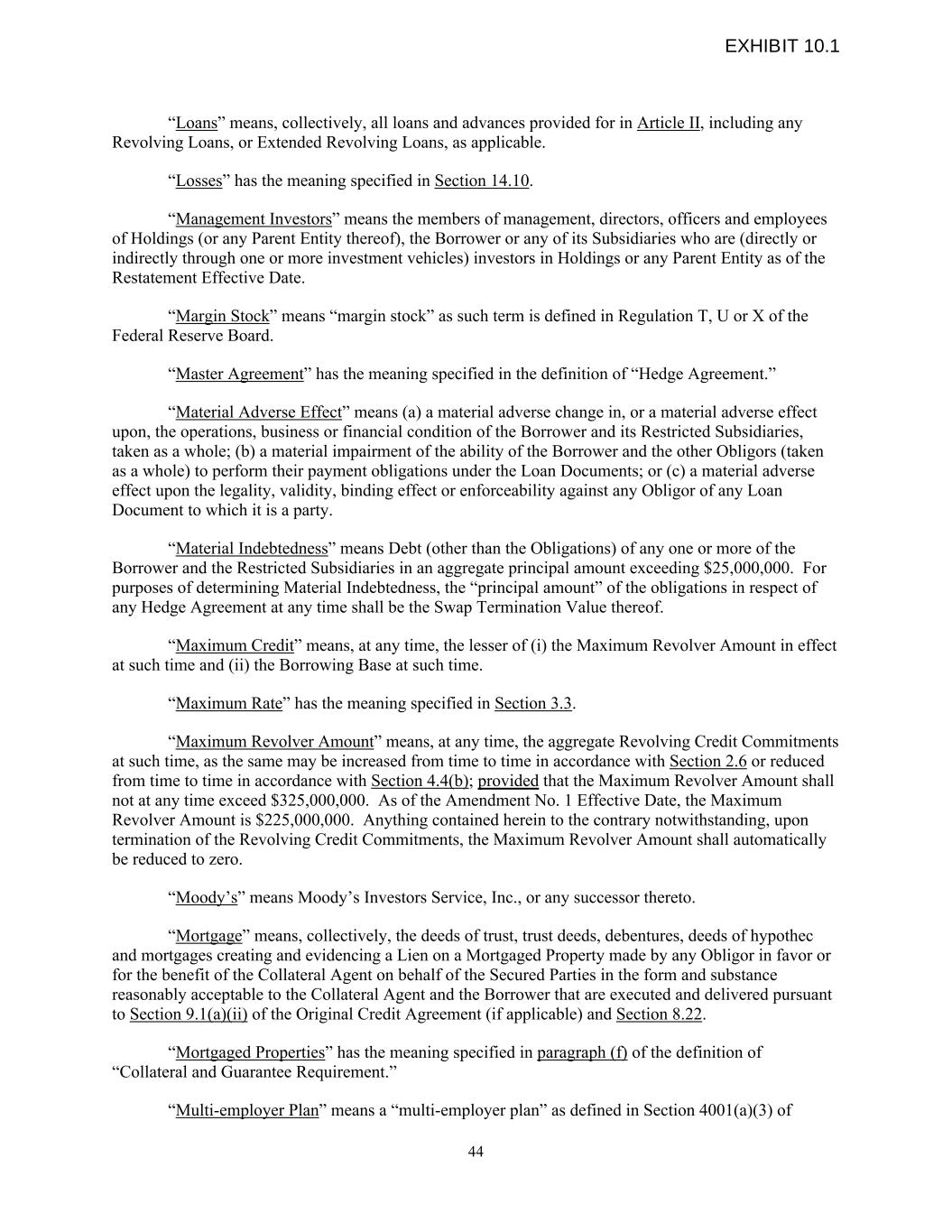 “Loans” means, collectively, all loans and advances provided for in Article II, including any Revolving Loans, or Extended Revolving Loans, as applicable. “Losses” has the meaning specified in Section 14.10. “Management Investors” means the members of management, directors, officers and employees of Holdings (or any Parent Entity thereof), the Borrower or any of its Subsidiaries who are (directly or indirectly through one or more investment vehicles) investors in Holdings or any Parent Entity as of the Restatement Effective Date. “Margin Stock” means “margin stock” as such term is defined in Regulation T, U or X of the Federal Reserve Board. “Master Agreement” has the meaning specified in the definition of “Hedge Agreement.” “Material Adverse Effect” means (a) a material adverse change in, or a material adverse effect upon, the operations, business or financial condition of the Borrower and its Restricted Subsidiaries, taken as a whole; (b) a material impairment of the ability of the Borrower and the other Obligors (taken as a whole) to perform their payment obligations under the Loan Documents; or (c) a material adverse effect upon the legality, validity, binding effect or enforceability against any Obligor of any Loan Document to which it is a party. “Material Indebtedness” means Debt (other than the Obligations) of any one or more of the Borrower and the Restricted Subsidiaries in an aggregate principal amount exceeding $25,000,000. For purposes of determining Material Indebtedness, the “principal amount” of the obligations in respect of any Hedge Agreement at any time shall be the Swap Termination Value thereof. “Maximum Credit” means, at any time, the lesser of (i) the Maximum Revolver Amount in effect at such time and (ii) the Borrowing Base at such time. “Maximum Rate” has the meaning specified in Section 3.3. “Maximum Revolver Amount” means, at any time, the aggregate Revolving Credit Commitments at such time, as the same may be increased from time to time in accordance with Section 2.6 or reduced from time to time in accordance with Section 4.4(b); provided that the Maximum Revolver Amount shall not at any time exceed $325,000,000. As of the Amendment No. 1 Effective Date, the Maximum Revolver Amount is $225,000,000. Anything contained herein to the contrary notwithstanding, upon termination of the Revolving Credit Commitments, the Maximum Revolver Amount shall automatically be reduced to zero. “Moody’s” means Moody’s Investors Service, Inc., or any successor thereto. “Mortgage” means, collectively, the deeds of trust, trust deeds, debentures, deeds of hypothec and mortgages creating and evidencing a Lien on a Mortgaged Property made by any Obligor in favor or for the benefit of the Collateral Agent on behalf of the Secured Parties in the form and substance reasonably acceptable to the Collateral Agent and the Borrower that are executed and delivered pursuant to Section 9.1(a)(ii) of the Original Credit Agreement (if applicable) and Section 8.22. “Mortgaged Properties” has the meaning specified in paragraph (f) of the definition of “Collateral and Guarantee Requirement.” “Multi-employer Plan” means a “multi-employer plan” as defined in Section 4001(a)(3) of 44 EXHIBIT 10.1