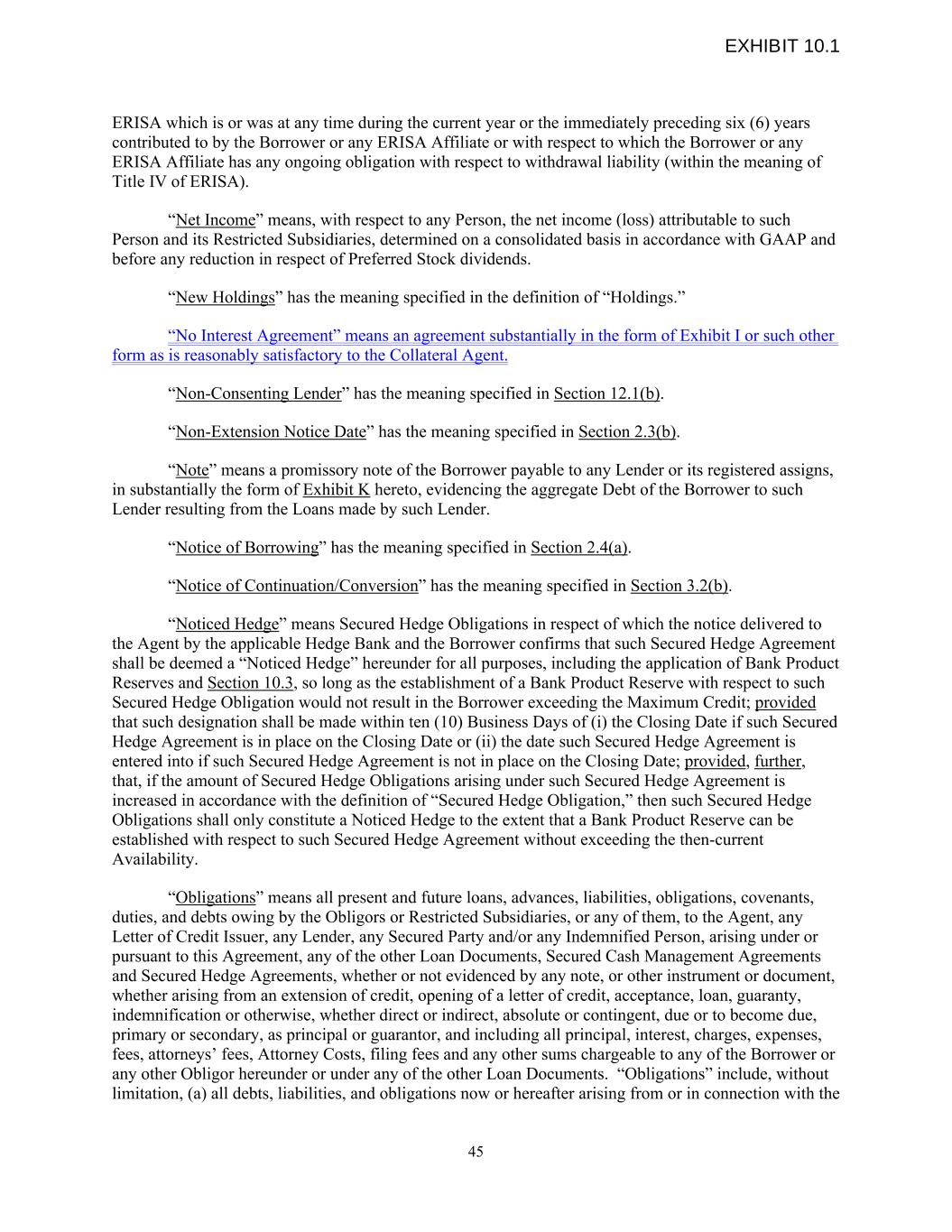 ERISA which is or was at any time during the current year or the immediately preceding six (6) years contributed to by the Borrower or any ERISA Affiliate or with respect to which the Borrower or any ERISA Affiliate has any ongoing obligation with respect to withdrawal liability (within the meaning of Title IV of ERISA). “Net Income” means, with respect to any Person, the net income (loss) attributable to such Person and its Restricted Subsidiaries, determined on a consolidated basis in accordance with GAAP and before any reduction in respect of Preferred Stock dividends. “New Holdings” has the meaning specified in the definition of “Holdings.” “No Interest Agreement” means an agreement substantially in the form of Exhibit I or such other form as is reasonably satisfactory to the Collateral Agent. “Non-Consenting Lender” has the meaning specified in Section 12.1(b). “Non-Extension Notice Date” has the meaning specified in Section 2.3(b). “Note” means a promissory note of the Borrower payable to any Lender or its registered assigns, in substantially the form of Exhibit K hereto, evidencing the aggregate Debt of the Borrower to such Lender resulting from the Loans made by such Lender. “Notice of Borrowing” has the meaning specified in Section 2.4(a). “Notice of Continuation/Conversion” has the meaning specified in Section 3.2(b). “Noticed Hedge” means Secured Hedge Obligations in respect of which the notice delivered to the Agent by the applicable Hedge Bank and the Borrower confirms that such Secured Hedge Agreement shall be deemed a “Noticed Hedge” hereunder for all purposes, including the application of Bank Product Reserves and Section 10.3, so long as the establishment of a Bank Product Reserve with respect to such Secured Hedge Obligation would not result in the Borrower exceeding the Maximum Credit; provided that such designation shall be made within ten (10) Business Days of (i) the Closing Date if such Secured Hedge Agreement is in place on the Closing Date or (ii) the date such Secured Hedge Agreement is entered into if such Secured Hedge Agreement is not in place on the Closing Date; provided, further, that, if the amount of Secured Hedge Obligations arising under such Secured Hedge Agreement is increased in accordance with the definition of “Secured Hedge Obligation,” then such Secured Hedge Obligations shall only constitute a Noticed Hedge to the extent that a Bank Product Reserve can be established with respect to such Secured Hedge Agreement without exceeding the then-current Availability. “Obligations” means all present and future loans, advances, liabilities, obligations, covenants, duties, and debts owing by the Obligors or Restricted Subsidiaries, or any of them, to the Agent, any Letter of Credit Issuer, any Lender, any Secured Party and/or any Indemnified Person, arising under or pursuant to this Agreement, any of the other Loan Documents, Secured Cash Management Agreements and Secured Hedge Agreements, whether or not evidenced by any note, or other instrument or document, whether arising from an extension of credit, opening of a letter of credit, acceptance, loan, guaranty, indemnification or otherwise, whether direct or indirect, absolute or contingent, due or to become due, primary or secondary, as principal or guarantor, and including all principal, interest, charges, expenses, fees, attorneys’ fees, Attorney Costs, filing fees and any other sums chargeable to any of the Borrower or any other Obligor hereunder or under any of the other Loan Documents. “Obligations” include, without limitation, (a) all debts, liabilities, and obligations now or hereafter arising from or in connection with the 45 EXHIBIT 10.1