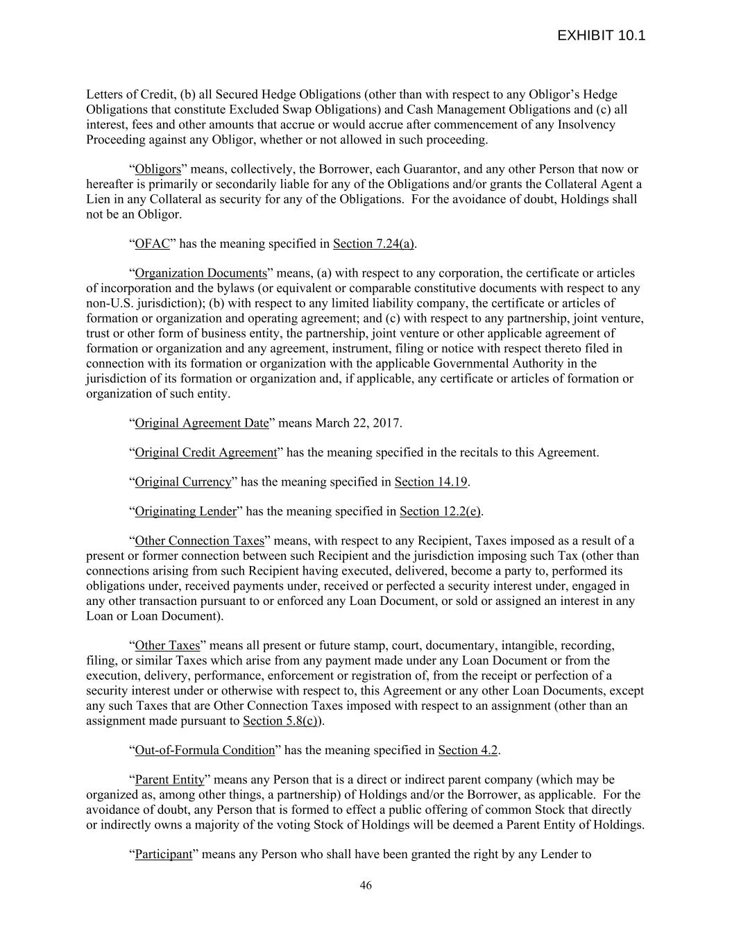 Letters of Credit, (b) all Secured Hedge Obligations (other than with respect to any Obligor’s Hedge Obligations that constitute Excluded Swap Obligations) and Cash Management Obligations and (c) all interest, fees and other amounts that accrue or would accrue after commencement of any Insolvency Proceeding against any Obligor, whether or not allowed in such proceeding. “Obligors” means, collectively, the Borrower, each Guarantor, and any other Person that now or hereafter is primarily or secondarily liable for any of the Obligations and/or grants the Collateral Agent a Lien in any Collateral as security for any of the Obligations. For the avoidance of doubt, Holdings shall not be an Obligor. “OFAC” has the meaning specified in Section 7.24(a). “Organization Documents” means, (a) with respect to any corporation, the certificate or articles of incorporation and the bylaws (or equivalent or comparable constitutive documents with respect to any non-U.S. jurisdiction); (b) with respect to any limited liability company, the certificate or articles of formation or organization and operating agreement; and (c) with respect to any partnership, joint venture, trust or other form of business entity, the partnership, joint venture or other applicable agreement of formation or organization and any agreement, instrument, filing or notice with respect thereto filed in connection with its formation or organization with the applicable Governmental Authority in the jurisdiction of its formation or organization and, if applicable, any certificate or articles of formation or organization of such entity. “Original Agreement Date” means March 22, 2017. “Original Credit Agreement” has the meaning specified in the recitals to this Agreement. “Original Currency” has the meaning specified in Section 14.19. “Originating Lender” has the meaning specified in Section 12.2(e). “Other Connection Taxes” means, with respect to any Recipient, Taxes imposed as a result of a present or former connection between such Recipient and the jurisdiction imposing such Tax (other than connections arising from such Recipient having executed, delivered, become a party to, performed its obligations under, received payments under, received or perfected a security interest under, engaged in any other transaction pursuant to or enforced any Loan Document, or sold or assigned an interest in any Loan or Loan Document). “Other Taxes” means all present or future stamp, court, documentary, intangible, recording, filing, or similar Taxes which arise from any payment made under any Loan Document or from the execution, delivery, performance, enforcement or registration of, from the receipt or perfection of a security interest under or otherwise with respect to, this Agreement or any other Loan Documents, except any such Taxes that are Other Connection Taxes imposed with respect to an assignment (other than an assignment made pursuant to Section 5.8(c)). “Out-of-Formula Condition” has the meaning specified in Section 4.2. “Parent Entity” means any Person that is a direct or indirect parent company (which may be organized as, among other things, a partnership) of Holdings and/or the Borrower, as applicable. For the avoidance of doubt, any Person that is formed to effect a public offering of common Stock that directly or indirectly owns a majority of the voting Stock of Holdings will be deemed a Parent Entity of Holdings. “Participant” means any Person who shall have been granted the right by any Lender to 46 EXHIBIT 10.1
