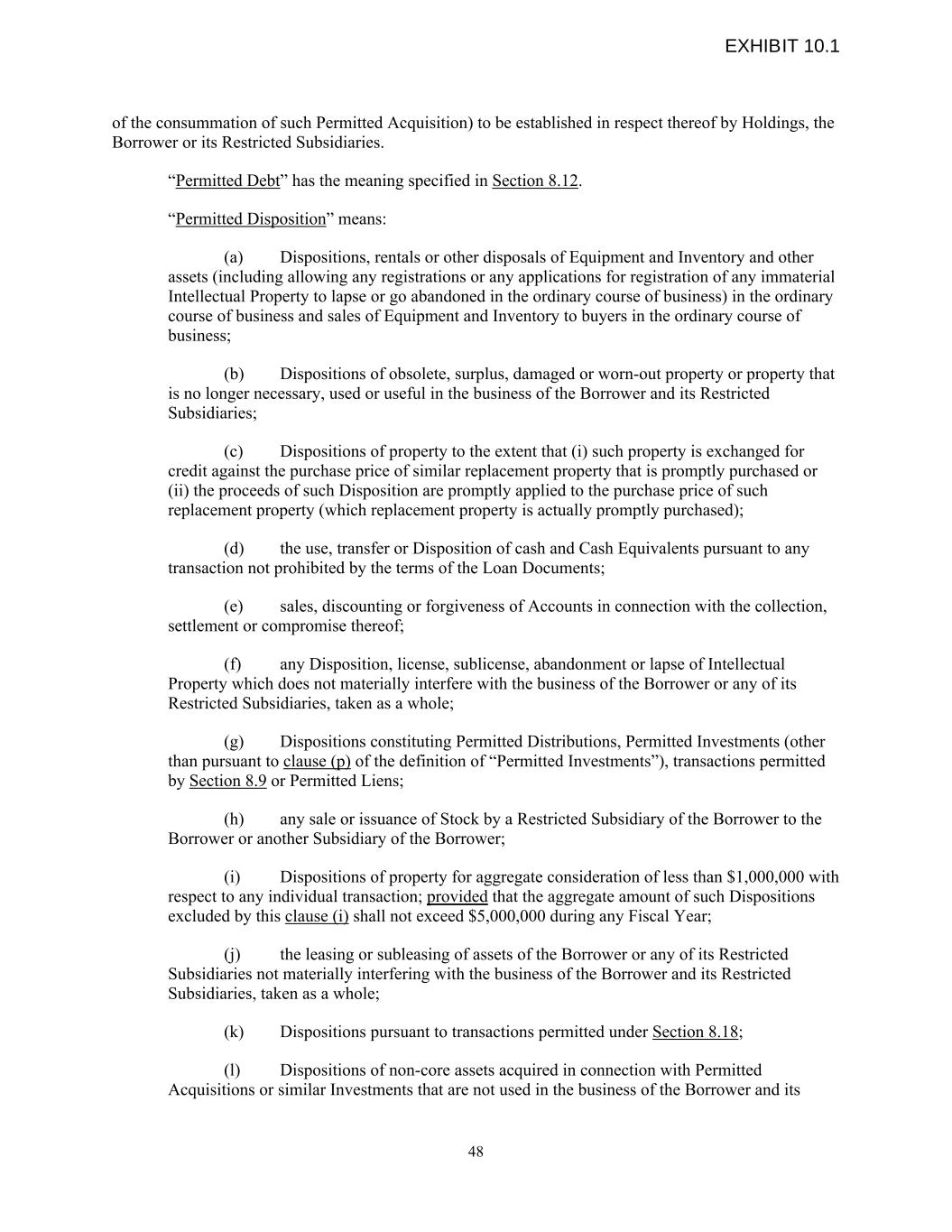 of the consummation of such Permitted Acquisition) to be established in respect thereof by Holdings, the Borrower or its Restricted Subsidiaries. “Permitted Debt” has the meaning specified in Section 8.12. “Permitted Disposition” means: (a) Dispositions, rentals or other disposals of Equipment and Inventory and other assets (including allowing any registrations or any applications for registration of any immaterial Intellectual Property to lapse or go abandoned in the ordinary course of business) in the ordinary course of business and sales of Equipment and Inventory to buyers in the ordinary course of business; (b) Dispositions of obsolete, surplus, damaged or worn-out property or property that is no longer necessary, used or useful in the business of the Borrower and its Restricted Subsidiaries; (c) Dispositions of property to the extent that (i) such property is exchanged for credit against the purchase price of similar replacement property that is promptly purchased or (ii) the proceeds of such Disposition are promptly applied to the purchase price of such replacement property (which replacement property is actually promptly purchased); (d) the use, transfer or Disposition of cash and Cash Equivalents pursuant to any transaction not prohibited by the terms of the Loan Documents; (e) sales, discounting or forgiveness of Accounts in connection with the collection, settlement or compromise thereof; (f) any Disposition, license, sublicense, abandonment or lapse of Intellectual Property which does not materially interfere with the business of the Borrower or any of its Restricted Subsidiaries, taken as a whole; (g) Dispositions constituting Permitted Distributions, Permitted Investments (other than pursuant to clause (p) of the definition of “Permitted Investments”), transactions permitted by Section 8.9 or Permitted Liens; (h) any sale or issuance of Stock by a Restricted Subsidiary of the Borrower to the Borrower or another Subsidiary of the Borrower; (i) Dispositions of property for aggregate consideration of less than $1,000,000 with respect to any individual transaction; provided that the aggregate amount of such Dispositions excluded by this clause (i) shall not exceed $5,000,000 during any Fiscal Year; (j) the leasing or subleasing of assets of the Borrower or any of its Restricted Subsidiaries not materially interfering with the business of the Borrower and its Restricted Subsidiaries, taken as a whole; (k) Dispositions pursuant to transactions permitted under Section 8.18; (l) Dispositions of non-core assets acquired in connection with Permitted Acquisitions or similar Investments that are not used in the business of the Borrower and its 48 EXHIBIT 10.1