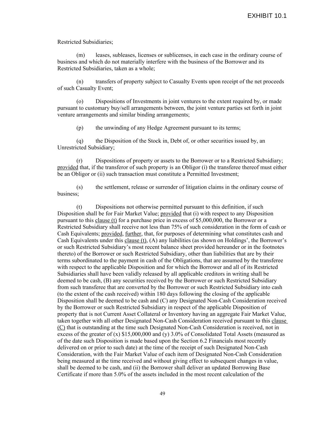 Restricted Subsidiaries; (m) leases, subleases, licenses or sublicenses, in each case in the ordinary course of business and which do not materially interfere with the business of the Borrower and its Restricted Subsidiaries, taken as a whole; (n) transfers of property subject to Casualty Events upon receipt of the net proceeds of such Casualty Event; (o) Dispositions of Investments in joint ventures to the extent required by, or made pursuant to customary buy/sell arrangements between, the joint venture parties set forth in joint venture arrangements and similar binding arrangements; (p) the unwinding of any Hedge Agreement pursuant to its terms; (q) the Disposition of the Stock in, Debt of, or other securities issued by, an Unrestricted Subsidiary; (r) Dispositions of property or assets to the Borrower or to a Restricted Subsidiary; provided that, if the transferor of such property is an Obligor (i) the transferee thereof must either be an Obligor or (ii) such transaction must constitute a Permitted Investment; (s) the settlement, release or surrender of litigation claims in the ordinary course of business; (t) Dispositions not otherwise permitted pursuant to this definition, if such Disposition shall be for Fair Market Value; provided that (i) with respect to any Disposition pursuant to this clause (t) for a purchase price in excess of $5,000,000, the Borrower or a Restricted Subsidiary shall receive not less than 75% of such consideration in the form of cash or Cash Equivalents; provided, further, that, for purposes of determining what constitutes cash and Cash Equivalents under this clause (t), (A) any liabilities (as shown on Holdings’, the Borrower’s or such Restricted Subsidiary’s most recent balance sheet provided hereunder or in the footnotes thereto) of the Borrower or such Restricted Subsidiary, other than liabilities that are by their terms subordinated to the payment in cash of the Obligations, that are assumed by the transferee with respect to the applicable Disposition and for which the Borrower and all of its Restricted Subsidiaries shall have been validly released by all applicable creditors in writing shall be deemed to be cash, (B) any securities received by the Borrower or such Restricted Subsidiary from such transferee that are converted by the Borrower or such Restricted Subsidiary into cash (to the extent of the cash received) within 180 days following the closing of the applicable Disposition shall be deemed to be cash and (C) any Designated Non-Cash Consideration received by the Borrower or such Restricted Subsidiary in respect of the applicable Disposition of property that is not Current Asset Collateral or Inventory having an aggregate Fair Market Value, taken together with all other Designated Non-Cash Consideration received pursuant to this clause (C) that is outstanding at the time such Designated Non-Cash Consideration is received, not in excess of the greater of (x) $15,000,000 and (y) 3.0% of Consolidated Total Assets (measured as of the date such Disposition is made based upon the Section 6.2 Financials most recently delivered on or prior to such date) at the time of the receipt of such Designated Non-Cash Consideration, with the Fair Market Value of each item of Designated Non-Cash Consideration being measured at the time received and without giving effect to subsequent changes in value, shall be deemed to be cash, and (ii) the Borrower shall deliver an updated Borrowing Base Certificate if more than 5.0% of the assets included in the most recent calculation of the 49 EXHIBIT 10.1