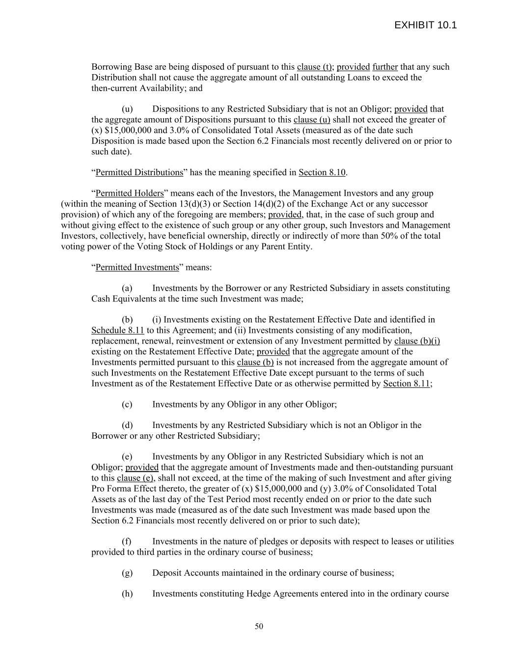 Borrowing Base are being disposed of pursuant to this clause (t); provided further that any such Distribution shall not cause the aggregate amount of all outstanding Loans to exceed the then-current Availability; and (u) Dispositions to any Restricted Subsidiary that is not an Obligor; provided that the aggregate amount of Dispositions pursuant to this clause (u) shall not exceed the greater of (x) $15,000,000 and 3.0% of Consolidated Total Assets (measured as of the date such Disposition is made based upon the Section 6.2 Financials most recently delivered on or prior to such date). “Permitted Distributions” has the meaning specified in Section 8.10. “Permitted Holders” means each of the Investors, the Management Investors and any group (within the meaning of Section 13(d)(3) or Section 14(d)(2) of the Exchange Act or any successor provision) of which any of the foregoing are members; provided, that, in the case of such group and without giving effect to the existence of such group or any other group, such Investors and Management Investors, collectively, have beneficial ownership, directly or indirectly of more than 50% of the total voting power of the Voting Stock of Holdings or any Parent Entity. “Permitted Investments” means: (a) Investments by the Borrower or any Restricted Subsidiary in assets constituting Cash Equivalents at the time such Investment was made; (b) (i) Investments existing on the Restatement Effective Date and identified in Schedule 8.11 to this Agreement; and (ii) Investments consisting of any modification, replacement, renewal, reinvestment or extension of any Investment permitted by clause (b)(i) existing on the Restatement Effective Date; provided that the aggregate amount of the Investments permitted pursuant to this clause (b) is not increased from the aggregate amount of such Investments on the Restatement Effective Date except pursuant to the terms of such Investment as of the Restatement Effective Date or as otherwise permitted by Section 8.11; (c) Investments by any Obligor in any other Obligor; (d) Investments by any Restricted Subsidiary which is not an Obligor in the Borrower or any other Restricted Subsidiary; (e) Investments by any Obligor in any Restricted Subsidiary which is not an Obligor; provided that the aggregate amount of Investments made and then-outstanding pursuant to this clause (e), shall not exceed, at the time of the making of such Investment and after giving Pro Forma Effect thereto, the greater of (x) $15,000,000 and (y) 3.0% of Consolidated Total Assets as of the last day of the Test Period most recently ended on or prior to the date such Investments was made (measured as of the date such Investment was made based upon the Section 6.2 Financials most recently delivered on or prior to such date); (f) Investments in the nature of pledges or deposits with respect to leases or utilities provided to third parties in the ordinary course of business; (g) Deposit Accounts maintained in the ordinary course of business; (h) Investments constituting Hedge Agreements entered into in the ordinary course 50 EXHIBIT 10.1