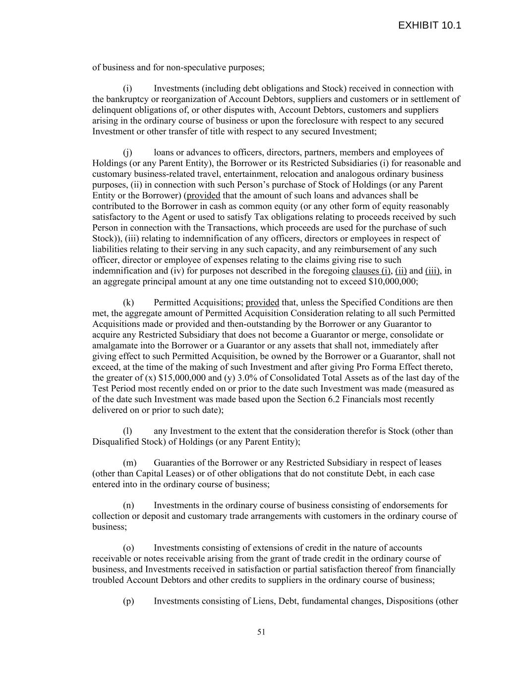 of business and for non-speculative purposes; (i) Investments (including debt obligations and Stock) received in connection with the bankruptcy or reorganization of Account Debtors, suppliers and customers or in settlement of delinquent obligations of, or other disputes with, Account Debtors, customers and suppliers arising in the ordinary course of business or upon the foreclosure with respect to any secured Investment or other transfer of title with respect to any secured Investment; (j) loans or advances to officers, directors, partners, members and employees of Holdings (or any Parent Entity), the Borrower or its Restricted Subsidiaries (i) for reasonable and customary business-related travel, entertainment, relocation and analogous ordinary business purposes, (ii) in connection with such Person’s purchase of Stock of Holdings (or any Parent Entity or the Borrower) (provided that the amount of such loans and advances shall be contributed to the Borrower in cash as common equity (or any other form of equity reasonably satisfactory to the Agent or used to satisfy Tax obligations relating to proceeds received by such Person in connection with the Transactions, which proceeds are used for the purchase of such Stock)), (iii) relating to indemnification of any officers, directors or employees in respect of liabilities relating to their serving in any such capacity, and any reimbursement of any such officer, director or employee of expenses relating to the claims giving rise to such indemnification and (iv) for purposes not described in the foregoing clauses (i), (ii) and (iii), in an aggregate principal amount at any one time outstanding not to exceed $10,000,000; (k) Permitted Acquisitions; provided that, unless the Specified Conditions are then met, the aggregate amount of Permitted Acquisition Consideration relating to all such Permitted Acquisitions made or provided and then-outstanding by the Borrower or any Guarantor to acquire any Restricted Subsidiary that does not become a Guarantor or merge, consolidate or amalgamate into the Borrower or a Guarantor or any assets that shall not, immediately after giving effect to such Permitted Acquisition, be owned by the Borrower or a Guarantor, shall not exceed, at the time of the making of such Investment and after giving Pro Forma Effect thereto, the greater of (x) $15,000,000 and (y) 3.0% of Consolidated Total Assets as of the last day of the Test Period most recently ended on or prior to the date such Investment was made (measured as of the date such Investment was made based upon the Section 6.2 Financials most recently delivered on or prior to such date); (l) any Investment to the extent that the consideration therefor is Stock (other than Disqualified Stock) of Holdings (or any Parent Entity); (m) Guaranties of the Borrower or any Restricted Subsidiary in respect of leases (other than Capital Leases) or of other obligations that do not constitute Debt, in each case entered into in the ordinary course of business; (n) Investments in the ordinary course of business consisting of endorsements for collection or deposit and customary trade arrangements with customers in the ordinary course of business; (o) Investments consisting of extensions of credit in the nature of accounts receivable or notes receivable arising from the grant of trade credit in the ordinary course of business, and Investments received in satisfaction or partial satisfaction thereof from financially troubled Account Debtors and other credits to suppliers in the ordinary course of business; (p) Investments consisting of Liens, Debt, fundamental changes, Dispositions (other 51 EXHIBIT 10.1