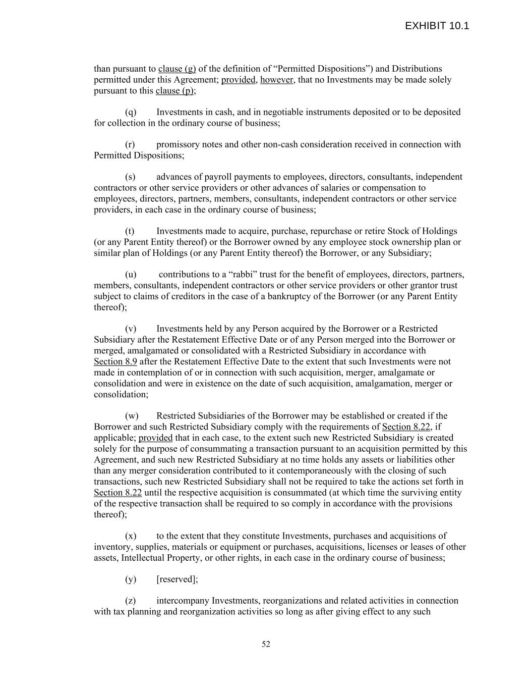 than pursuant to clause (g) of the definition of “Permitted Dispositions”) and Distributions permitted under this Agreement; provided, however, that no Investments may be made solely pursuant to this clause (p); (q) Investments in cash, and in negotiable instruments deposited or to be deposited for collection in the ordinary course of business; (r) promissory notes and other non-cash consideration received in connection with Permitted Dispositions; (s) advances of payroll payments to employees, directors, consultants, independent contractors or other service providers or other advances of salaries or compensation to employees, directors, partners, members, consultants, independent contractors or other service providers, in each case in the ordinary course of business; (t) Investments made to acquire, purchase, repurchase or retire Stock of Holdings (or any Parent Entity thereof) or the Borrower owned by any employee stock ownership plan or similar plan of Holdings (or any Parent Entity thereof) the Borrower, or any Subsidiary; (u) contributions to a “rabbi” trust for the benefit of employees, directors, partners, members, consultants, independent contractors or other service providers or other grantor trust subject to claims of creditors in the case of a bankruptcy of the Borrower (or any Parent Entity thereof); (v) Investments held by any Person acquired by the Borrower or a Restricted Subsidiary after the Restatement Effective Date or of any Person merged into the Borrower or merged, amalgamated or consolidated with a Restricted Subsidiary in accordance with Section 8.9 after the Restatement Effective Date to the extent that such Investments were not made in contemplation of or in connection with such acquisition, merger, amalgamate or consolidation and were in existence on the date of such acquisition, amalgamation, merger or consolidation; (w) Restricted Subsidiaries of the Borrower may be established or created if the Borrower and such Restricted Subsidiary comply with the requirements of Section 8.22, if applicable; provided that in each case, to the extent such new Restricted Subsidiary is created solely for the purpose of consummating a transaction pursuant to an acquisition permitted by this Agreement, and such new Restricted Subsidiary at no time holds any assets or liabilities other than any merger consideration contributed to it contemporaneously with the closing of such transactions, such new Restricted Subsidiary shall not be required to take the actions set forth in Section 8.22 until the respective acquisition is consummated (at which time the surviving entity of the respective transaction shall be required to so comply in accordance with the provisions thereof); (x) to the extent that they constitute Investments, purchases and acquisitions of inventory, supplies, materials or equipment or purchases, acquisitions, licenses or leases of other assets, Intellectual Property, or other rights, in each case in the ordinary course of business; (y) [reserved]; (z) intercompany Investments, reorganizations and related activities in connection with tax planning and reorganization activities so long as after giving effect to any such 52 EXHIBIT 10.1