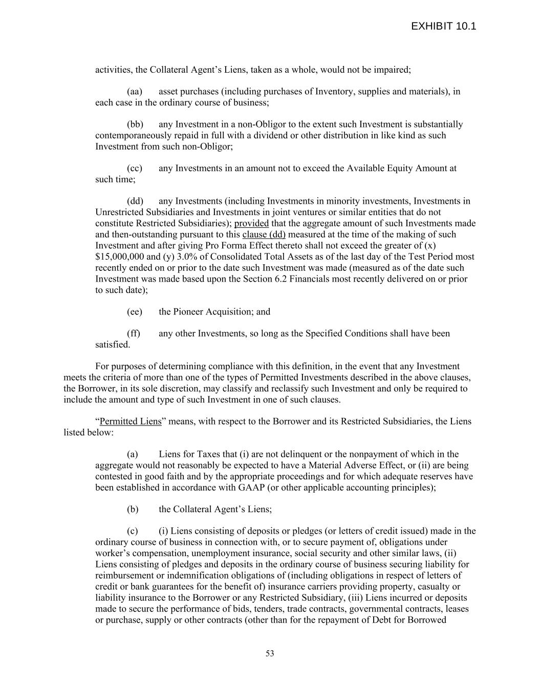 activities, the Collateral Agent’s Liens, taken as a whole, would not be impaired; (aa) asset purchases (including purchases of Inventory, supplies and materials), in each case in the ordinary course of business; (bb) any Investment in a non-Obligor to the extent such Investment is substantially contemporaneously repaid in full with a dividend or other distribution in like kind as such Investment from such non-Obligor; (cc) any Investments in an amount not to exceed the Available Equity Amount at such time; (dd) any Investments (including Investments in minority investments, Investments in Unrestricted Subsidiaries and Investments in joint ventures or similar entities that do not constitute Restricted Subsidiaries); provided that the aggregate amount of such Investments made and then-outstanding pursuant to this clause (dd) measured at the time of the making of such Investment and after giving Pro Forma Effect thereto shall not exceed the greater of (x) $15,000,000 and (y) 3.0% of Consolidated Total Assets as of the last day of the Test Period most recently ended on or prior to the date such Investment was made (measured as of the date such Investment was made based upon the Section 6.2 Financials most recently delivered on or prior to such date); (ee) the Pioneer Acquisition; and (ff) any other Investments, so long as the Specified Conditions shall have been satisfied. For purposes of determining compliance with this definition, in the event that any Investment meets the criteria of more than one of the types of Permitted Investments described in the above clauses, the Borrower, in its sole discretion, may classify and reclassify such Investment and only be required to include the amount and type of such Investment in one of such clauses. “Permitted Liens” means, with respect to the Borrower and its Restricted Subsidiaries, the Liens listed below: (a) Liens for Taxes that (i) are not delinquent or the nonpayment of which in the aggregate would not reasonably be expected to have a Material Adverse Effect, or (ii) are being contested in good faith and by the appropriate proceedings and for which adequate reserves have been established in accordance with GAAP (or other applicable accounting principles); (b) the Collateral Agent’s Liens; (c) (i) Liens consisting of deposits or pledges (or letters of credit issued) made in the ordinary course of business in connection with, or to secure payment of, obligations under worker’s compensation, unemployment insurance, social security and other similar laws, (ii) Liens consisting of pledges and deposits in the ordinary course of business securing liability for reimbursement or indemnification obligations of (including obligations in respect of letters of credit or bank guarantees for the benefit of) insurance carriers providing property, casualty or liability insurance to the Borrower or any Restricted Subsidiary, (iii) Liens incurred or deposits made to secure the performance of bids, tenders, trade contracts, governmental contracts, leases or purchase, supply or other contracts (other than for the repayment of Debt for Borrowed 53 EXHIBIT 10.1
