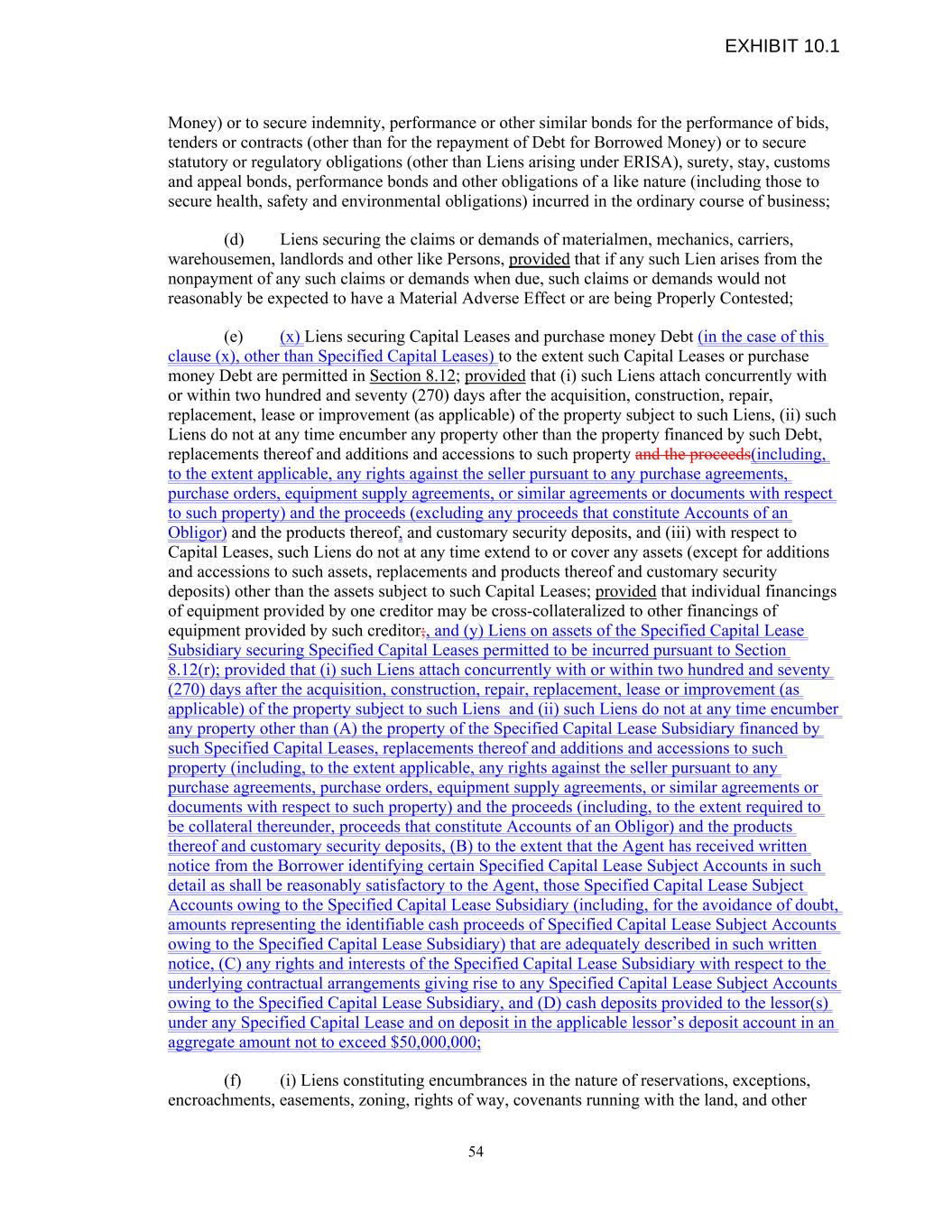 Money) or to secure indemnity, performance or other similar bonds for the performance of bids, tenders or contracts (other than for the repayment of Debt for Borrowed Money) or to secure statutory or regulatory obligations (other than Liens arising under ERISA), surety, stay, customs and appeal bonds, performance bonds and other obligations of a like nature (including those to secure health, safety and environmental obligations) incurred in the ordinary course of business; (d) Liens securing the claims or demands of materialmen, mechanics, carriers, warehousemen, landlords and other like Persons, provided that if any such Lien arises from the nonpayment of any such claims or demands when due, such claims or demands would not reasonably be expected to have a Material Adverse Effect or are being Properly Contested; (e) (x) Liens securing Capital Leases and purchase money Debt (in the case of this clause (x), other than Specified Capital Leases) to the extent such Capital Leases or purchase money Debt are permitted in Section 8.12; provided that (i) such Liens attach concurrently with or within two hundred and seventy (270) days after the acquisition, construction, repair, replacement, lease or improvement (as applicable) of the property subject to such Liens, (ii) such Liens do not at any time encumber any property other than the property financed by such Debt, replacements thereof and additions and accessions to such property and the proceeds(including, to the extent applicable, any rights against the seller pursuant to any purchase agreements, purchase orders, equipment supply agreements, or similar agreements or documents with respect to such property) and the proceeds (excluding any proceeds that constitute Accounts of an Obligor) and the products thereof, and customary security deposits, and (iii) with respect to Capital Leases, such Liens do not at any time extend to or cover any assets (except for additions and accessions to such assets, replacements and products thereof and customary security deposits) other than the assets subject to such Capital Leases; provided that individual financings of equipment provided by one creditor may be cross-collateralized to other financings of equipment provided by such creditor;, and (y) Liens on assets of the Specified Capital Lease Subsidiary securing Specified Capital Leases permitted to be incurred pursuant to Section 8.12(r); provided that (i) such Liens attach concurrently with or within two hundred and seventy (270) days after the acquisition, construction, repair, replacement, lease or improvement (as applicable) of the property subject to such Liens and (ii) such Liens do not at any time encumber any property other than (A) the property of the Specified Capital Lease Subsidiary financed by such Specified Capital Leases, replacements thereof and additions and accessions to such property (including, to the extent applicable, any rights against the seller pursuant to any purchase agreements, purchase orders, equipment supply agreements, or similar agreements or documents with respect to such property) and the proceeds (including, to the extent required to be collateral thereunder, proceeds that constitute Accounts of an Obligor) and the products thereof and customary security deposits, (B) to the extent that the Agent has received written notice from the Borrower identifying certain Specified Capital Lease Subject Accounts in such detail as shall be reasonably satisfactory to the Agent, those Specified Capital Lease Subject Accounts owing to the Specified Capital Lease Subsidiary (including, for the avoidance of doubt, amounts representing the identifiable cash proceeds of Specified Capital Lease Subject Accounts owing to the Specified Capital Lease Subsidiary) that are adequately described in such written notice, (C) any rights and interests of the Specified Capital Lease Subsidiary with respect to the underlying contractual arrangements giving rise to any Specified Capital Lease Subject Accounts owing to the Specified Capital Lease Subsidiary, and (D) cash deposits provided to the lessor(s) under any Specified Capital Lease and on deposit in the applicable lessor’s deposit account in an aggregate amount not to exceed $50,000,000; (f) (i) Liens constituting encumbrances in the nature of reservations, exceptions, encroachments, easements, zoning, rights of way, covenants running with the land, and other 54 EXHIBIT 10.1