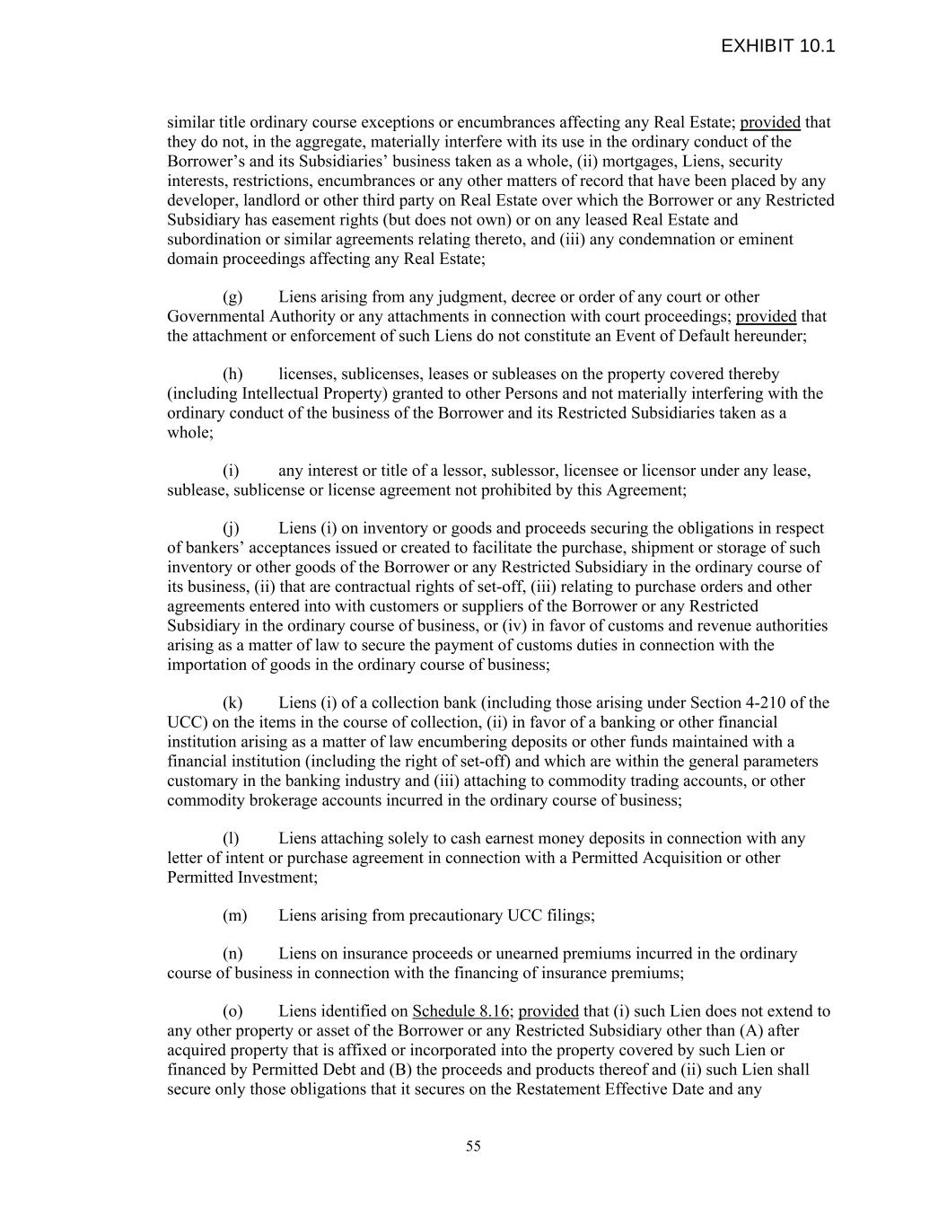 similar title ordinary course exceptions or encumbrances affecting any Real Estate; provided that they do not, in the aggregate, materially interfere with its use in the ordinary conduct of the Borrower’s and its Subsidiaries’ business taken as a whole, (ii) mortgages, Liens, security interests, restrictions, encumbrances or any other matters of record that have been placed by any developer, landlord or other third party on Real Estate over which the Borrower or any Restricted Subsidiary has easement rights (but does not own) or on any leased Real Estate and subordination or similar agreements relating thereto, and (iii) any condemnation or eminent domain proceedings affecting any Real Estate; (g) Liens arising from any judgment, decree or order of any court or other Governmental Authority or any attachments in connection with court proceedings; provided that the attachment or enforcement of such Liens do not constitute an Event of Default hereunder; (h) licenses, sublicenses, leases or subleases on the property covered thereby (including Intellectual Property) granted to other Persons and not materially interfering with the ordinary conduct of the business of the Borrower and its Restricted Subsidiaries taken as a whole; (i) any interest or title of a lessor, sublessor, licensee or licensor under any lease, sublease, sublicense or license agreement not prohibited by this Agreement; (j) Liens (i) on inventory or goods and proceeds securing the obligations in respect of bankers’ acceptances issued or created to facilitate the purchase, shipment or storage of such inventory or other goods of the Borrower or any Restricted Subsidiary in the ordinary course of its business, (ii) that are contractual rights of set-off, (iii) relating to purchase orders and other agreements entered into with customers or suppliers of the Borrower or any Restricted Subsidiary in the ordinary course of business, or (iv) in favor of customs and revenue authorities arising as a matter of law to secure the payment of customs duties in connection with the importation of goods in the ordinary course of business; (k) Liens (i) of a collection bank (including those arising under Section 4-210 of the UCC) on the items in the course of collection, (ii) in favor of a banking or other financial institution arising as a matter of law encumbering deposits or other funds maintained with a financial institution (including the right of set-off) and which are within the general parameters customary in the banking industry and (iii) attaching to commodity trading accounts, or other commodity brokerage accounts incurred in the ordinary course of business; (l) Liens attaching solely to cash earnest money deposits in connection with any letter of intent or purchase agreement in connection with a Permitted Acquisition or other Permitted Investment; (m) Liens arising from precautionary UCC filings; (n) Liens on insurance proceeds or unearned premiums incurred in the ordinary course of business in connection with the financing of insurance premiums; (o) Liens identified on Schedule 8.16; provided that (i) such Lien does not extend to any other property or asset of the Borrower or any Restricted Subsidiary other than (A) after acquired property that is affixed or incorporated into the property covered by such Lien or financed by Permitted Debt and (B) the proceeds and products thereof and (ii) such Lien shall secure only those obligations that it secures on the Restatement Effective Date and any 55 EXHIBIT 10.1