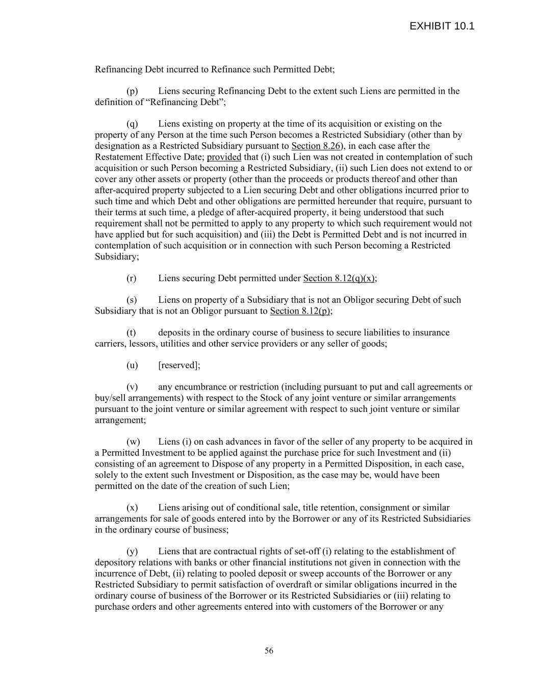 Refinancing Debt incurred to Refinance such Permitted Debt; (p) Liens securing Refinancing Debt to the extent such Liens are permitted in the definition of “Refinancing Debt”; (q) Liens existing on property at the time of its acquisition or existing on the property of any Person at the time such Person becomes a Restricted Subsidiary (other than by designation as a Restricted Subsidiary pursuant to Section 8.26), in each case after the Restatement Effective Date; provided that (i) such Lien was not created in contemplation of such acquisition or such Person becoming a Restricted Subsidiary, (ii) such Lien does not extend to or cover any other assets or property (other than the proceeds or products thereof and other than after-acquired property subjected to a Lien securing Debt and other obligations incurred prior to such time and which Debt and other obligations are permitted hereunder that require, pursuant to their terms at such time, a pledge of after-acquired property, it being understood that such requirement shall not be permitted to apply to any property to which such requirement would not have applied but for such acquisition) and (iii) the Debt is Permitted Debt and is not incurred in contemplation of such acquisition or in connection with such Person becoming a Restricted Subsidiary; (r) Liens securing Debt permitted under Section 8.12(q)(x); (s) Liens on property of a Subsidiary that is not an Obligor securing Debt of such Subsidiary that is not an Obligor pursuant to Section 8.12(p); (t) deposits in the ordinary course of business to secure liabilities to insurance carriers, lessors, utilities and other service providers or any seller of goods; (u) [reserved]; (v) any encumbrance or restriction (including pursuant to put and call agreements or buy/sell arrangements) with respect to the Stock of any joint venture or similar arrangements pursuant to the joint venture or similar agreement with respect to such joint venture or similar arrangement; (w) Liens (i) on cash advances in favor of the seller of any property to be acquired in a Permitted Investment to be applied against the purchase price for such Investment and (ii) consisting of an agreement to Dispose of any property in a Permitted Disposition, in each case, solely to the extent such Investment or Disposition, as the case may be, would have been permitted on the date of the creation of such Lien; (x) Liens arising out of conditional sale, title retention, consignment or similar arrangements for sale of goods entered into by the Borrower or any of its Restricted Subsidiaries in the ordinary course of business; (y) Liens that are contractual rights of set-off (i) relating to the establishment of depository relations with banks or other financial institutions not given in connection with the incurrence of Debt, (ii) relating to pooled deposit or sweep accounts of the Borrower or any Restricted Subsidiary to permit satisfaction of overdraft or similar obligations incurred in the ordinary course of business of the Borrower or its Restricted Subsidiaries or (iii) relating to purchase orders and other agreements entered into with customers of the Borrower or any 56 EXHIBIT 10.1