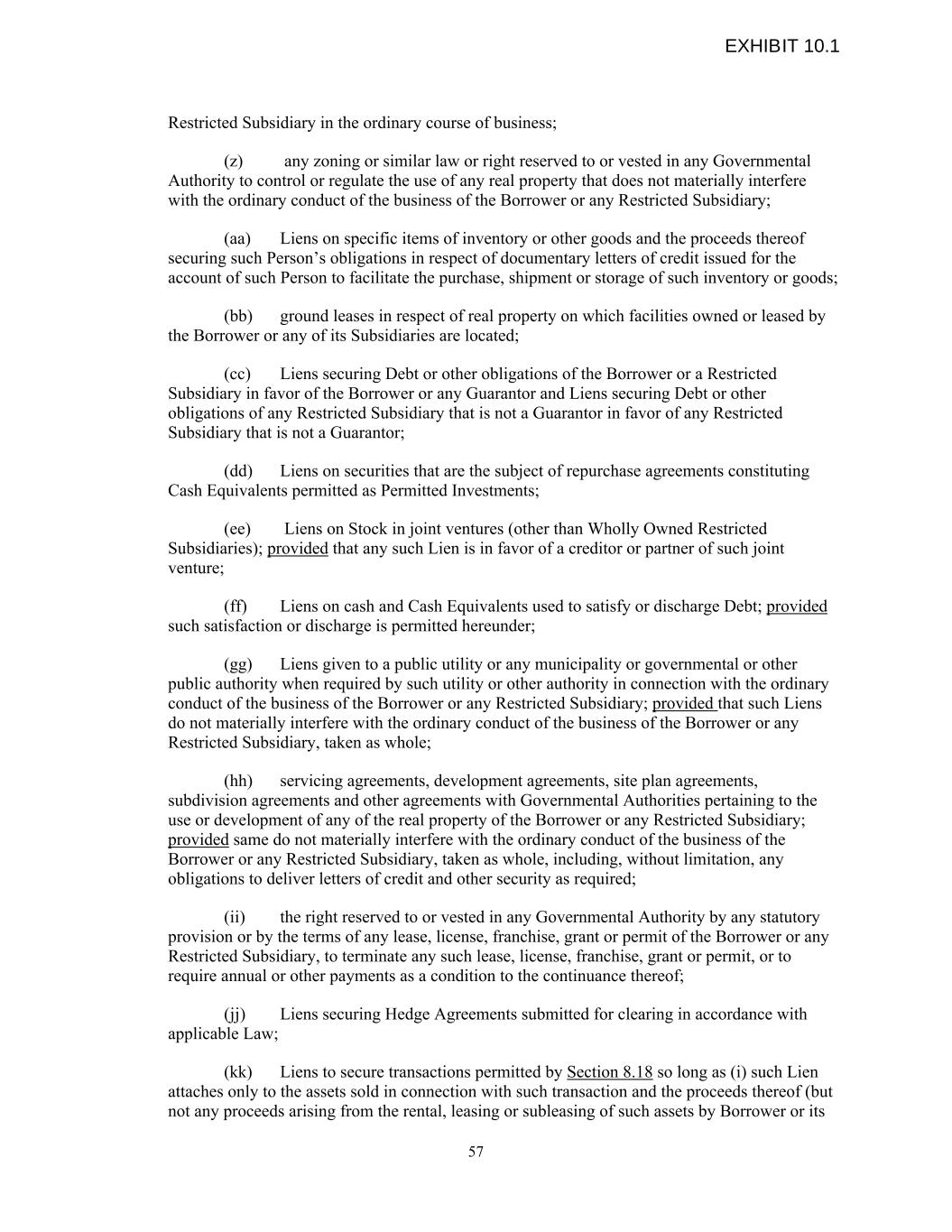 Restricted Subsidiary in the ordinary course of business; (z) any zoning or similar law or right reserved to or vested in any Governmental Authority to control or regulate the use of any real property that does not materially interfere with the ordinary conduct of the business of the Borrower or any Restricted Subsidiary; (aa) Liens on specific items of inventory or other goods and the proceeds thereof securing such Person’s obligations in respect of documentary letters of credit issued for the account of such Person to facilitate the purchase, shipment or storage of such inventory or goods; (bb) ground leases in respect of real property on which facilities owned or leased by the Borrower or any of its Subsidiaries are located; (cc) Liens securing Debt or other obligations of the Borrower or a Restricted Subsidiary in favor of the Borrower or any Guarantor and Liens securing Debt or other obligations of any Restricted Subsidiary that is not a Guarantor in favor of any Restricted Subsidiary that is not a Guarantor; (dd) Liens on securities that are the subject of repurchase agreements constituting Cash Equivalents permitted as Permitted Investments; (ee) Liens on Stock in joint ventures (other than Wholly Owned Restricted Subsidiaries); provided that any such Lien is in favor of a creditor or partner of such joint venture; (ff) Liens on cash and Cash Equivalents used to satisfy or discharge Debt; provided such satisfaction or discharge is permitted hereunder; (gg) Liens given to a public utility or any municipality or governmental or other public authority when required by such utility or other authority in connection with the ordinary conduct of the business of the Borrower or any Restricted Subsidiary; provided that such Liens do not materially interfere with the ordinary conduct of the business of the Borrower or any Restricted Subsidiary, taken as whole; (hh) servicing agreements, development agreements, site plan agreements, subdivision agreements and other agreements with Governmental Authorities pertaining to the use or development of any of the real property of the Borrower or any Restricted Subsidiary; provided same do not materially interfere with the ordinary conduct of the business of the Borrower or any Restricted Subsidiary, taken as whole, including, without limitation, any obligations to deliver letters of credit and other security as required; (ii) the right reserved to or vested in any Governmental Authority by any statutory provision or by the terms of any lease, license, franchise, grant or permit of the Borrower or any Restricted Subsidiary, to terminate any such lease, license, franchise, grant or permit, or to require annual or other payments as a condition to the continuance thereof; (jj) Liens securing Hedge Agreements submitted for clearing in accordance with applicable Law; (kk) Liens to secure transactions permitted by Section 8.18 so long as (i) such Lien attaches only to the assets sold in connection with such transaction and the proceeds thereof (but not any proceeds arising from the rental, leasing or subleasing of such assets by Borrower or its 57 EXHIBIT 10.1
